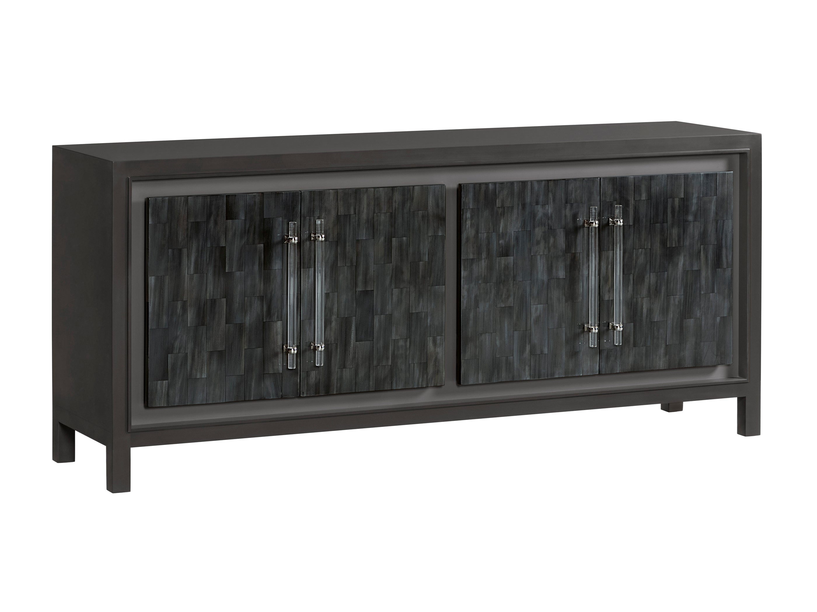 Faux horn motif hand-painted by artists on individual resin tiles in a dark gray bone coloration with custom acrylic hardware and bright nickel finished clasps located on the four doors which hide four adjustable shelves and a ventilated back. Faux horn tiles will vary in appearance and coloration from piece to piece. , SIGNATURE DESIGNS ,