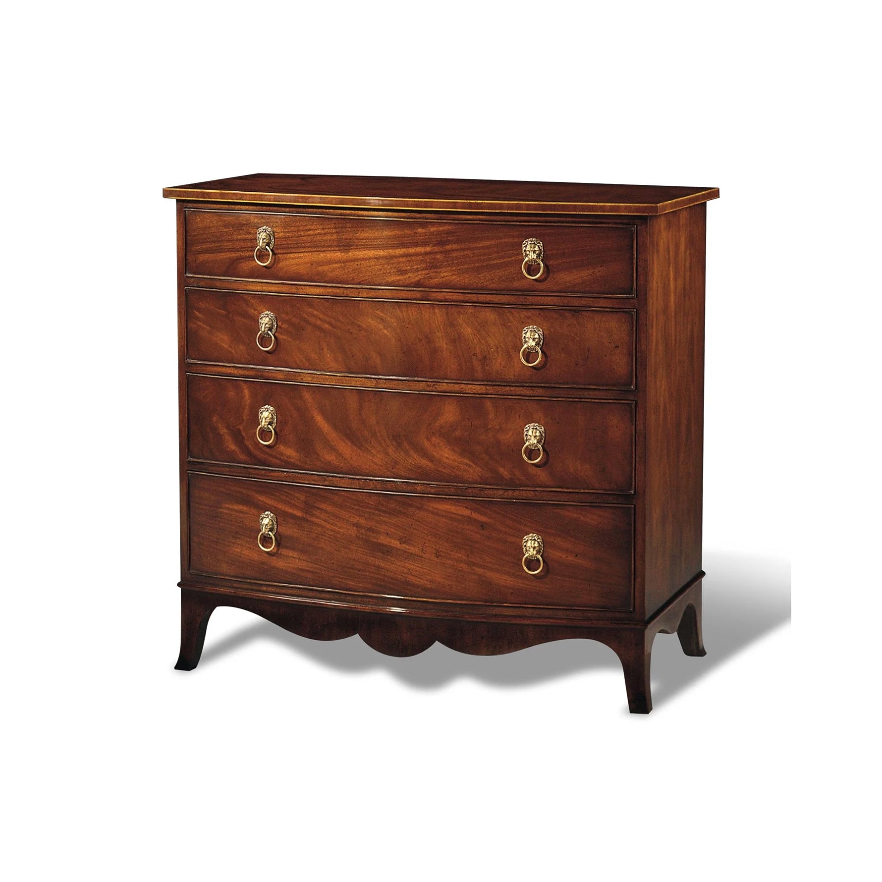 Crotch Mahogany Bowfront chest with Brass handles and four drawers.