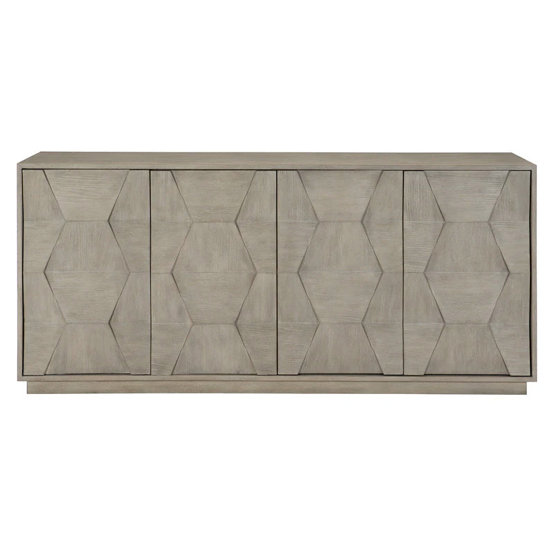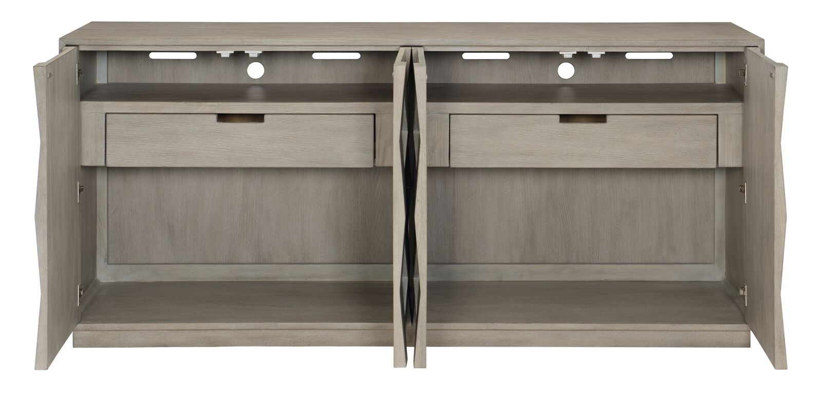 The Bernhardt Linea collection artfully blends the natural elements of rustic design with clean lines and casual but luxurious finishes. This four-door buffet is faced with three-dimensional fancy-face cerused oak veneers and is set on a delicate streamlined plinth base. Clean-lined and casual, it contributes a welcome warmth to any dining room.