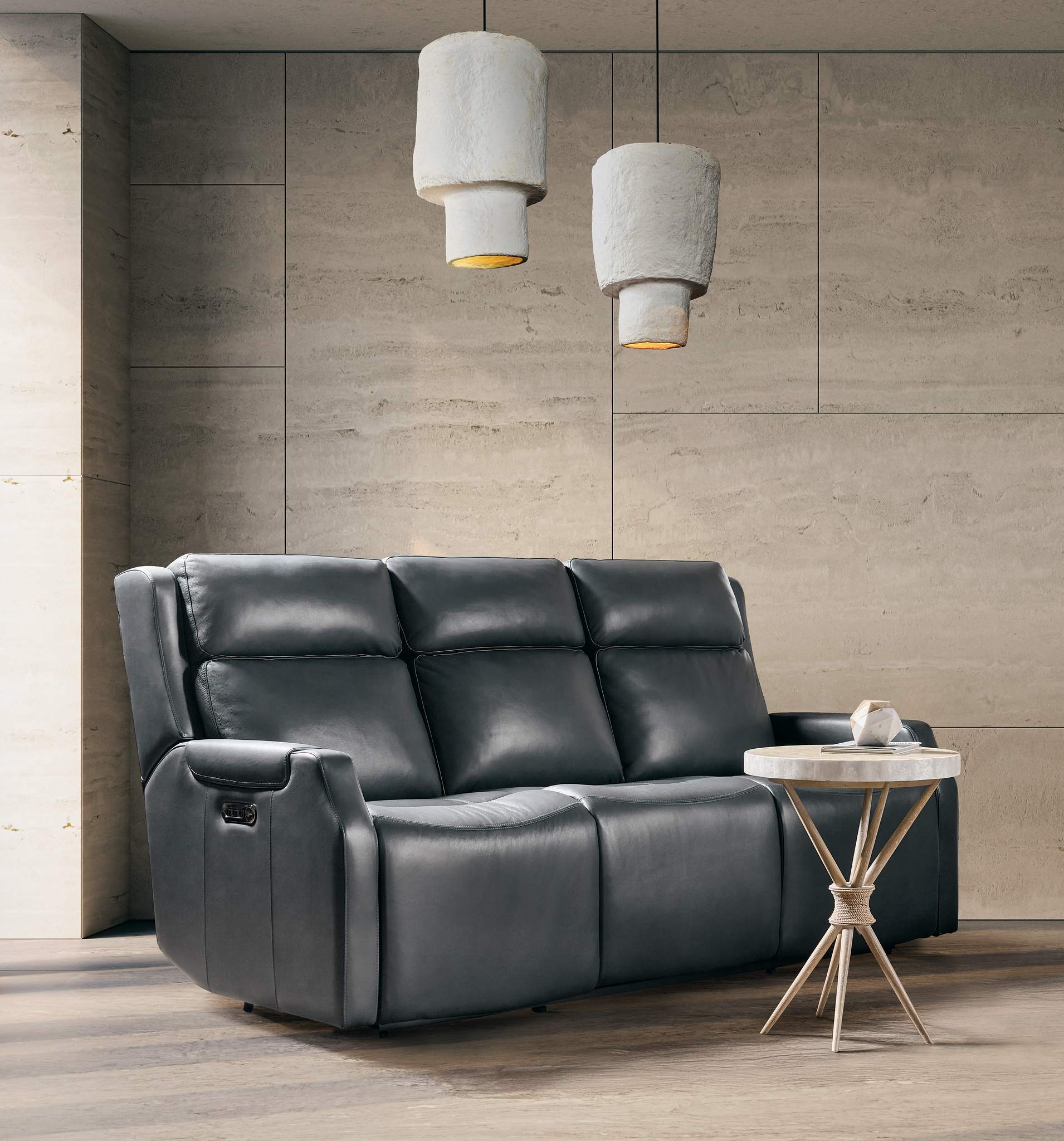 The Nelson Zero Gravity Power Sofa brings luxurious comfort with its zero-gravity recline, power headrests, and lumbar support. Upholstered in Salvo Denim Finished Top Grain leather, this sofa is designed for modern living with clean lines and a refined aesthetic. It also features a USB and USB-C port for added functionality. The soft denim blue leather adds a stylish touch to any living room.