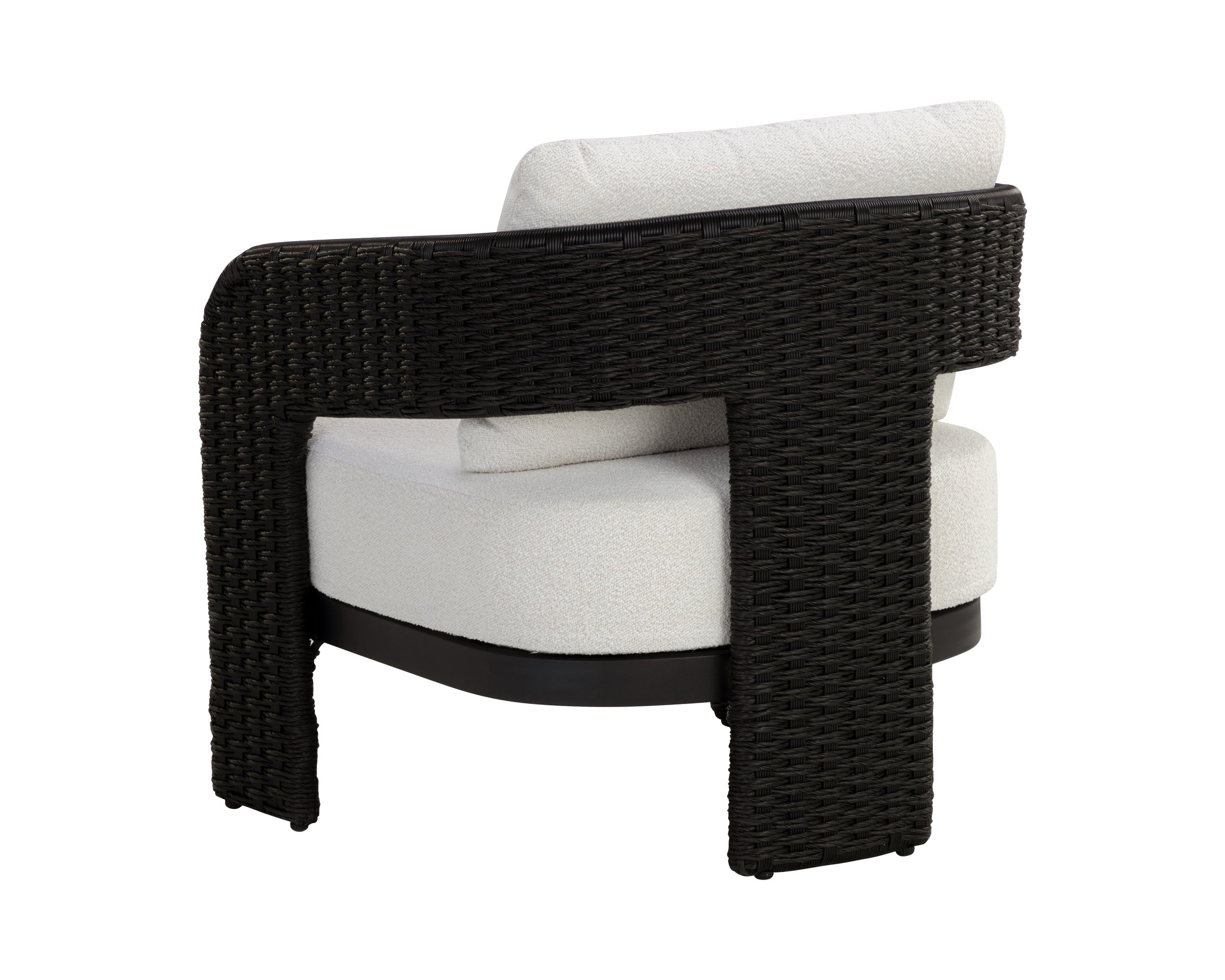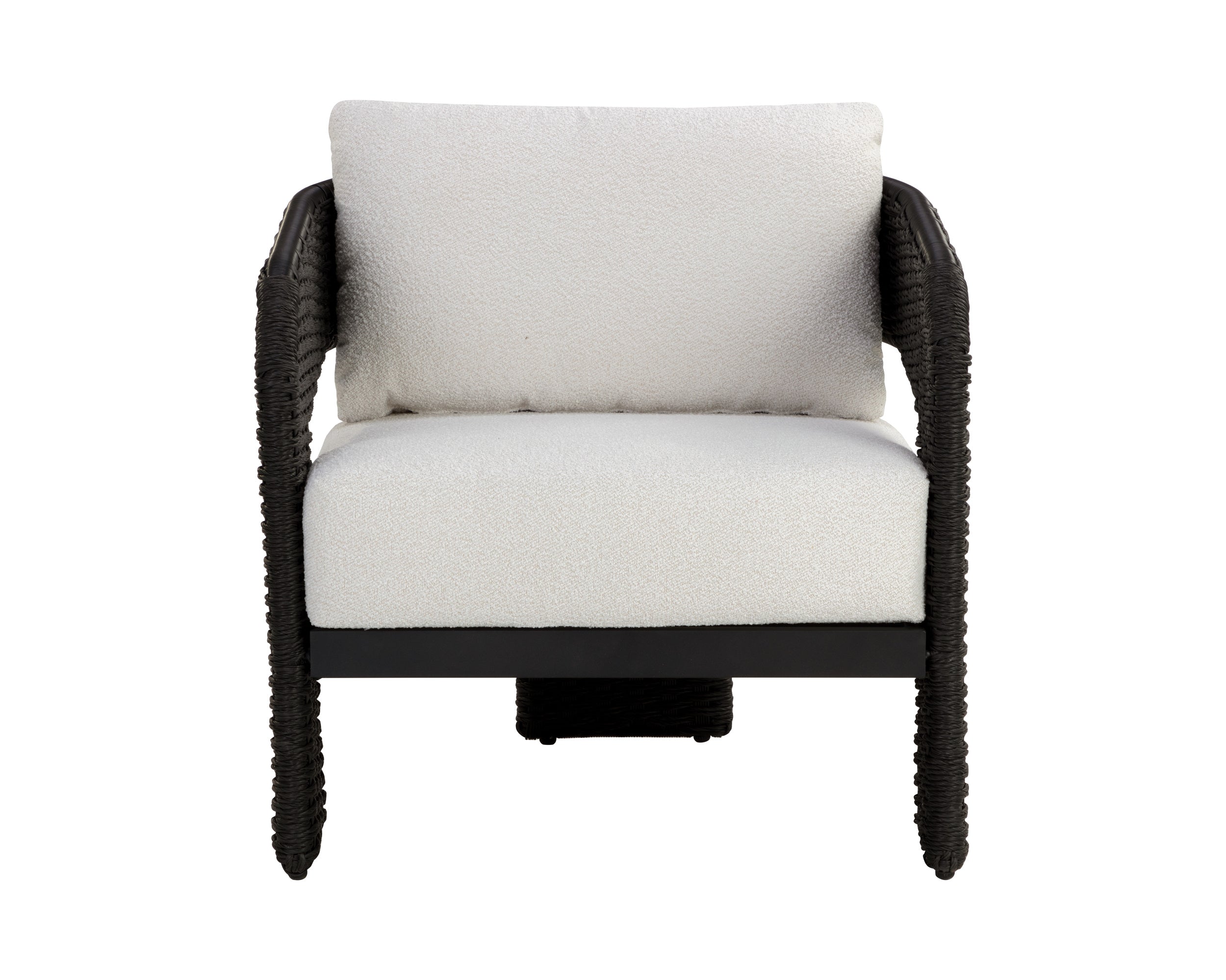 The geometric curves of the Pylos Lounge Chair will effortlessly stand out in any outdoor area. Black twisted wicker wraps around an aluminum frame for a defined, textured look. Soft cushioning in our louis cream outdoor boucle performance fabric ties the look together.