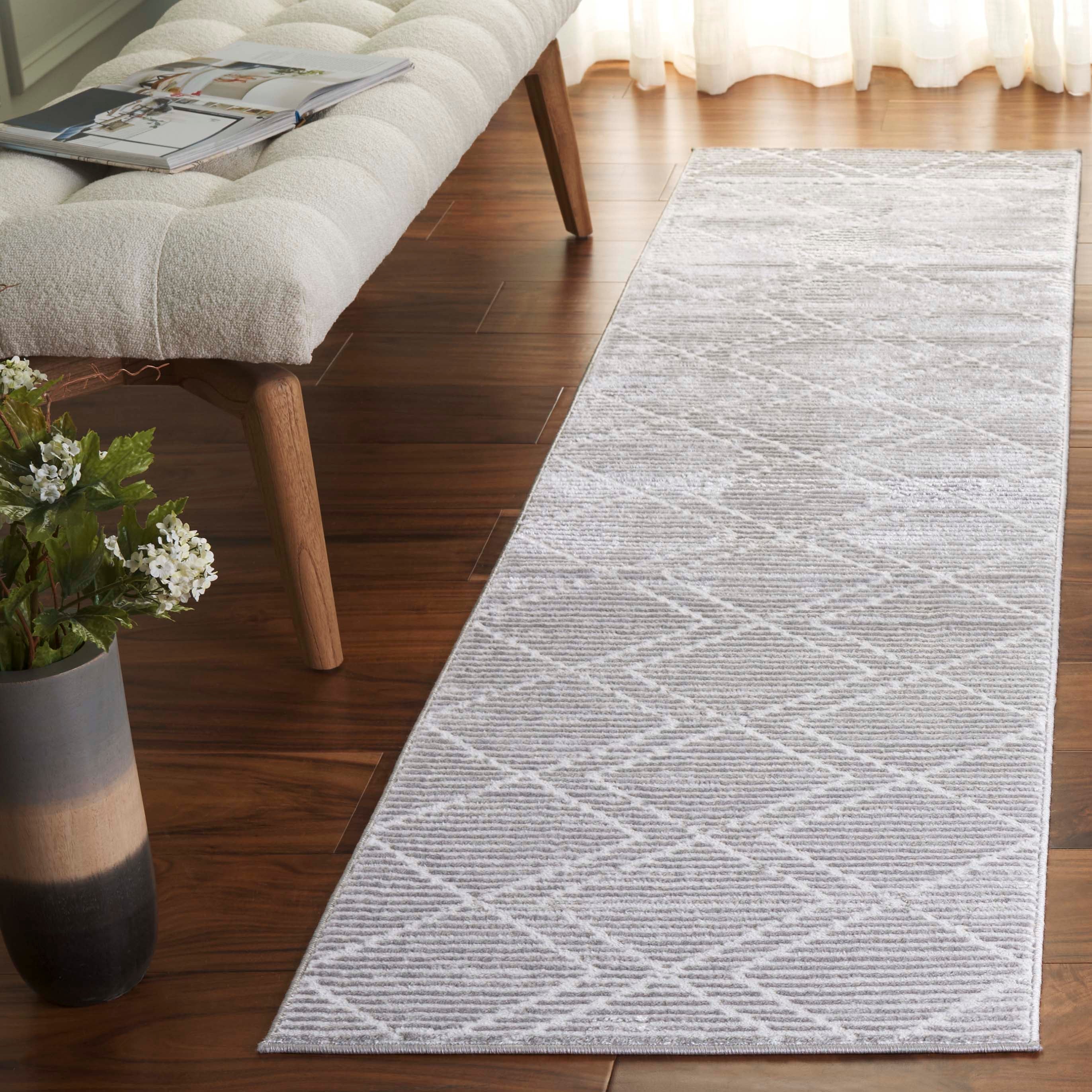 The distinguished pattern of this rug features a subtle geometric diamond motif, lending an air of understated elegance and a touch of modernity, perfect for a variety of settings from hallways to bedrooms.