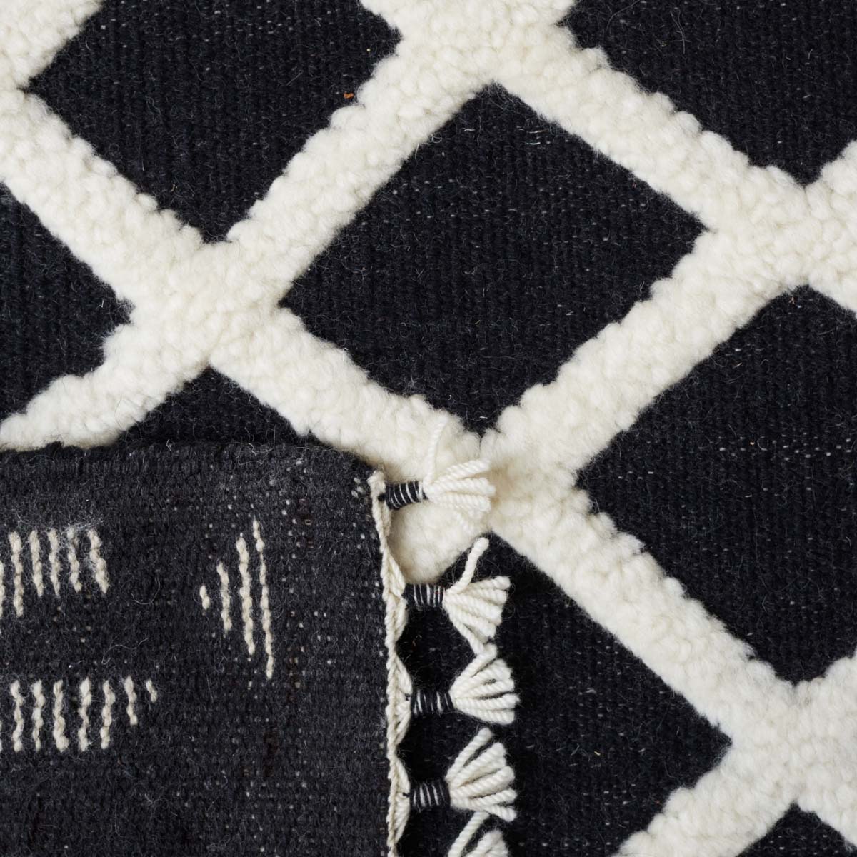Enhance your living space with this stunning hand-knotted wool area rug, a perfect fusion of traditional craftsmanship and contemporary design. Sized at a versatile 4' x 6', this rug features a bold and dynamic pattern in a chic black and ivory color palette that will add sophistication and a timeless aesthetic to any room.