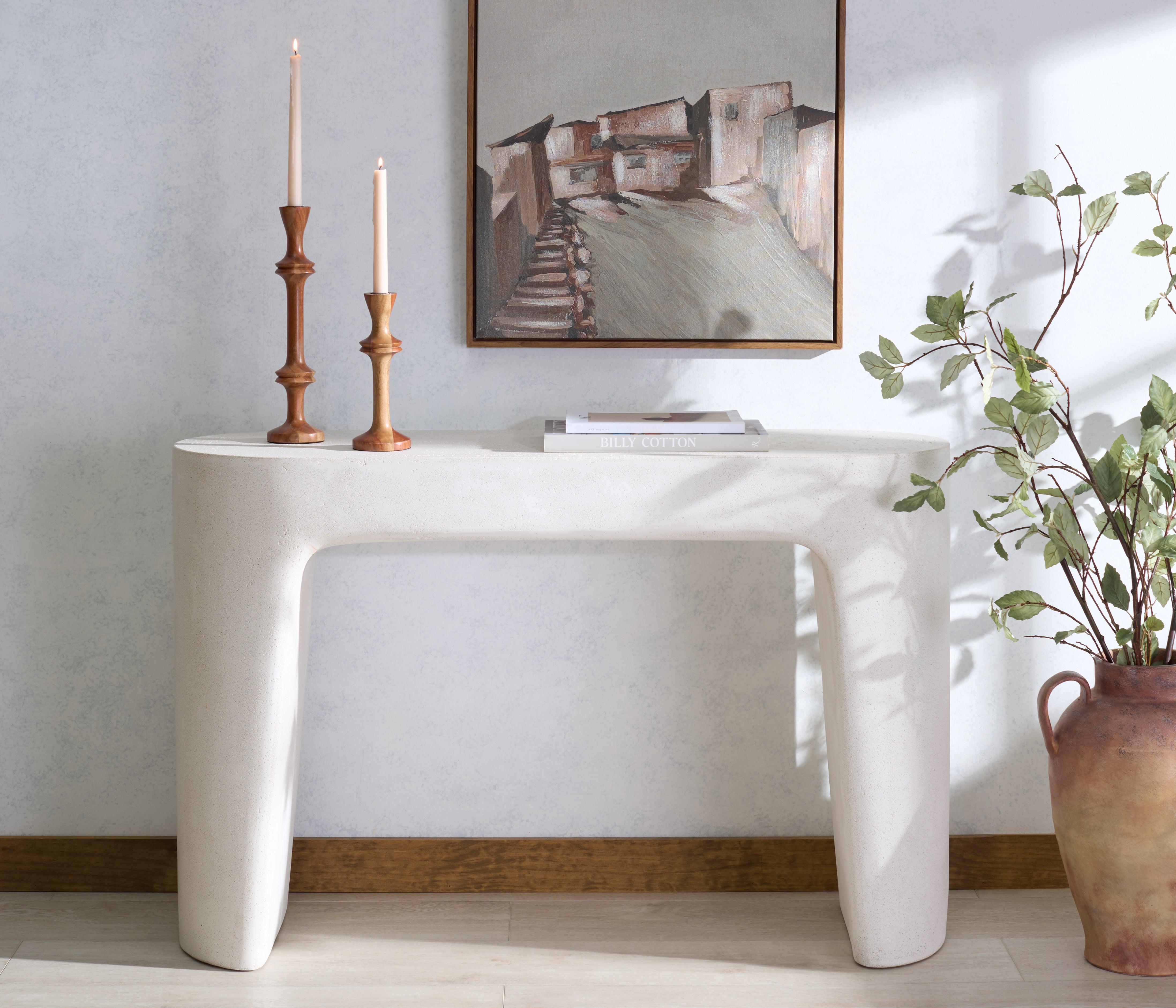 Introducing the Tolbert Concrete Console Table in elegant Ivory color. This table has been precision-molded and the classy tone of Ivory has been blended in with the casting process itself. The sturdy construction using Cast GFRC Concrete provides this table with a remarkable level of durability. This concrete console table boasts a sleek silhouette that would complement a wide range of contemporary interior styles. Its multifunctional design allows it to be used in an array of different spaces within your home. Expect functionality fused with a minimalist style from the Tolbert Concrete Console Table, the perfect addition to any modern living space.