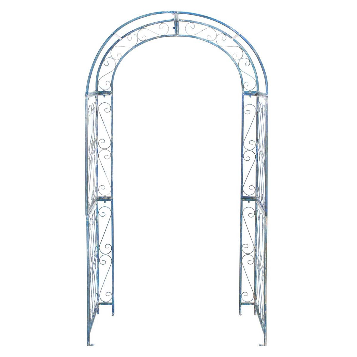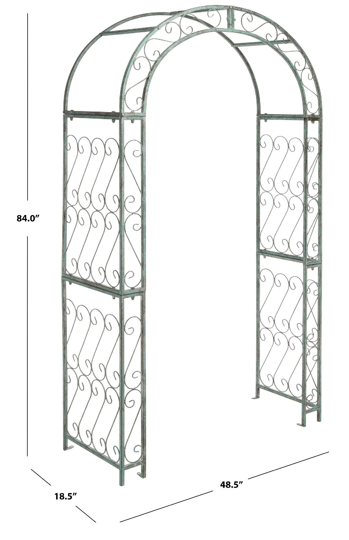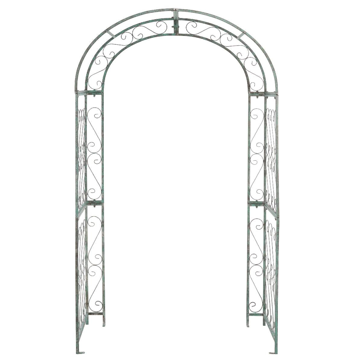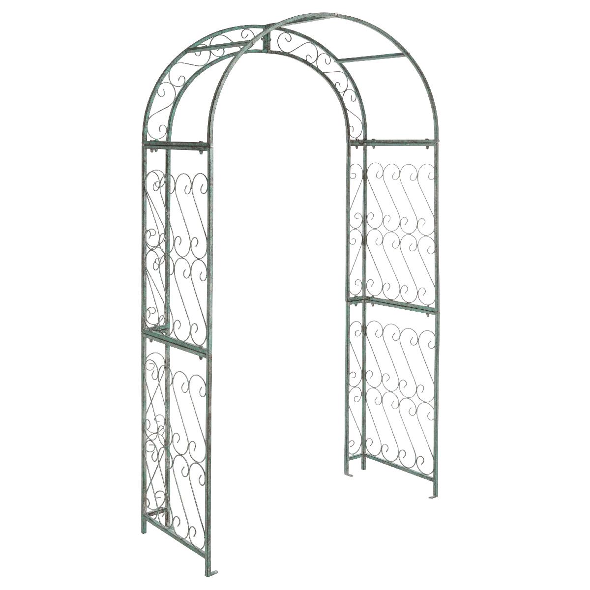 This enchanting outdoor arch conjures images of the entrance to a secret garden, the antique trellises scented with the blossoms of climbing roses. Victorian filigree makes this masterpiece of ironwork as elegant in winter as it is during the peak flowering months of summer.