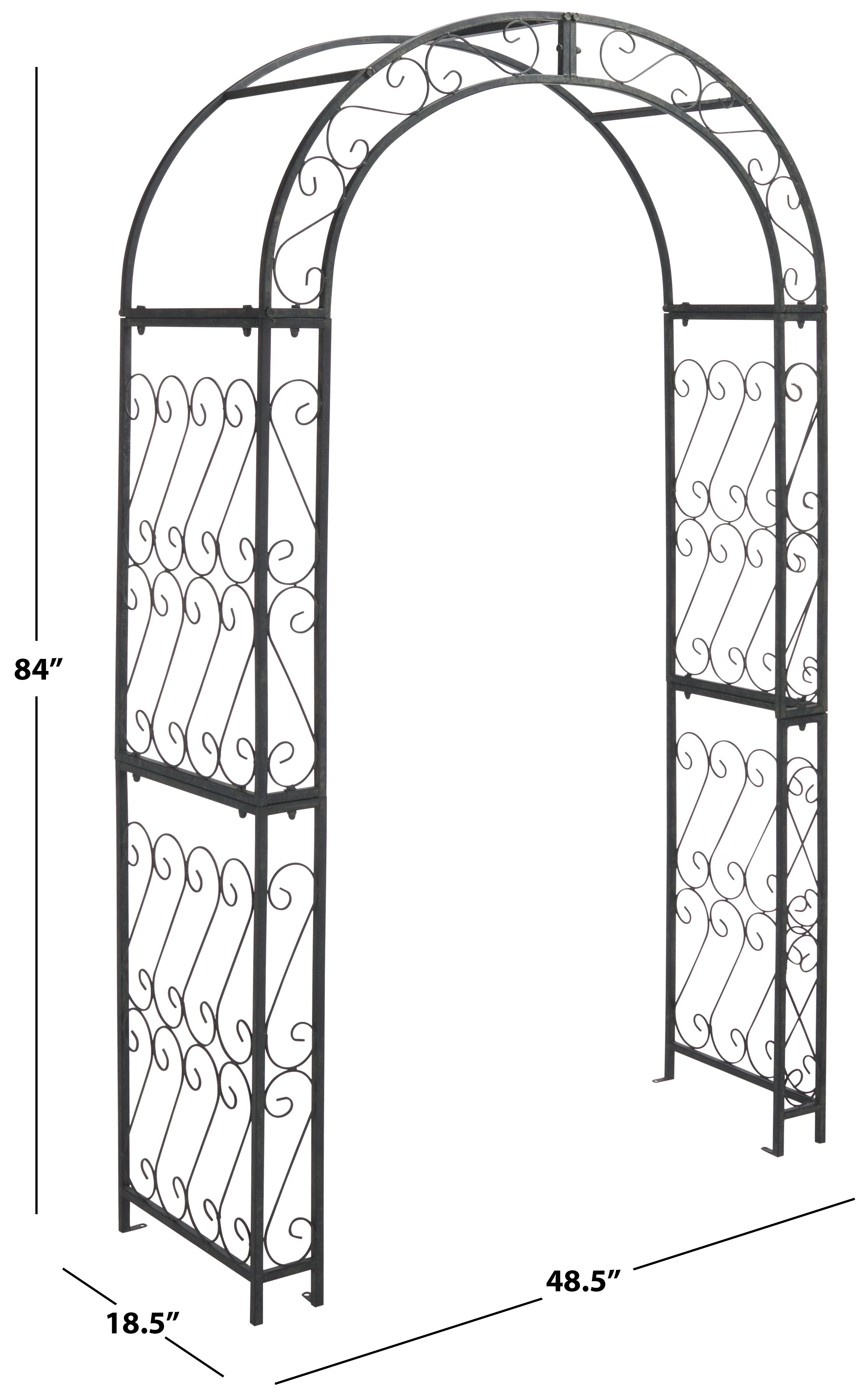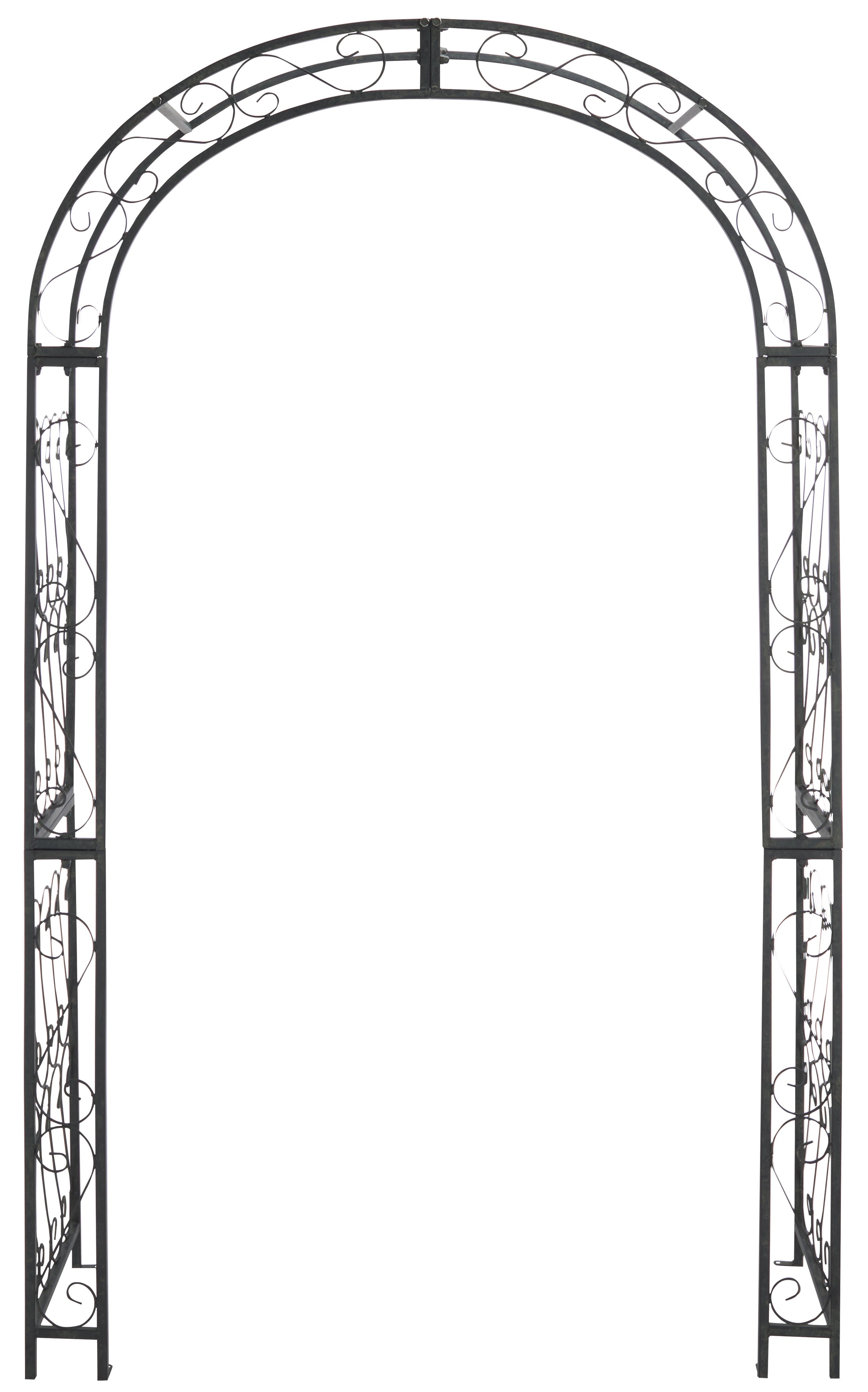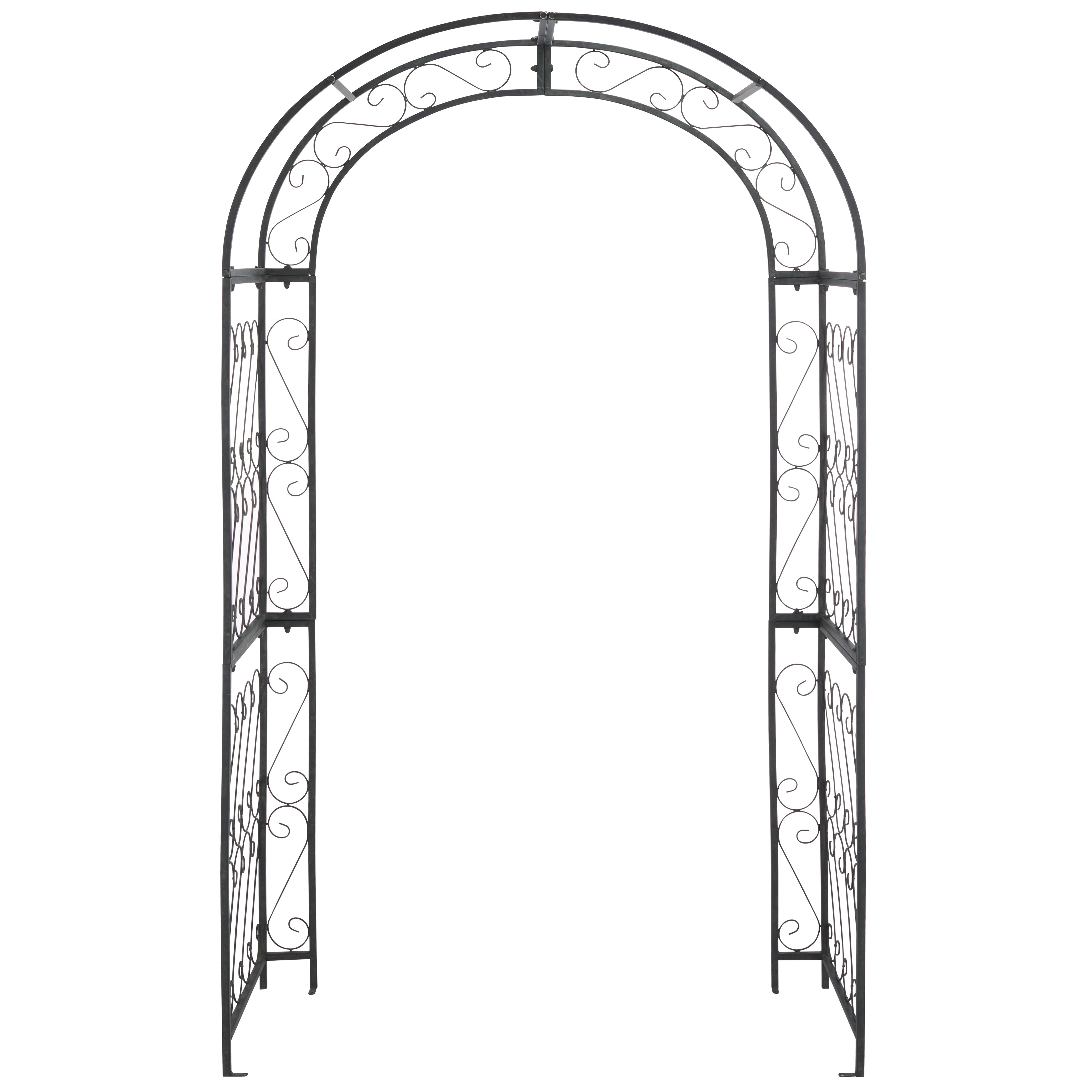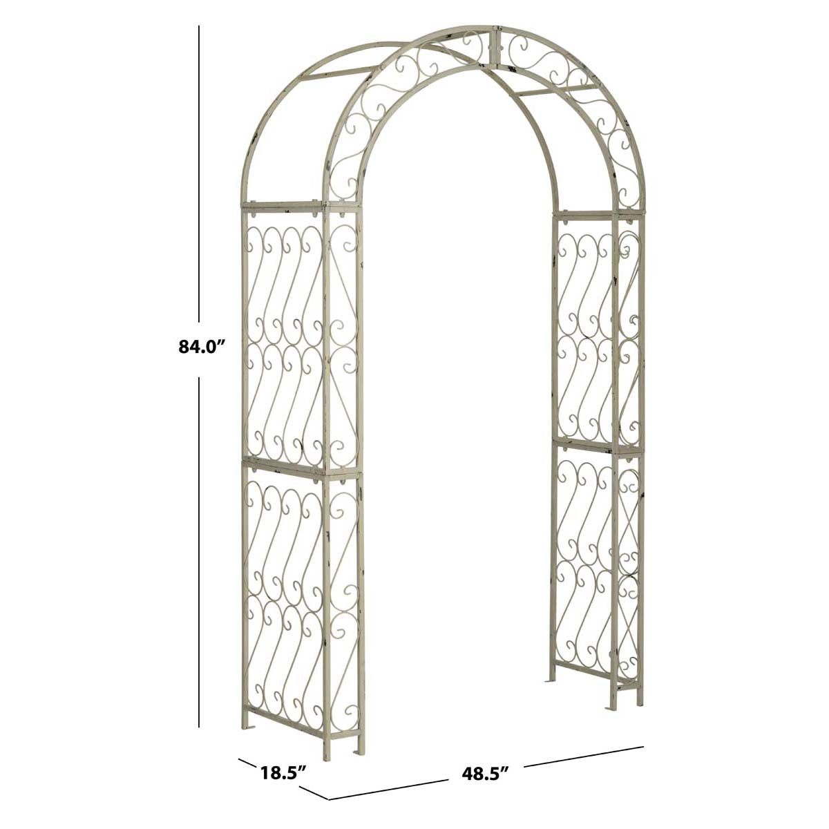This enchanting outdoor arch conjures images of the entrance to a secret garden, the antique trellises scented with the blossoms of climbing roses. Victorian filigree makes this masterpiece of ironwork as elegant in winter as it is during the peak flowering months of summer.