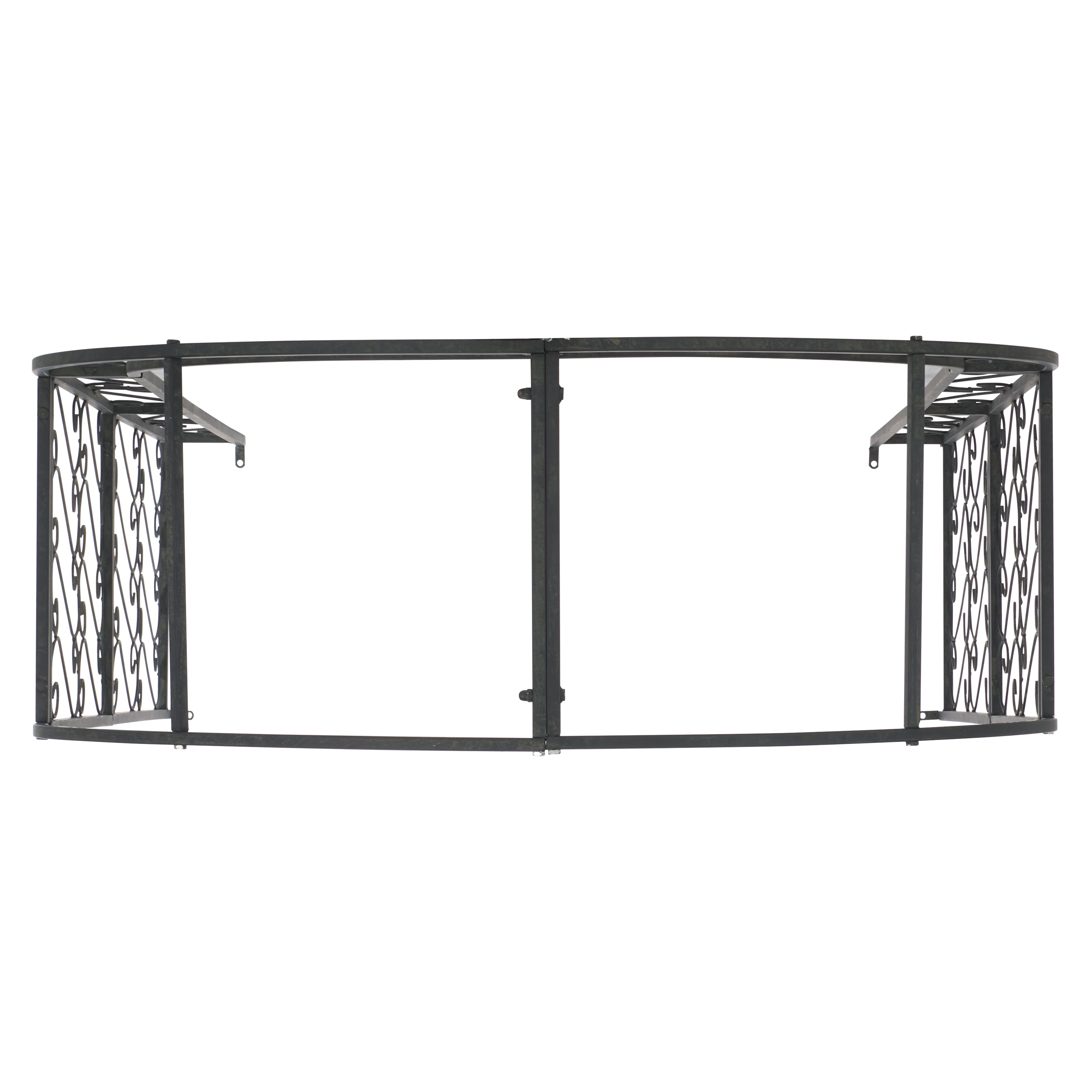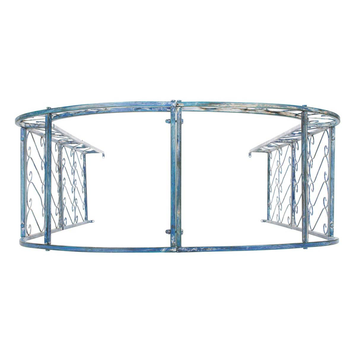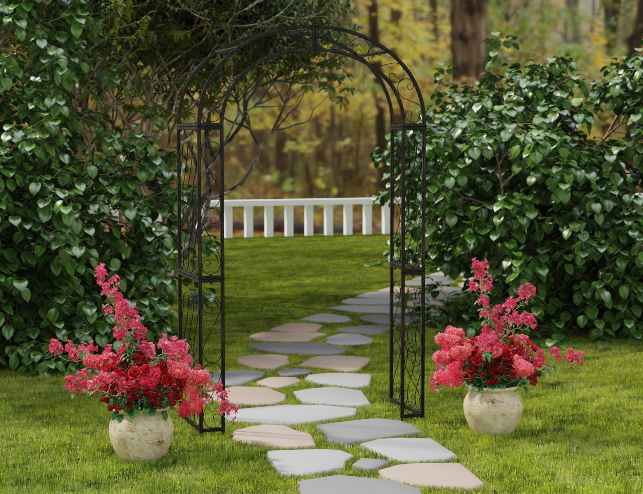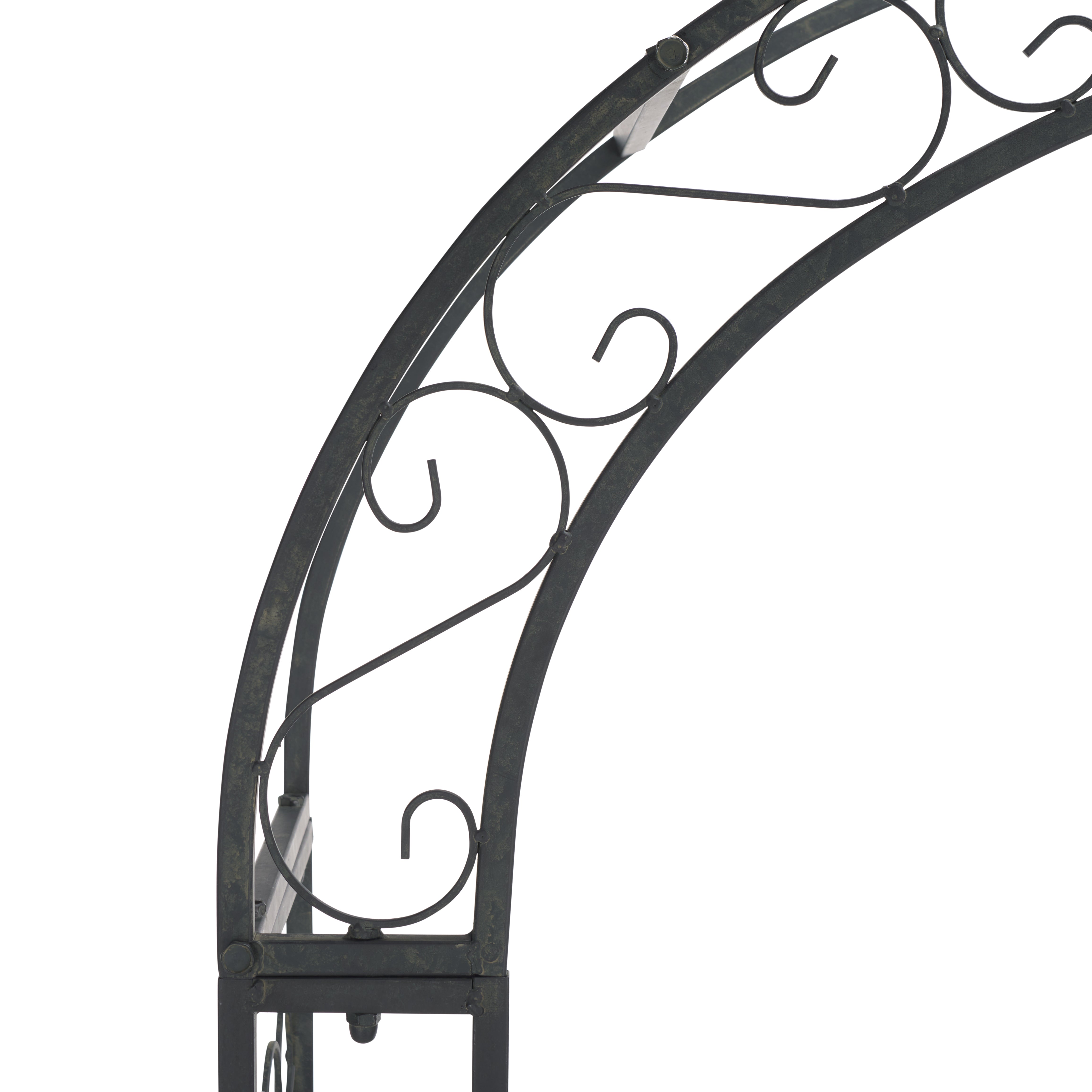 This enchanting outdoor arch conjures images of the entrance to a secret garden, the antique trellises scented with the blossoms of climbing roses. Victorian filigree makes this masterpiece of ironwork as elegant in winter as it is during the peak flowering months of summer.