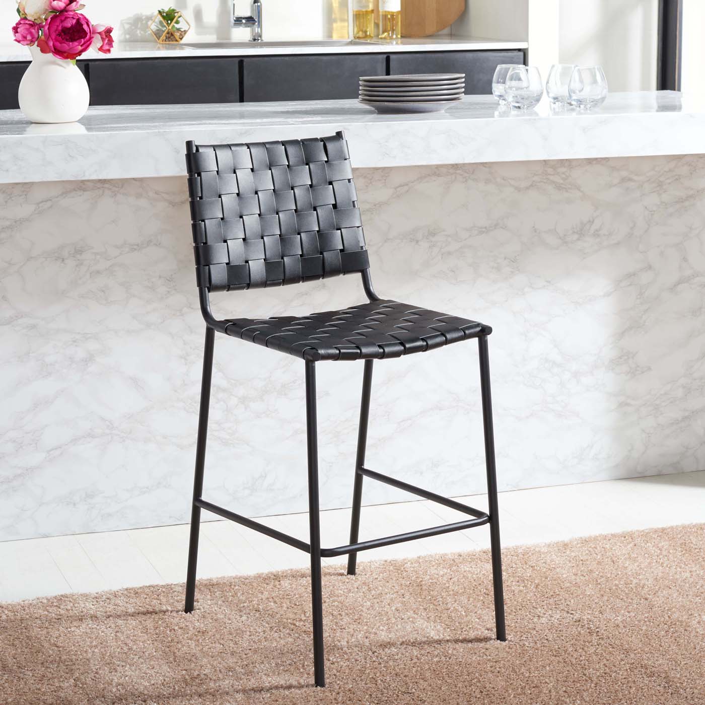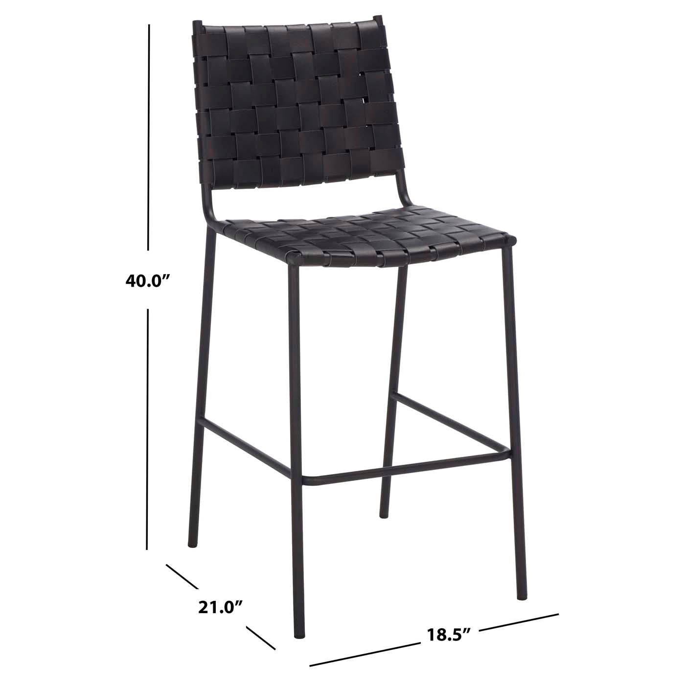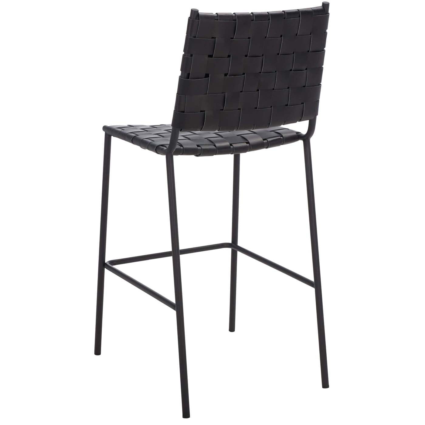 A high-style design for today?? elevated dining, this Bahari Counter Stool redefines any modern interior with its relaxed contemporary beauty. A clean-lined black metal base provides the perfect artistic contrast to Bahari?? basket-woven black leather seat and cut-out back.
