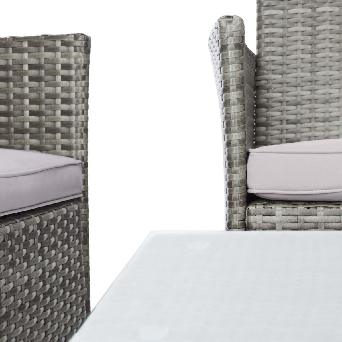 Visual depth abounds in the tonal grey bands and clean lines of this stylish Bandele Living Set. Including a chic glass topped coffee table with two armchairs and a loveseat finished with matching grey cushions, Bandele is the ideal place to lounge about poolside with friends and family.
