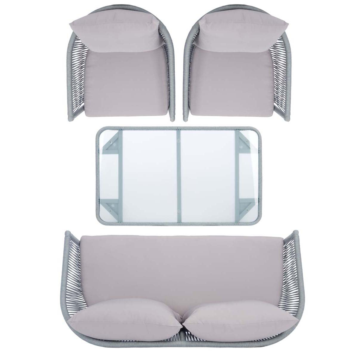 The classic barrel chair gets a streamlined modern update in this Belmi 4 Piece Outdoor Living Set. Featuring two arm chairs, a loveseat, and smooth glass top coffee table, the timeless silhouettes of Belmi?? seating is transformed for today?? outdoor entertaining with grey rope details and matching grey cushions.