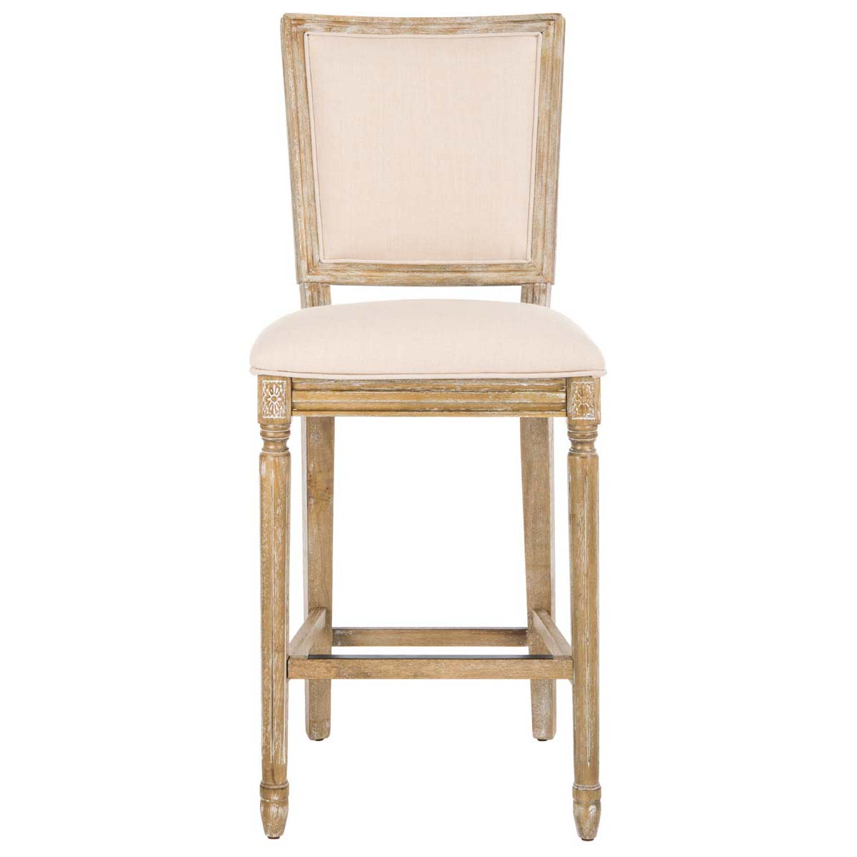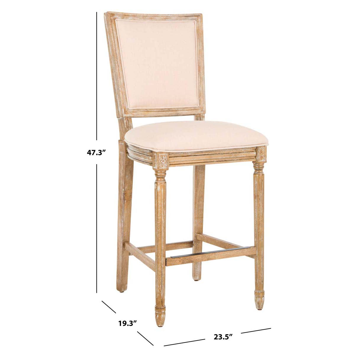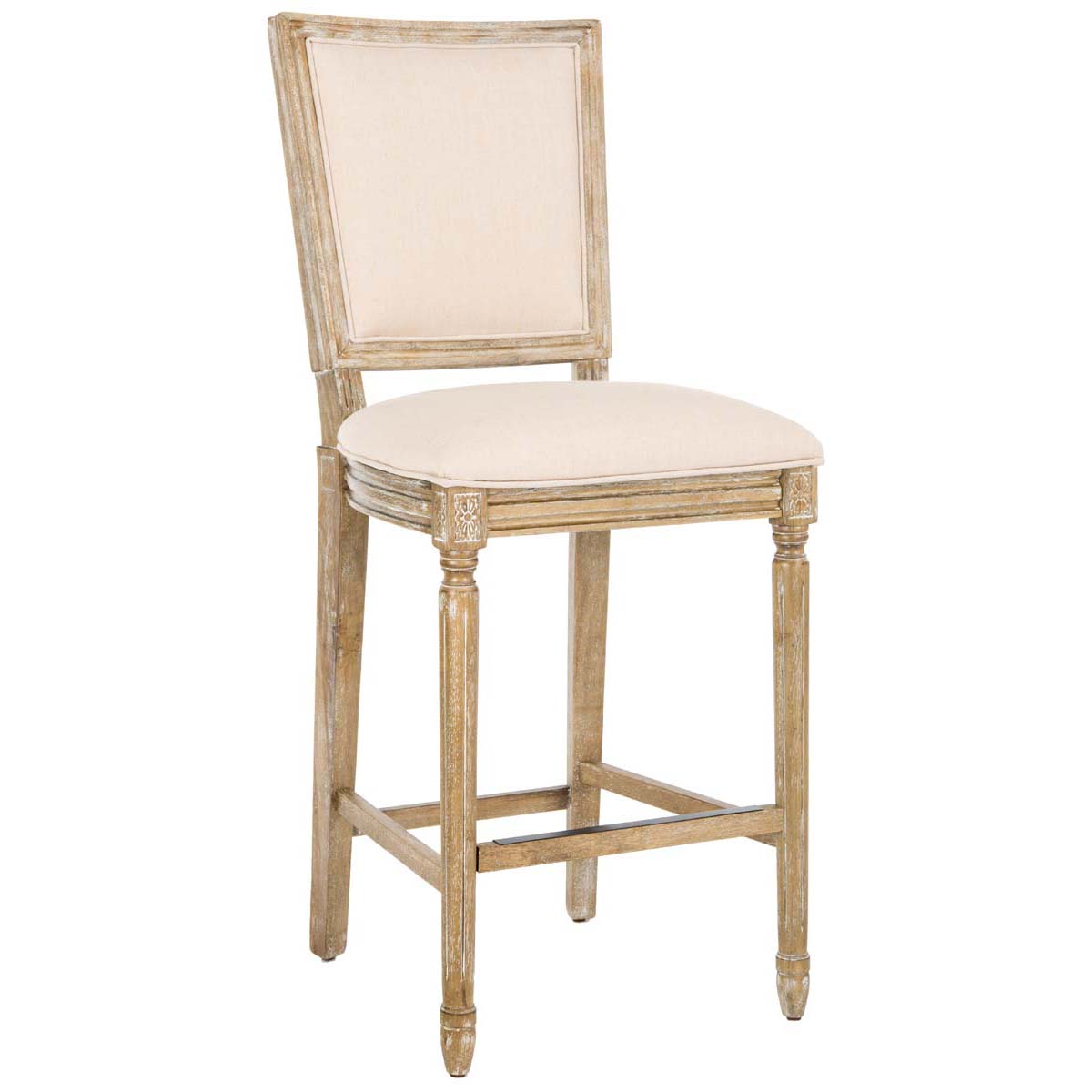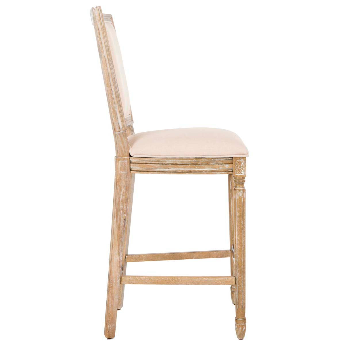 Entertain in style with this rectangle bar stool. Designed to bring French charm to the table, its chic beige upholstery is paired with finely carved rustic oak wood. Designers use it to add instant character to any dining area or breakfast bar.