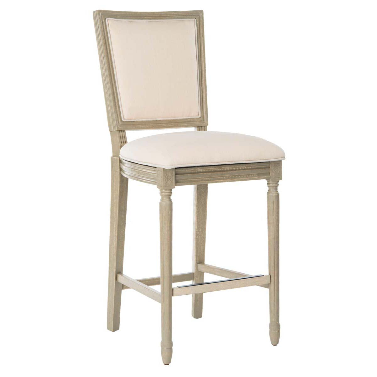 Entertain in style with this rectangle bar stool. Designed to bring French charm to the table, its chic light beige upholstery is paired with finely carved rustic grey wood. Designers use it to add instant character to any dining area or breakfast bar.