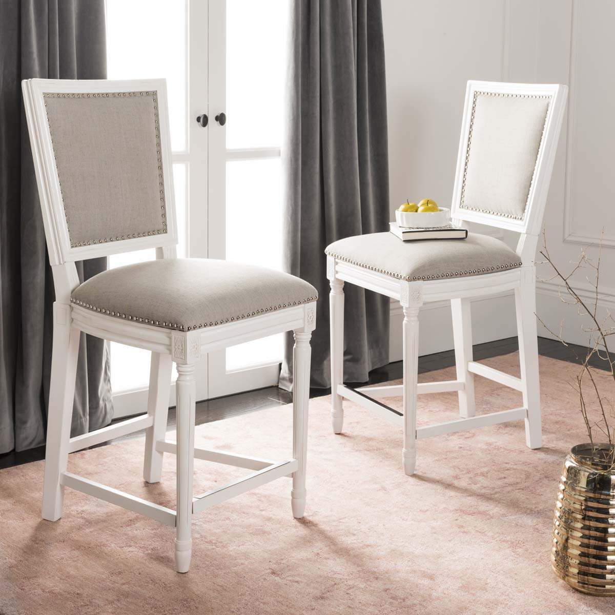 Bring refined living to any dining area with this Buchanan Counter Stool. A modern spin on a beloved classic, Buchanan brims with French farmhouse charm in its carved floral details on a distressed white wooden frame. Light grey linen and silver nail head trim give a soft contemporary touch. Sold in sets of two.