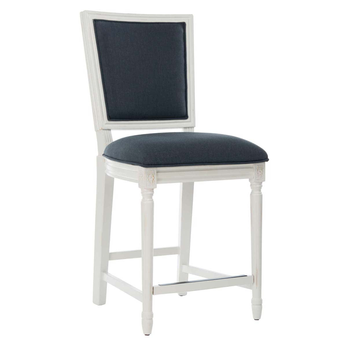 Bring refined living to any dining area with this Buchanan Counter Stool. A modern spin on a beloved classic, Buchanan brims with French farmhouse charm in its carved floral details on a distressed white wooden frame. Navy linen gives a soft contemporary touch. Sold in sets of two.
