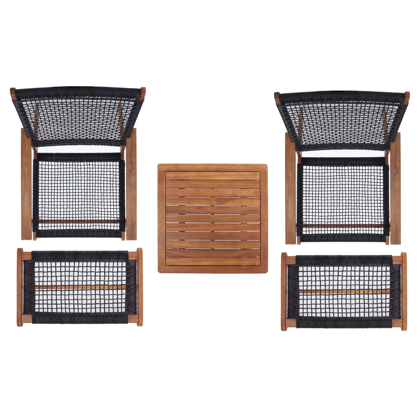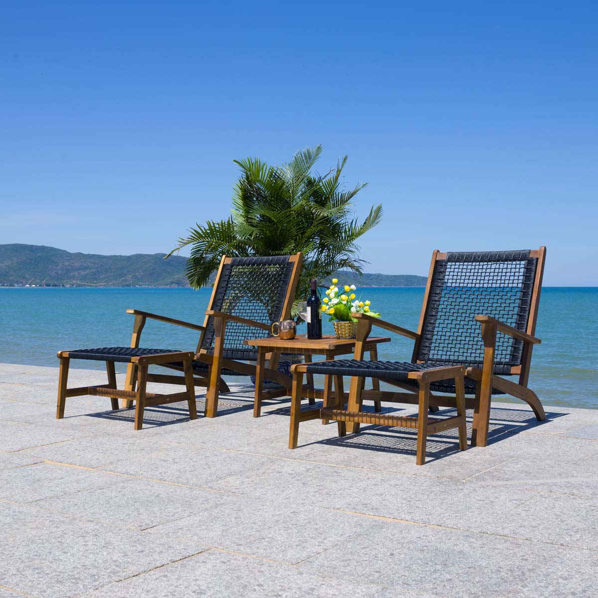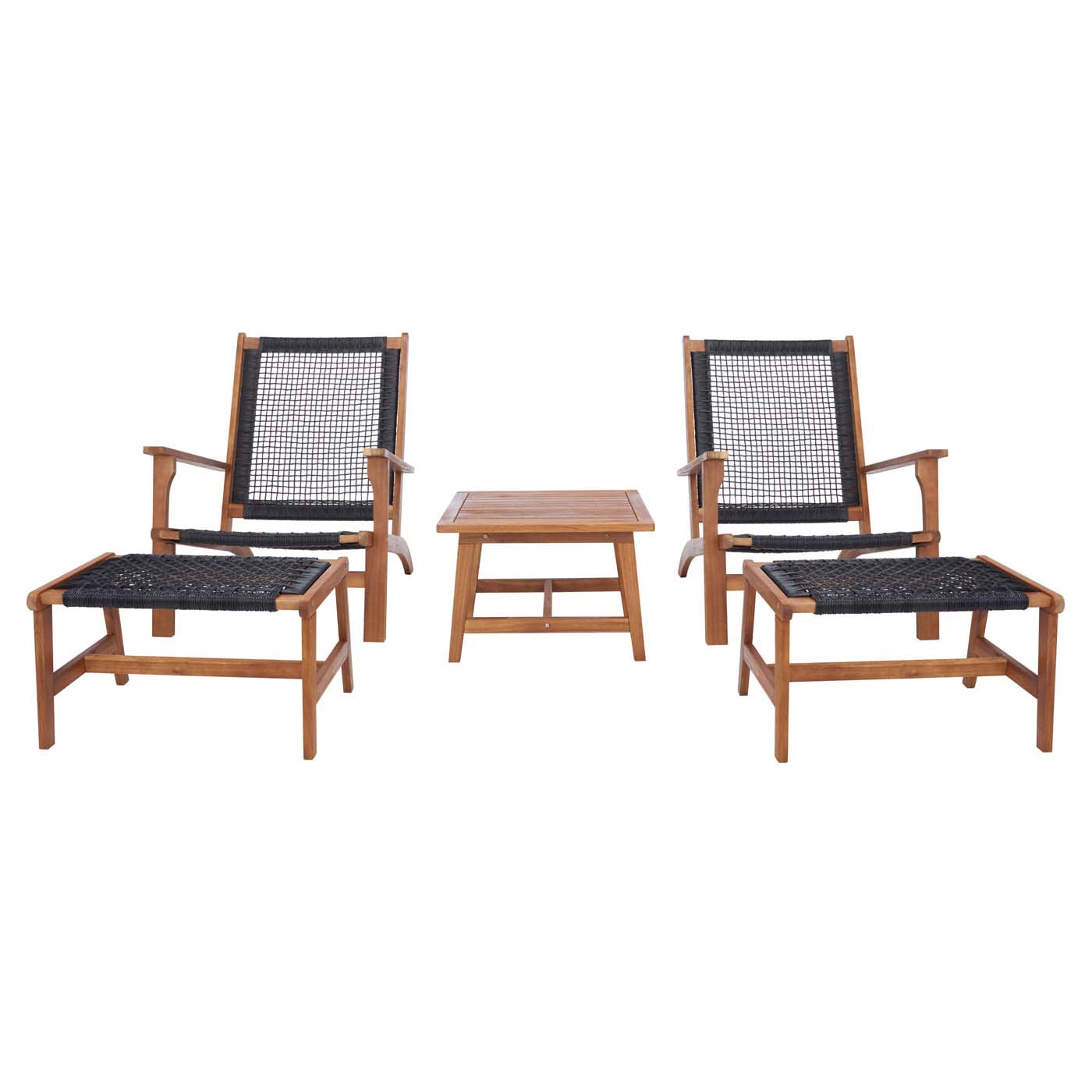 Bring the tropical resort to your own backyard with this coastal Chantelle Set. Chantelle?? two low natural wood seats and matching stools allow you to stretch out and lounge in luxury, and its end table is perfect for aperitifs or appetizers. Designers love Chantelle?? woven black rope.