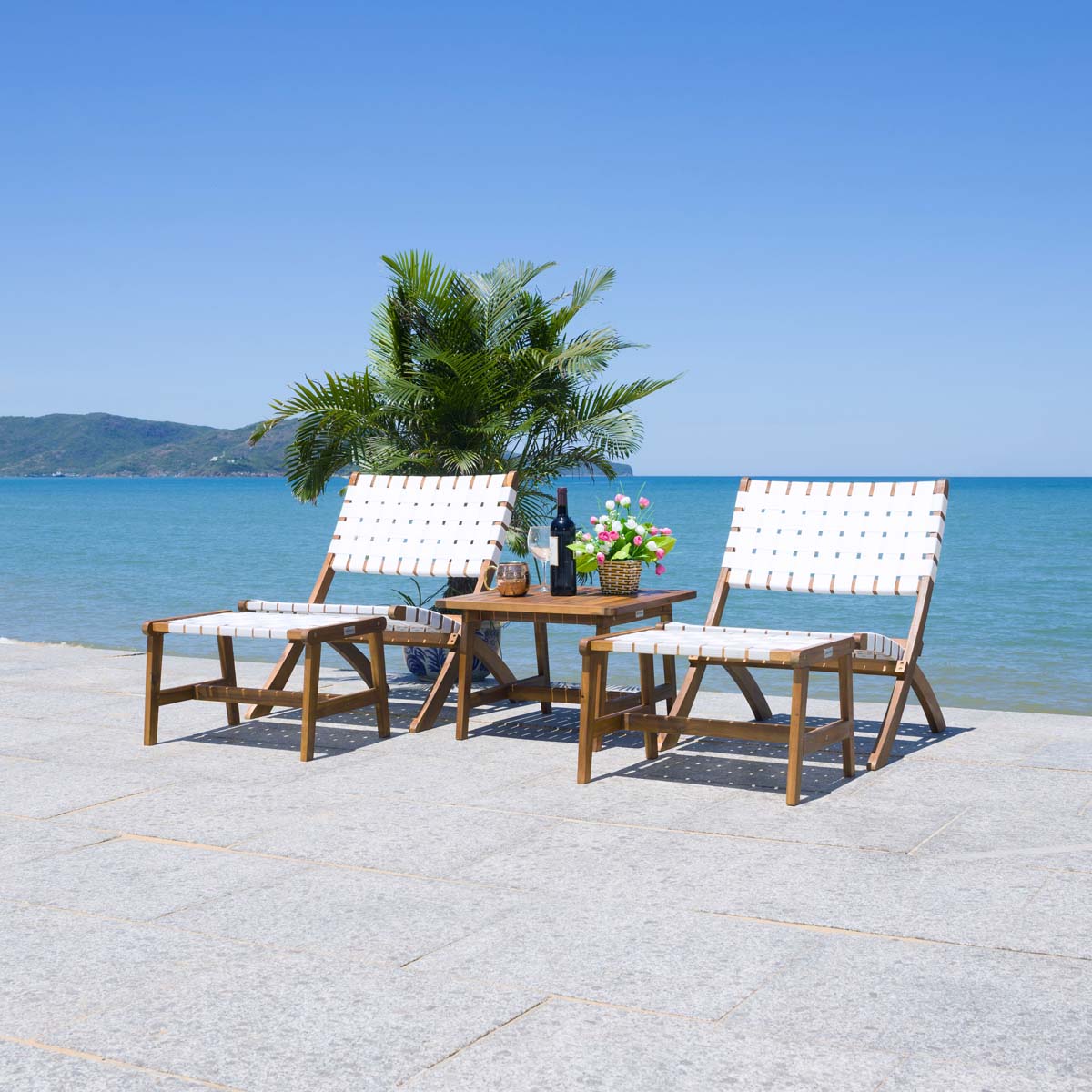 Stretch out and enjoy the summer breeze with this Darryl Set. Two natural wood chairs and matching ottomans allow for lavish lounging in the sunshine, and an end table provides ample space for coffees, cocktails, or snacks.