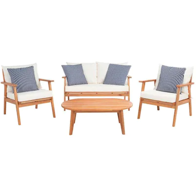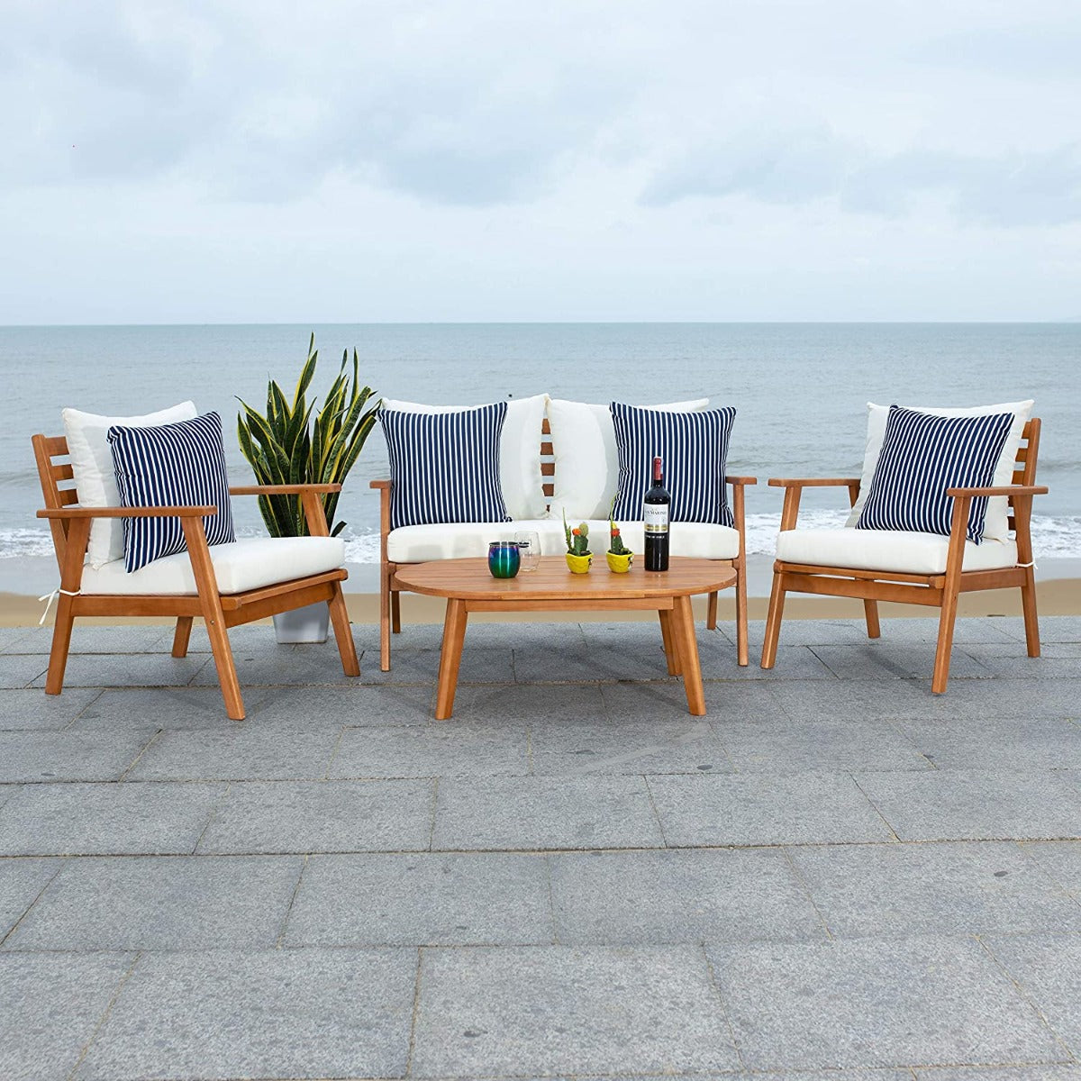 Designed for value and versatility, this contemporary 4 piece living set creates an instant outdoor room in any open air space. Plush beige cushions and striped navy pillows sit on its expertly crafted acacia wood frames, while its classic circular table is ideal for entertaining.