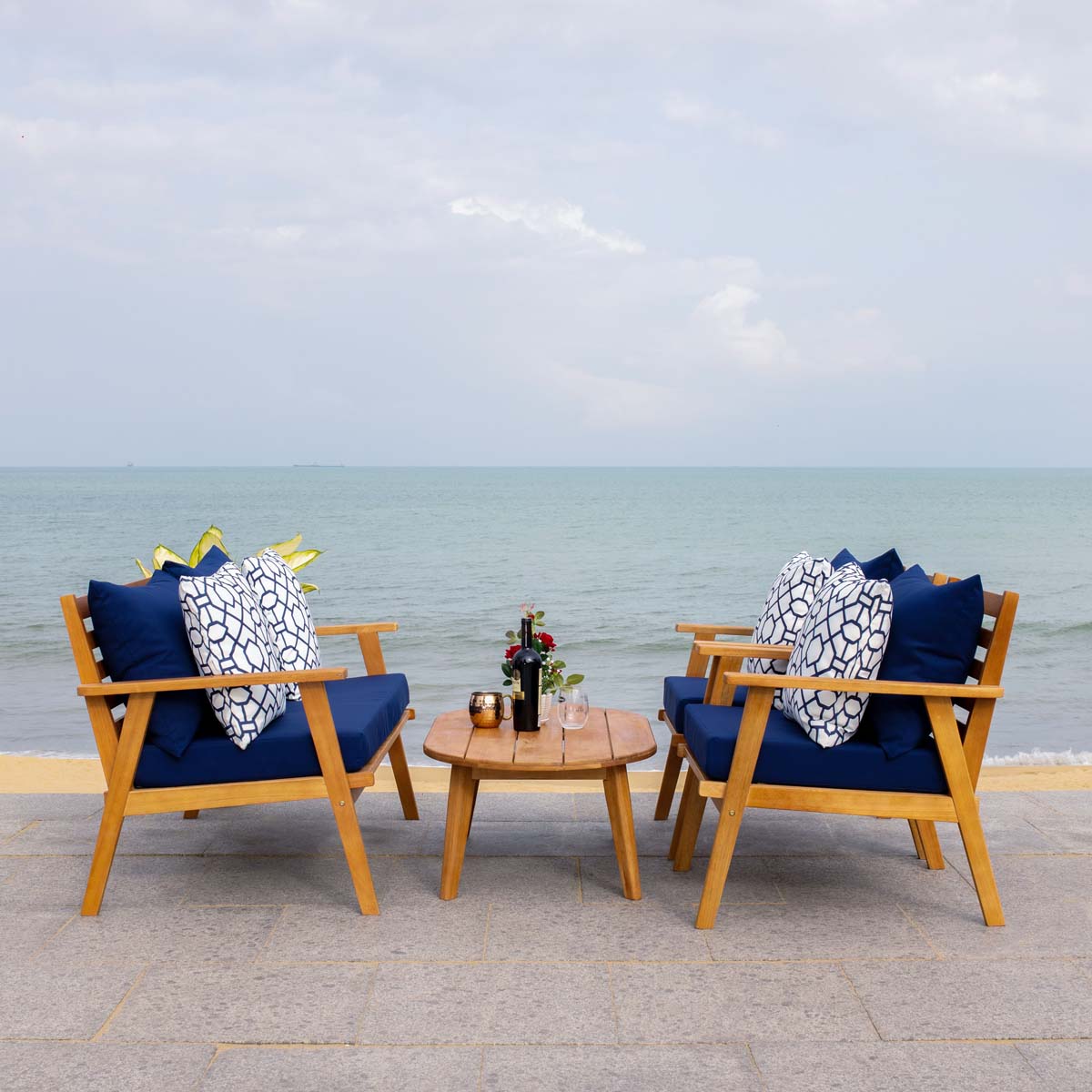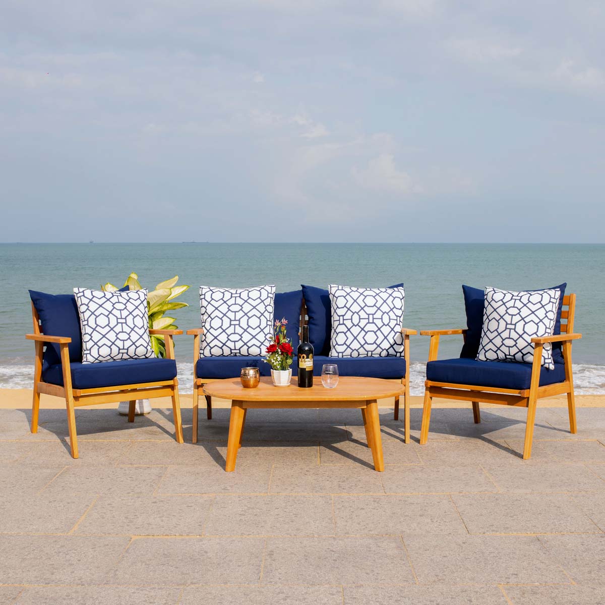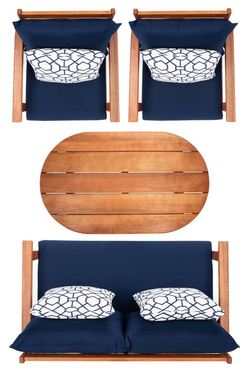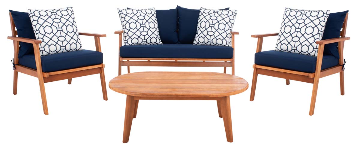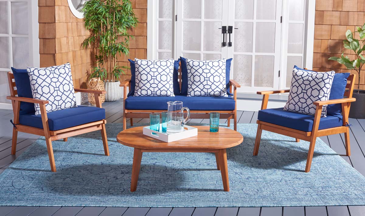 Designed For Value And Versatility, This Contemporary 4-Piece Living Set Creates An Instant Outdoor Room In Any Open-Air Space. Comfy White Pillows With A Navy Mosaic Design And Matching Navy Cushions Sit On Expertly Crafted Acacia Wood Frames, While Its Circular Table Is Ideal For Entertaining.