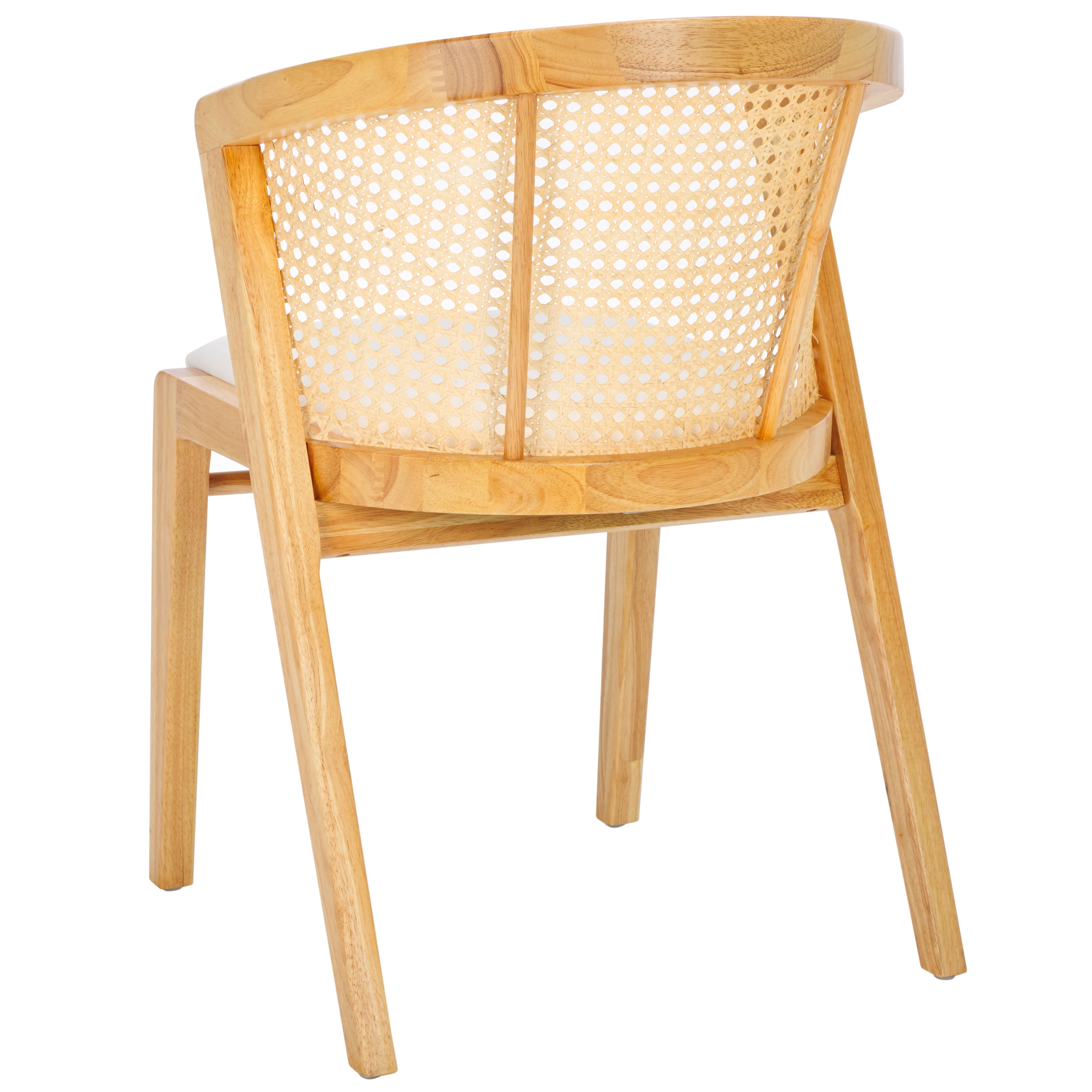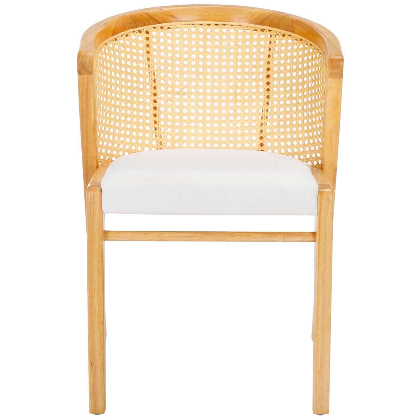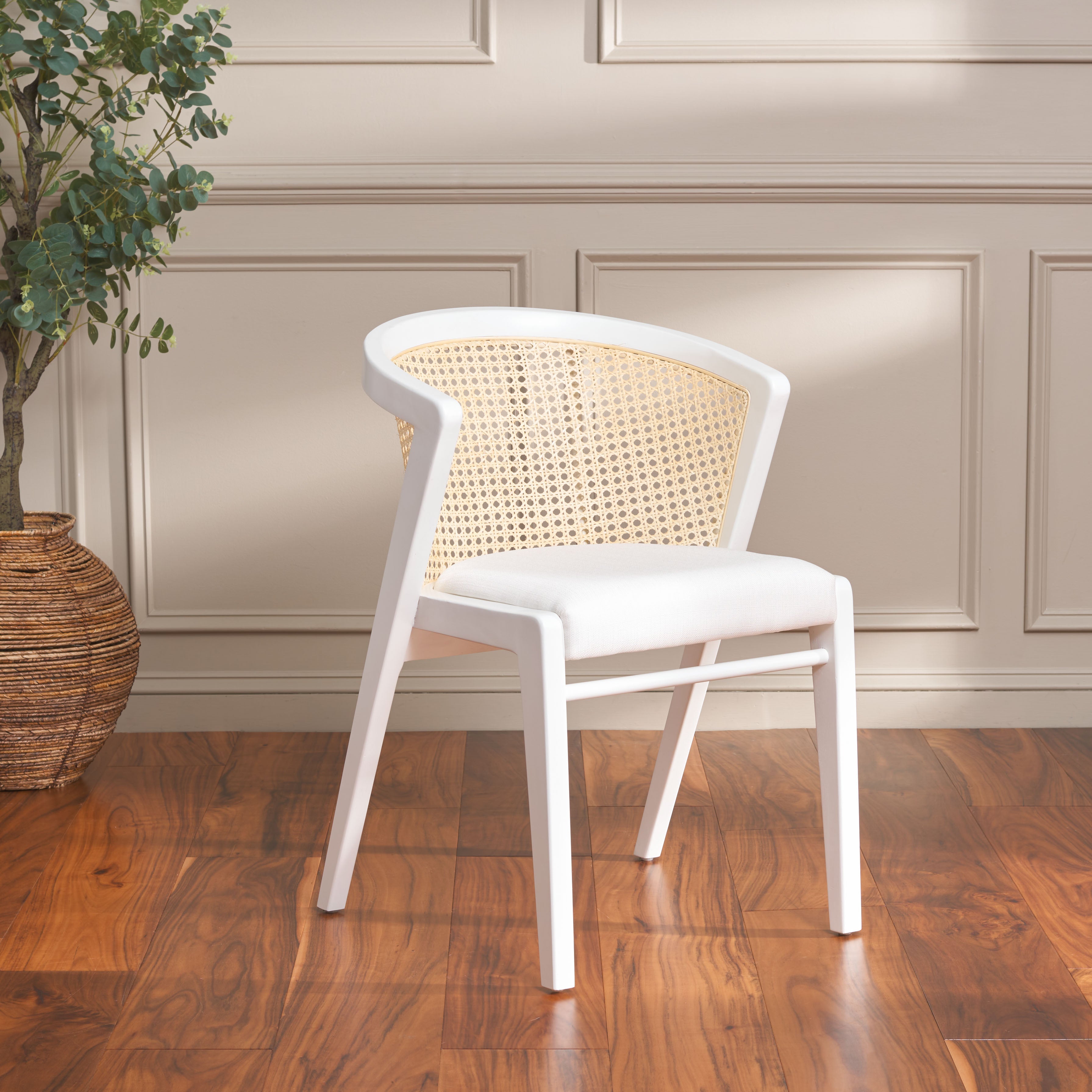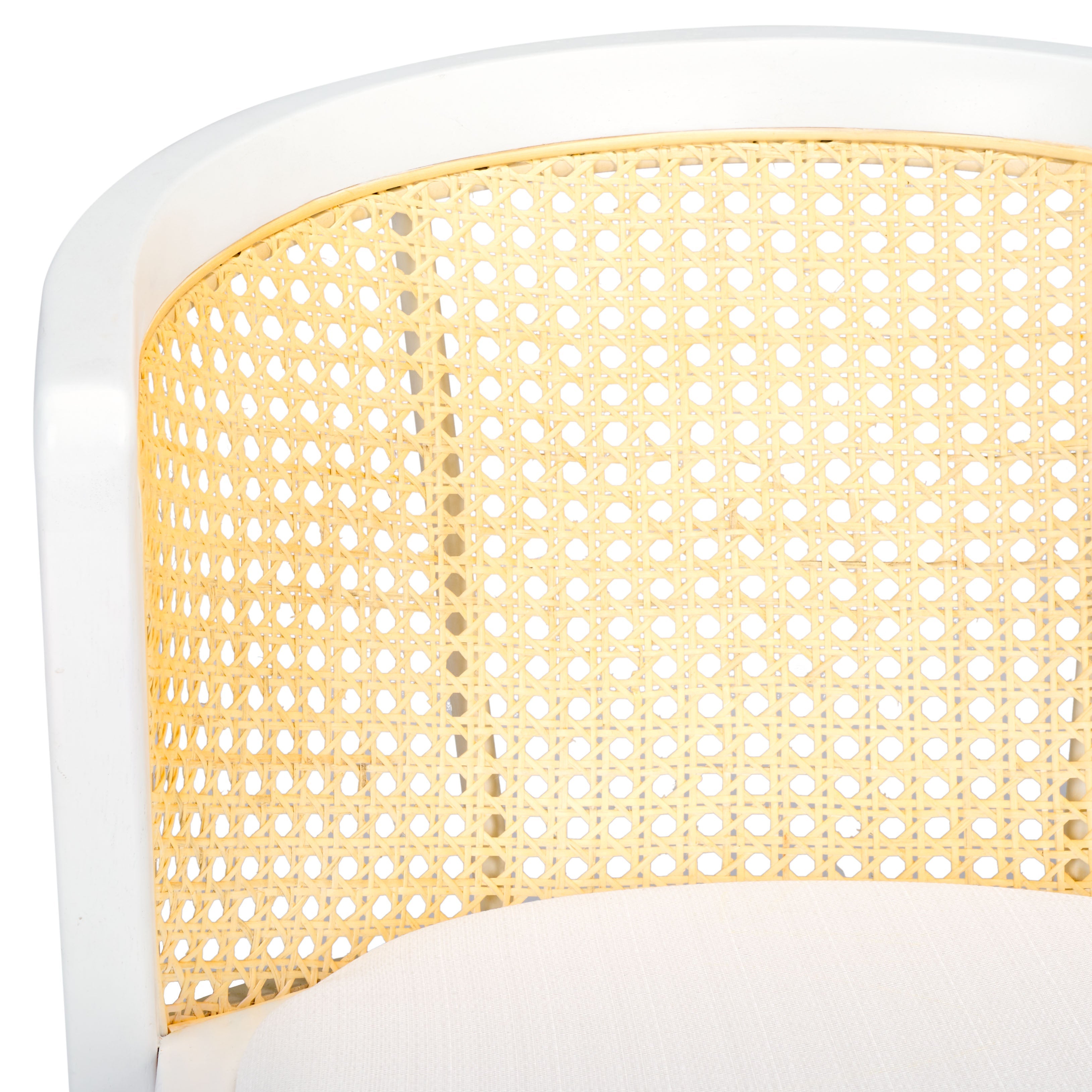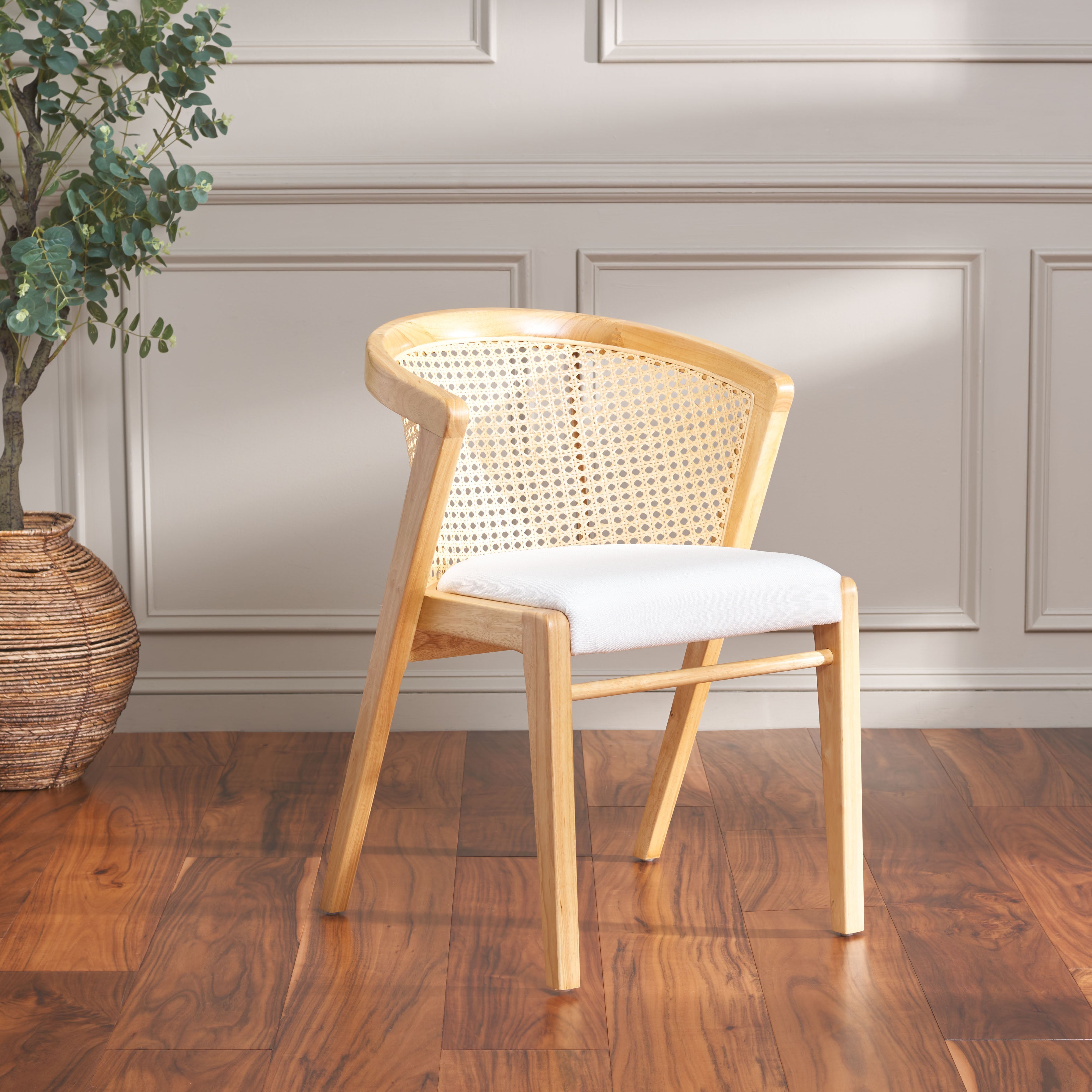 Liven up your home with the modern charm and breezy appeal of our Edan dining chair. Its mid-century modern appeal is combined with rich materials to add a cozy and fashionable edge to any room. The beautifully refined barrel back of the chair is updated with the rich texture of rattan. Crafted in solid wood, our dining chair enlivens any space with its warm and rich textural appeal. It includes a white padded seat to lend comfort and stylishly casual air to your kitchen, dining room, or living area.