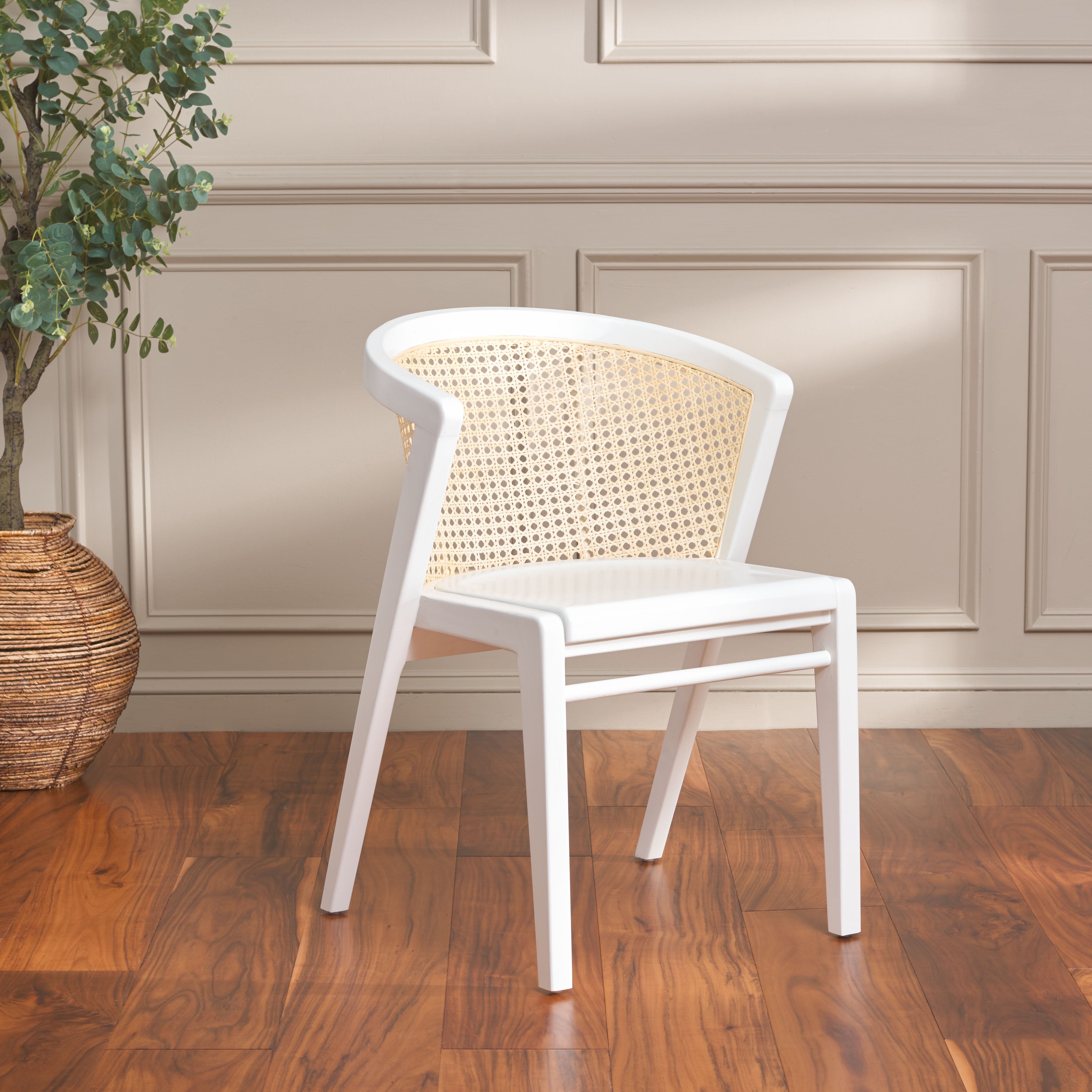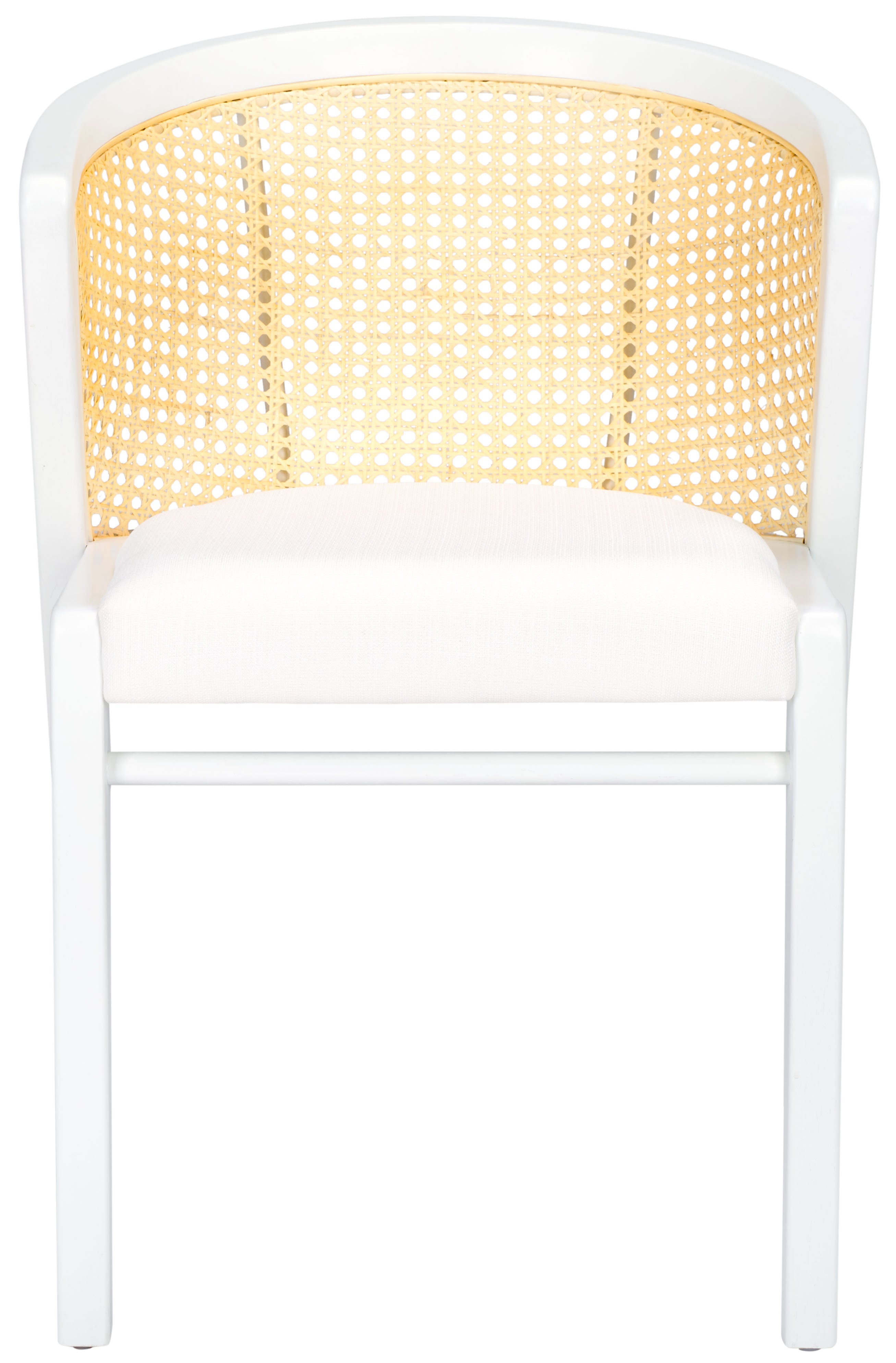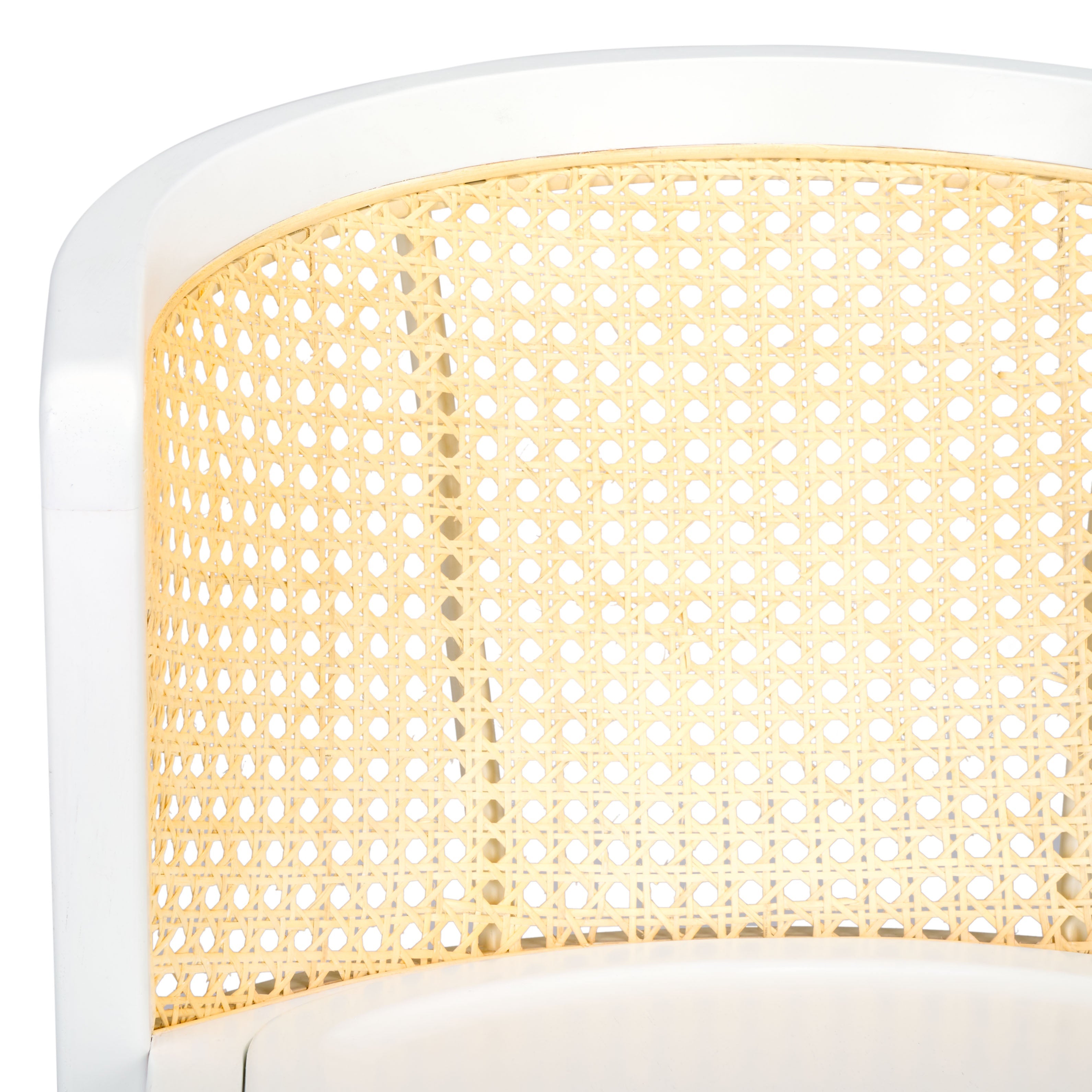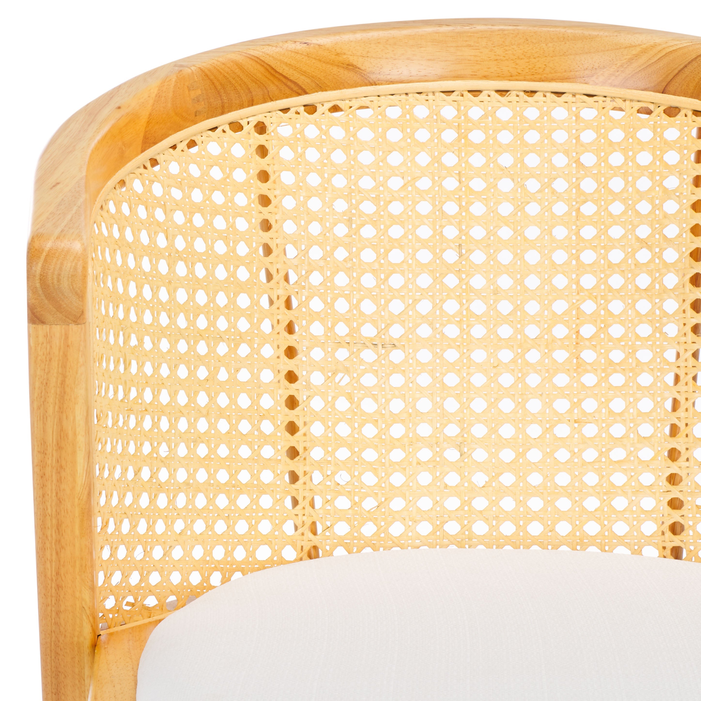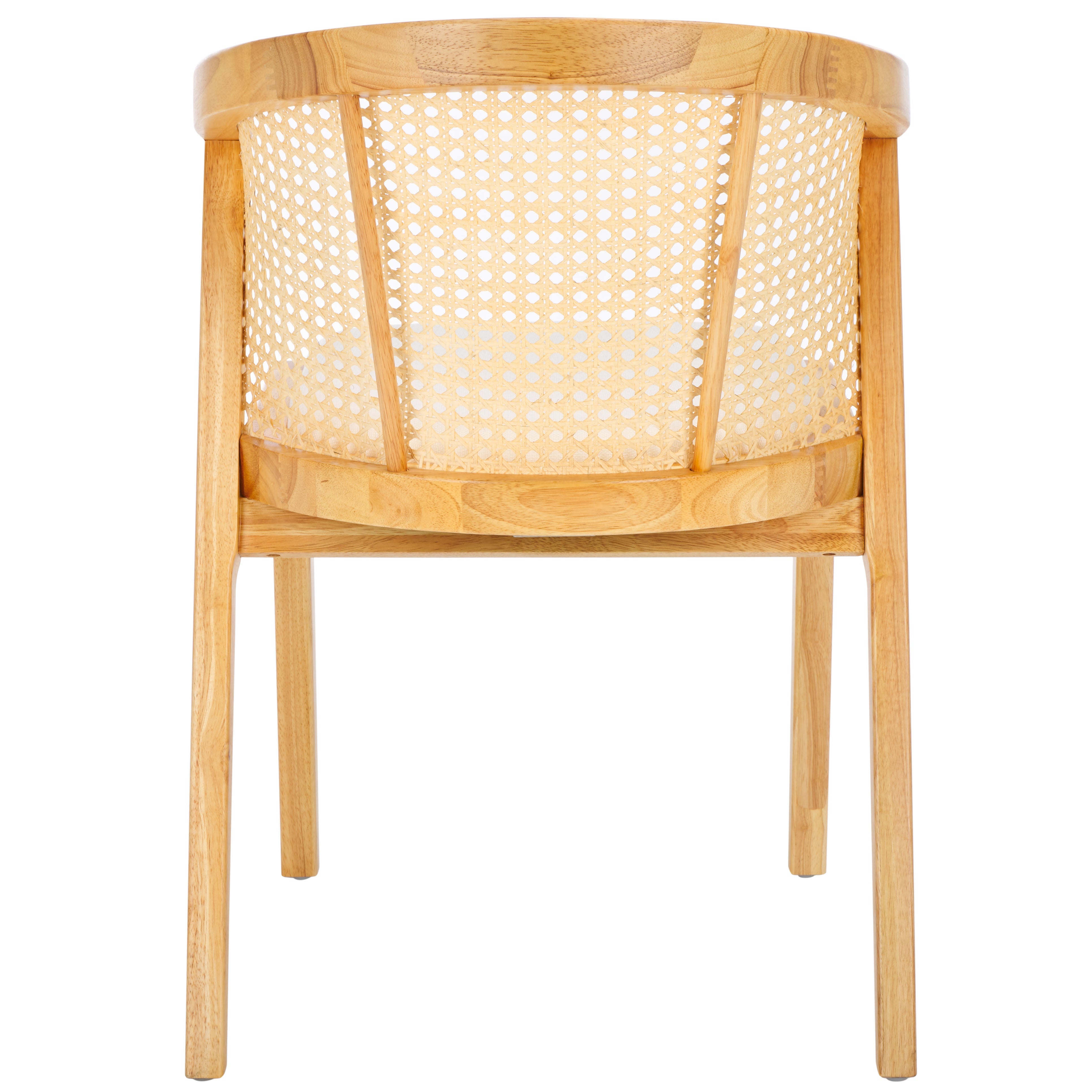 Liven up your home with the modern charm and breezy appeal of our Edan dining chair. Its mid-century modern appeal is combined with rich materials to add a cozy and fashionable edge to any room. The beautifully refined barrel back of the chair is updated with the rich texture of rattan. Crafted in solid wood, our dining chair enlivens any space with its warm and rich textural appeal. It includes a white padded seat to lend comfort and stylishly casual air to your kitchen, dining room, or living area.