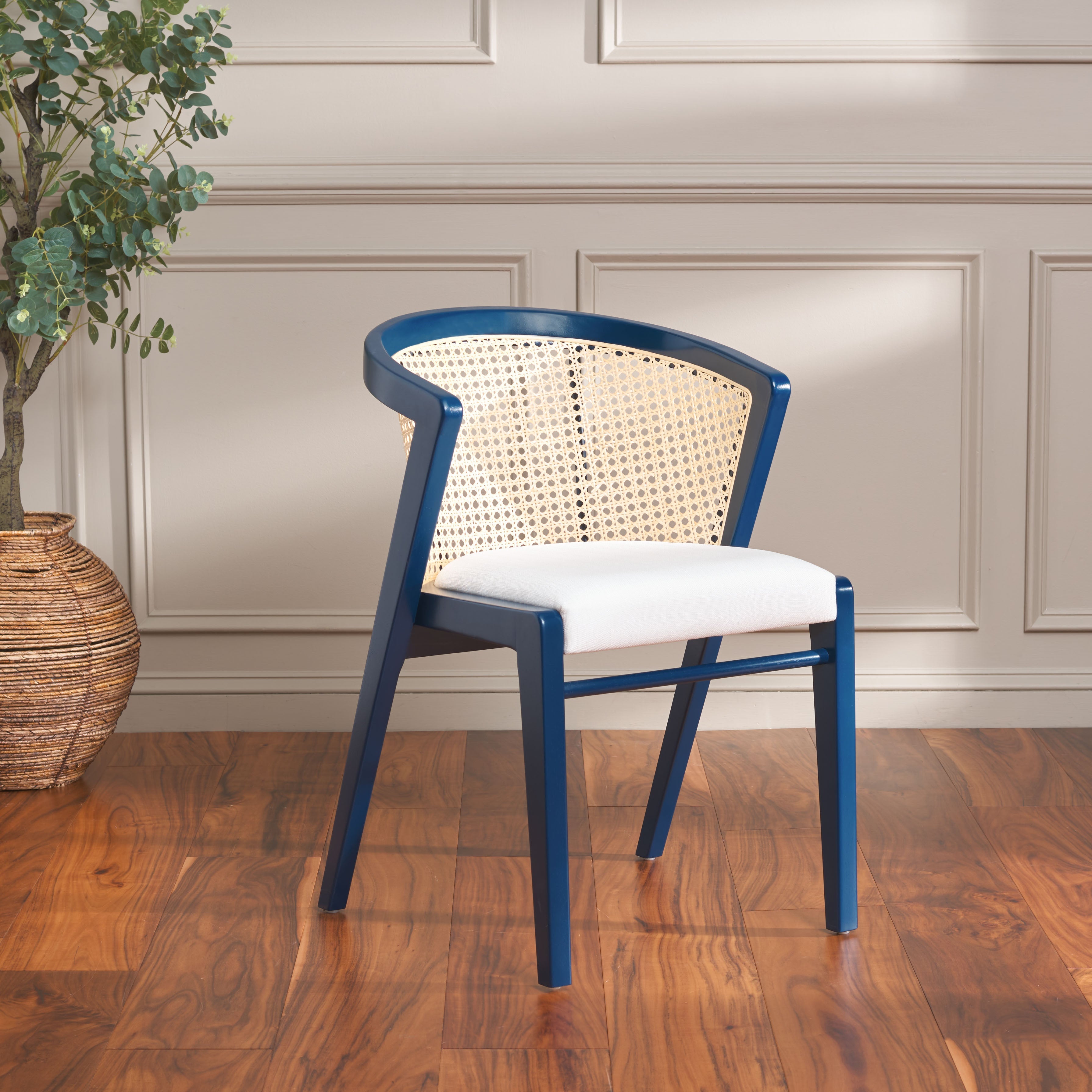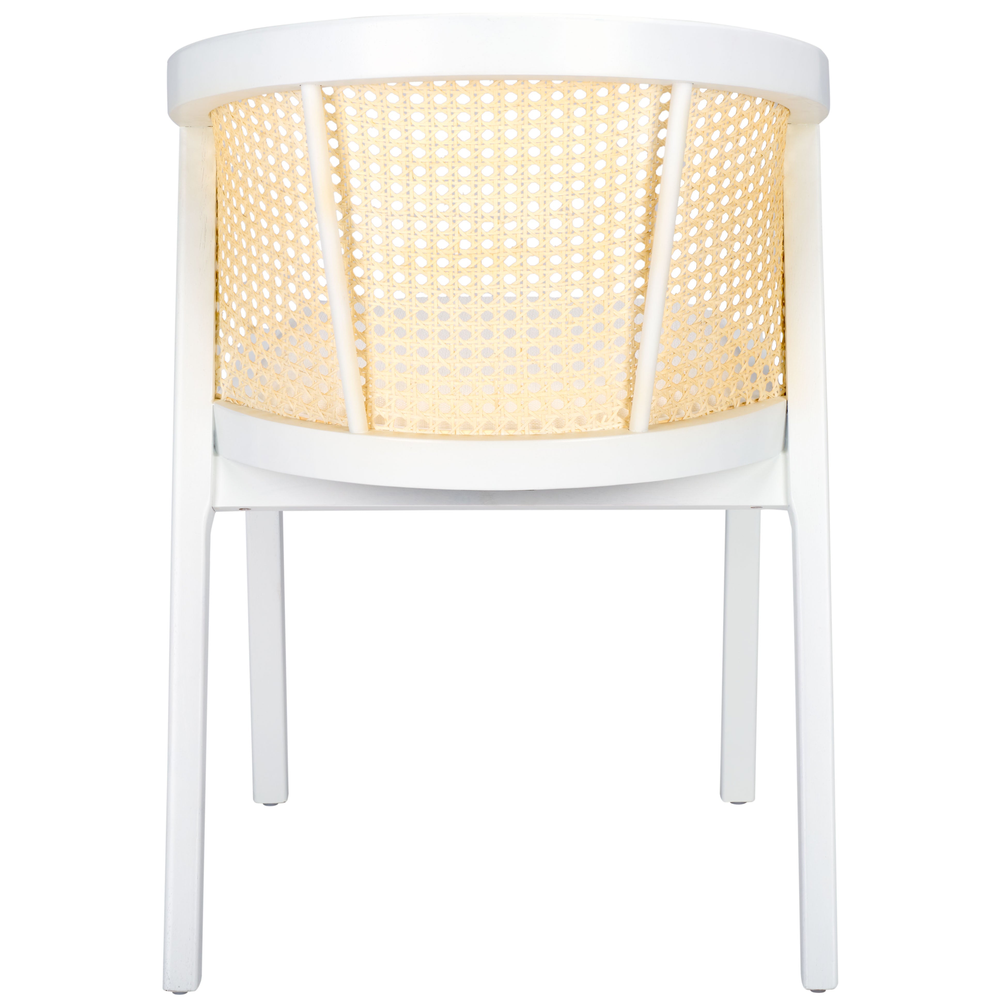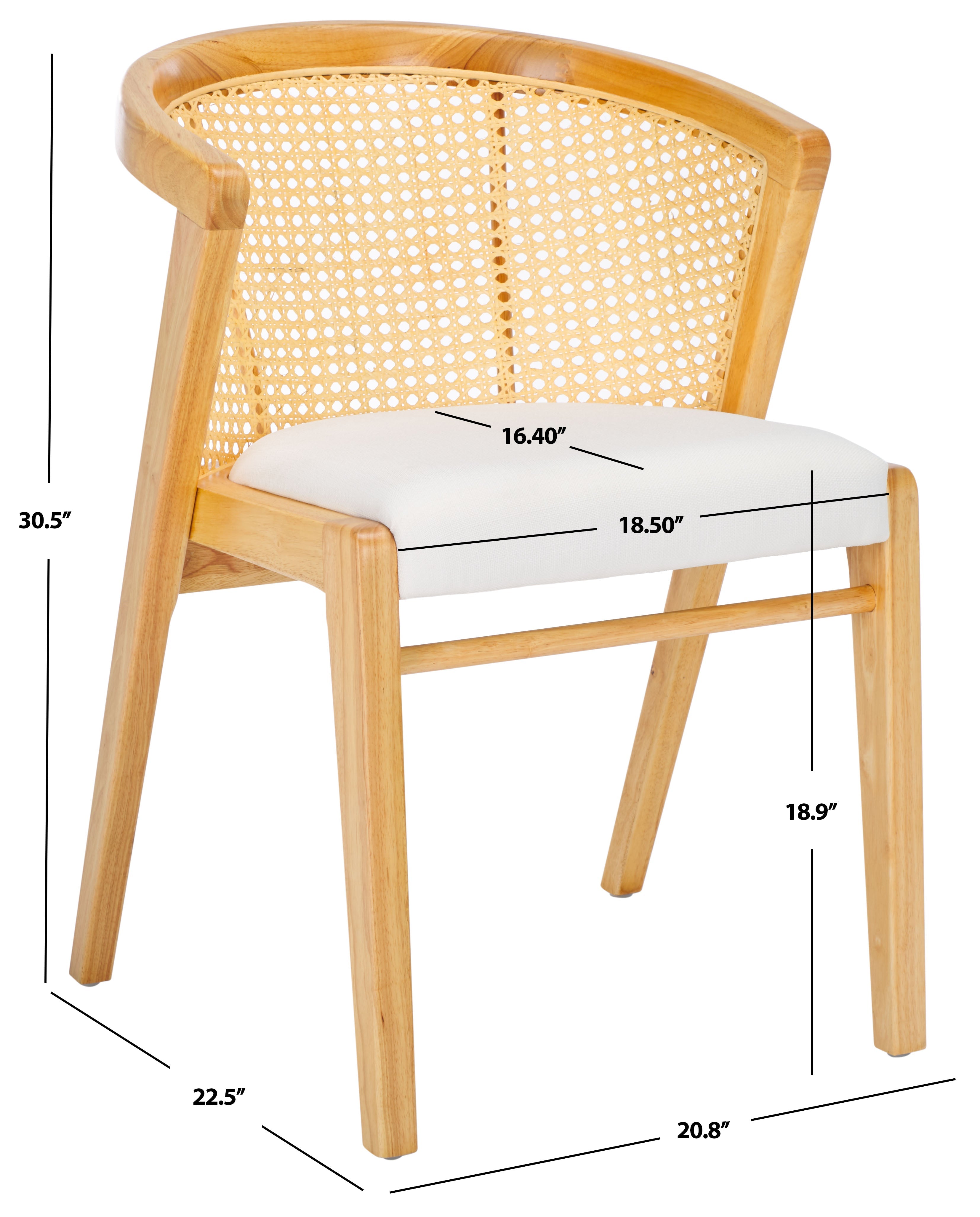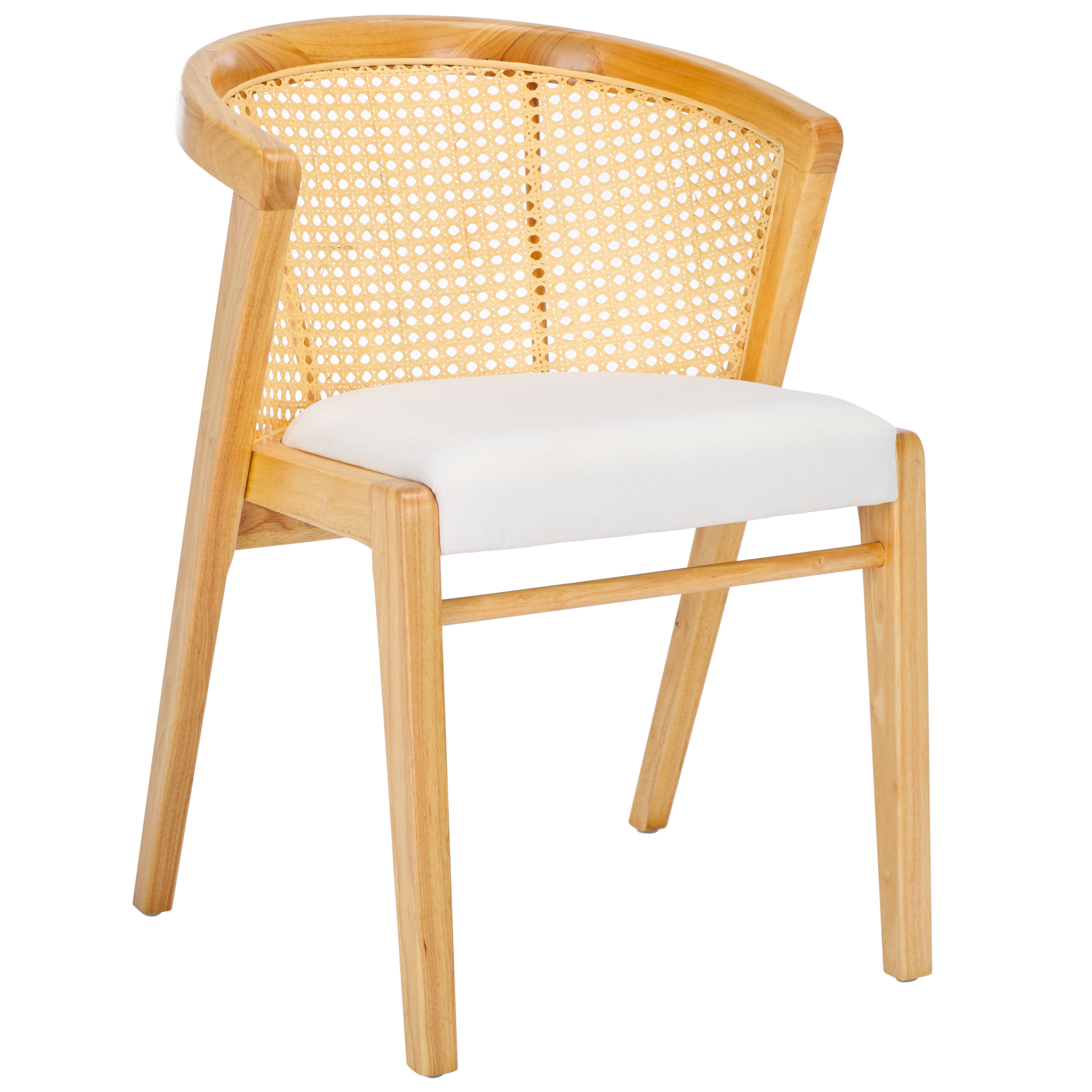 Liven up your home with the modern charm and breezy appeal of our Edan dining chair. Its mid-century modern appeal is combined with rich materials to add a cozy and fashionable edge to any room. The beautifully refined barrel back of the chair is updated with the rich texture of rattan. Crafted in solid wood, our dining chair enlivens any space with its warm and rich textural appeal. It includes a white padded seat to lend comfort and stylishly casual air to your kitchen, dining room, or living area.