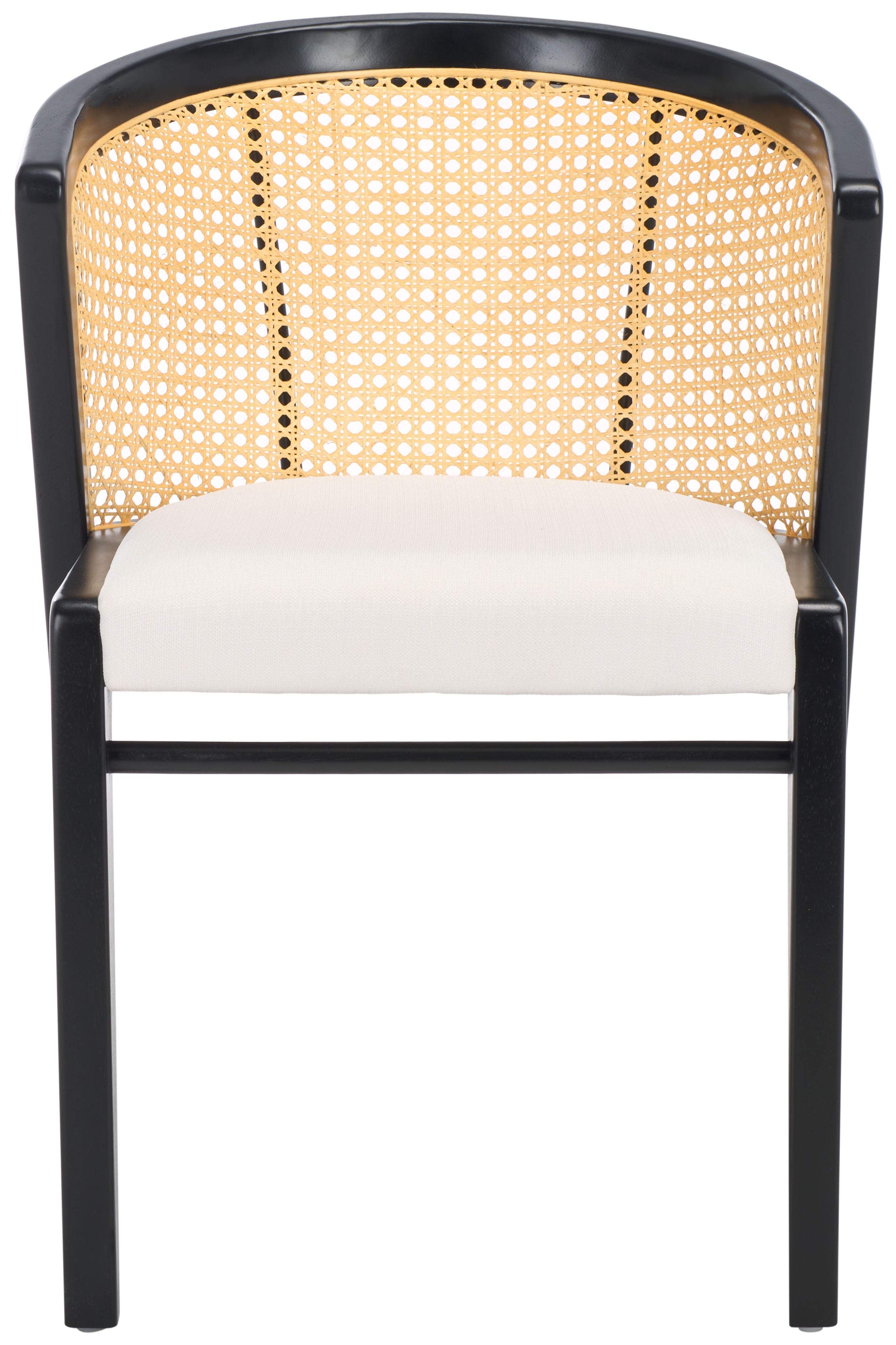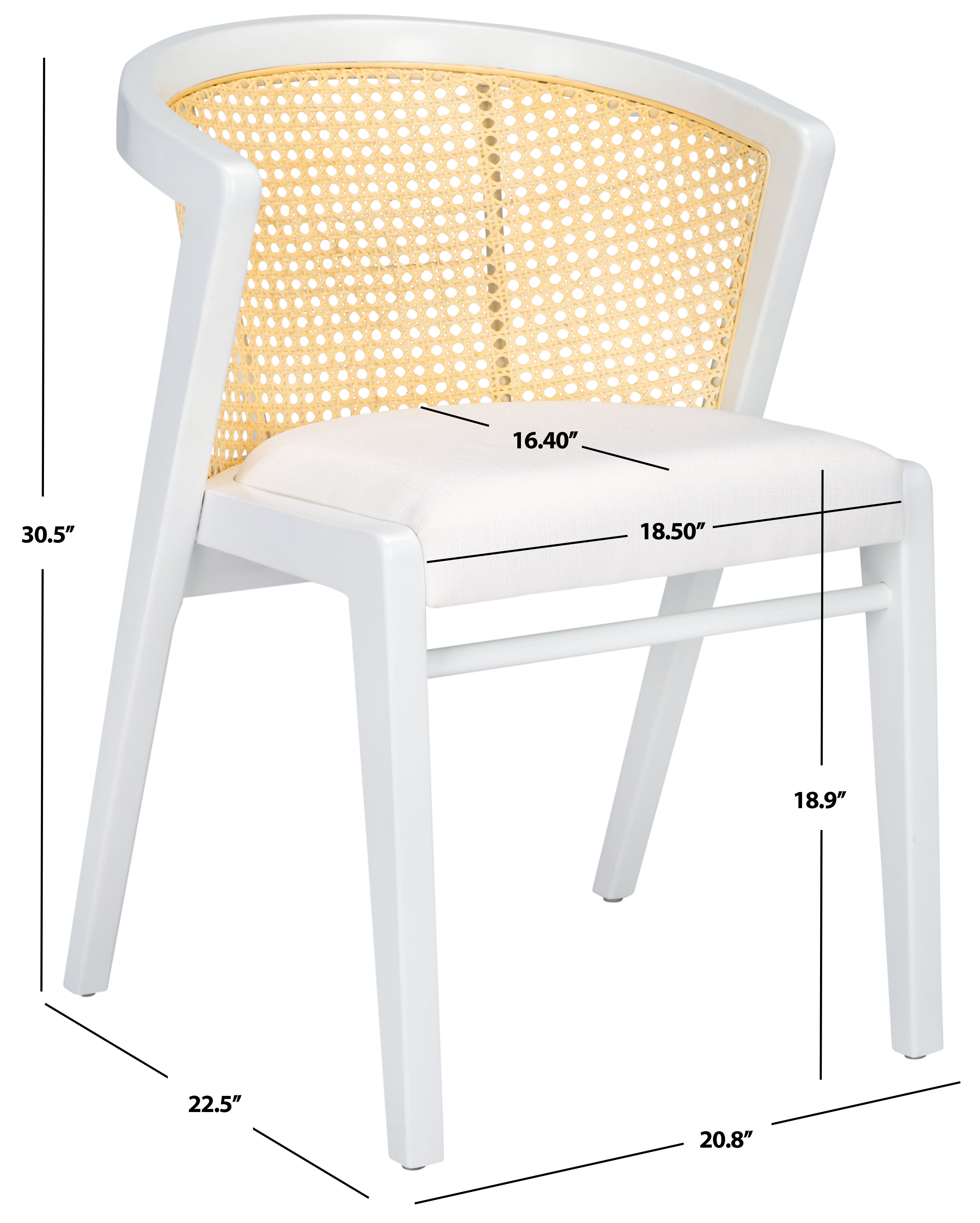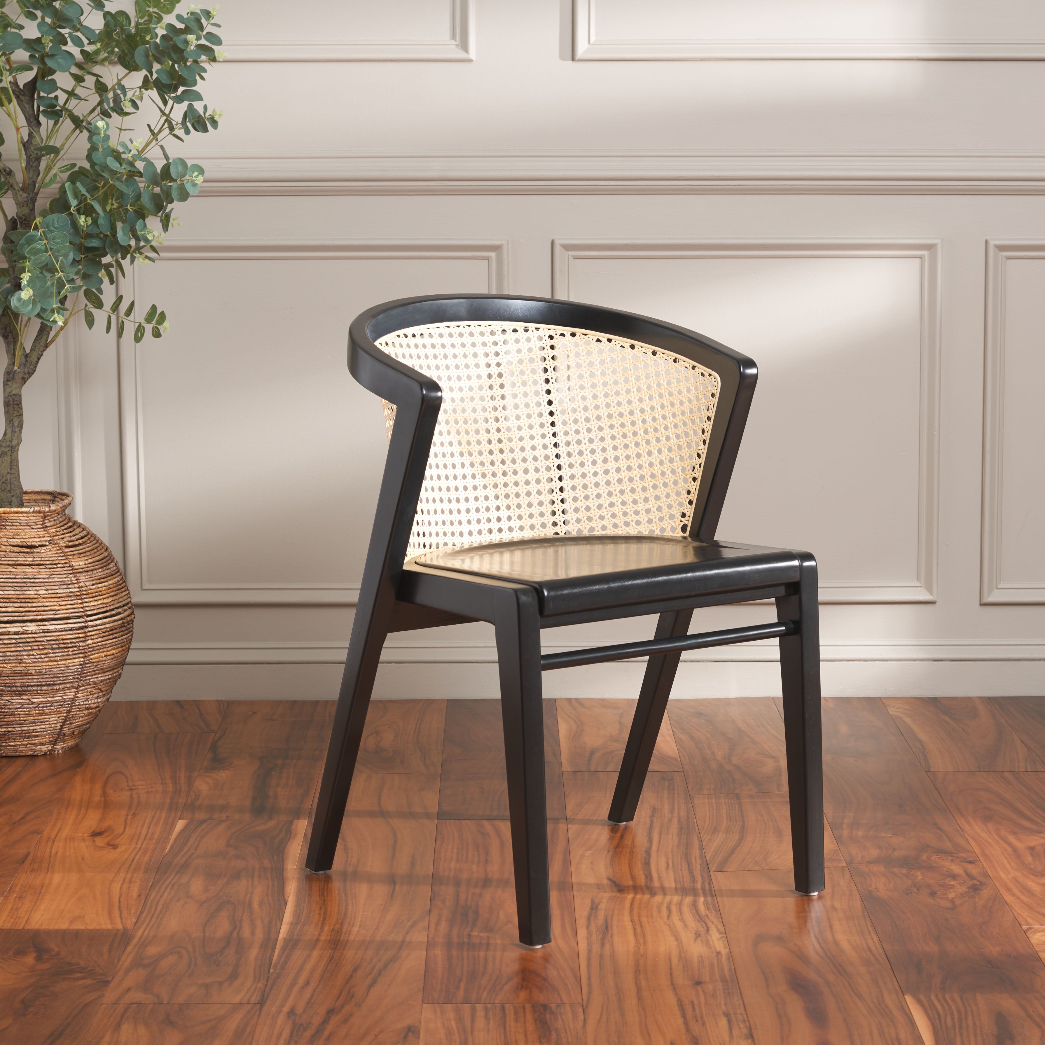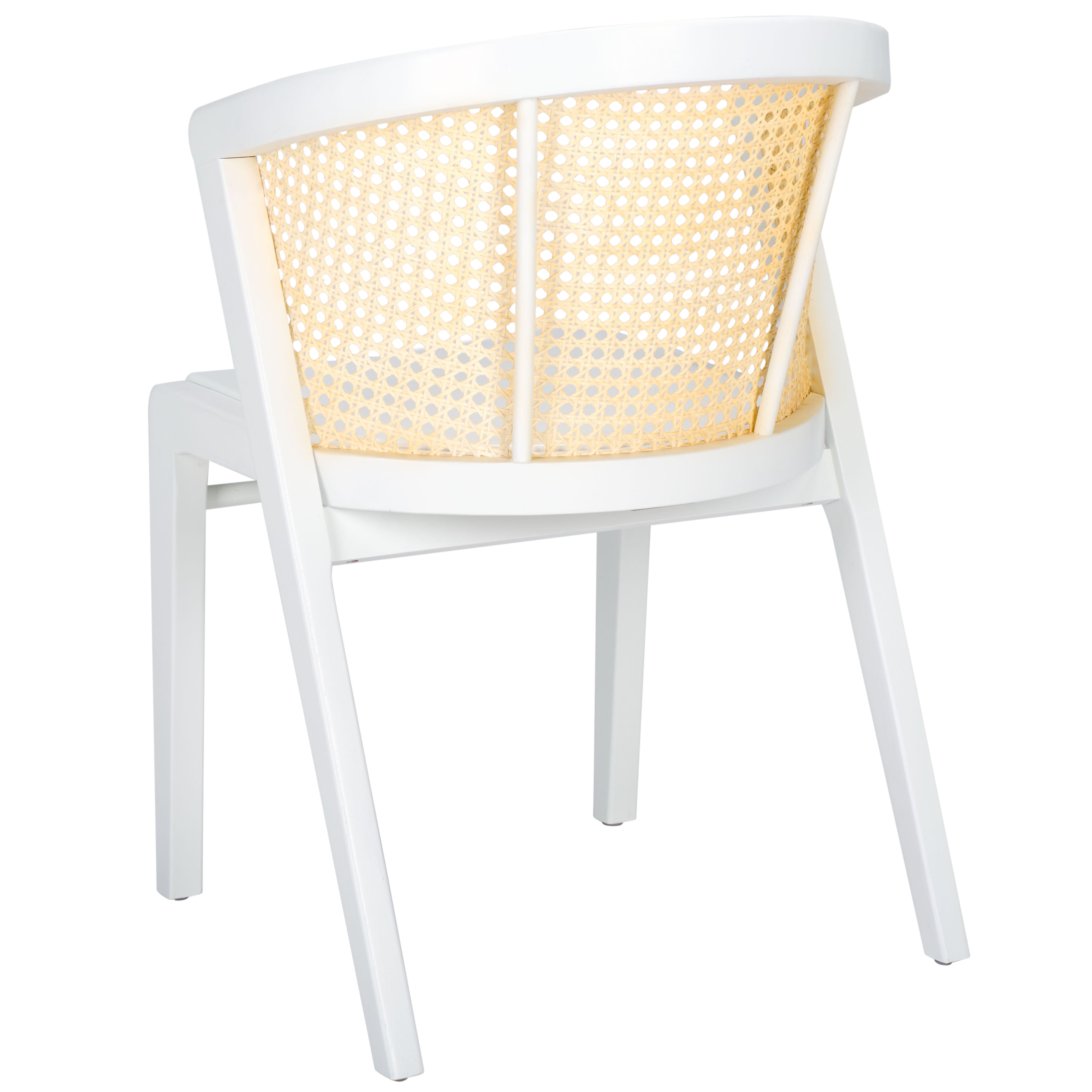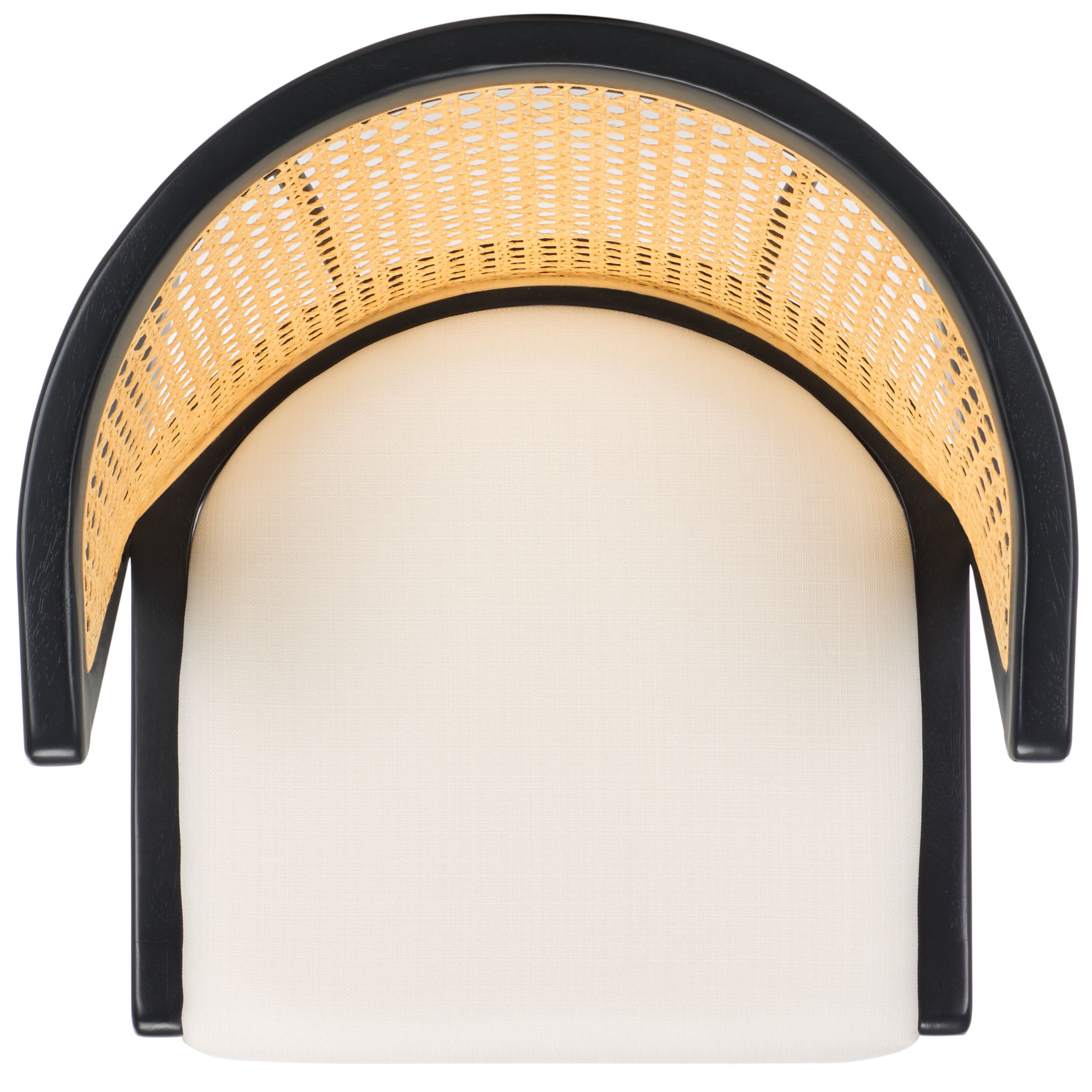 Liven up your home with the modern charm and breezy appeal of our Edan dining chair. Its mid-century modern appeal is combined with rich materials to add a cozy and fashionable edge to any room. The beautifully refined barrel back of the chair is updated with the rich texture of rattan. Crafted in solid wood, our dining chair enlivens any space with its warm and rich textural appeal. It includes a white padded seat to lend comfort and stylishly casual air to your kitchen, dining room, or living area.