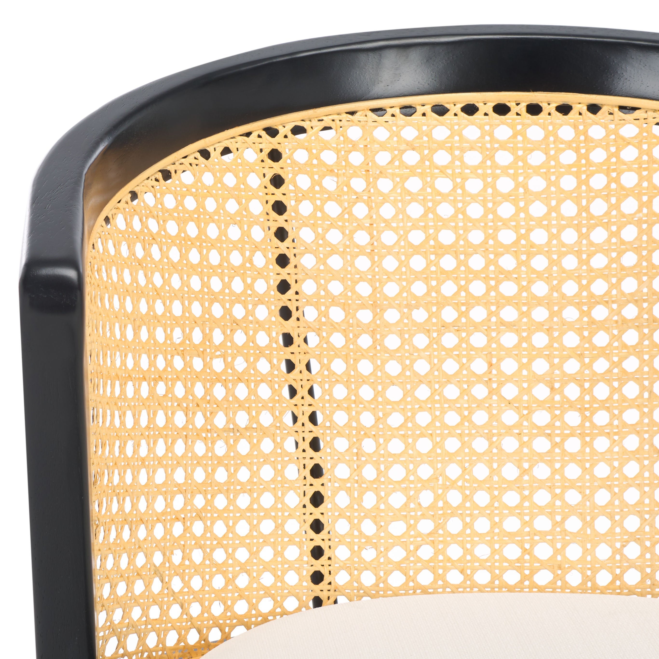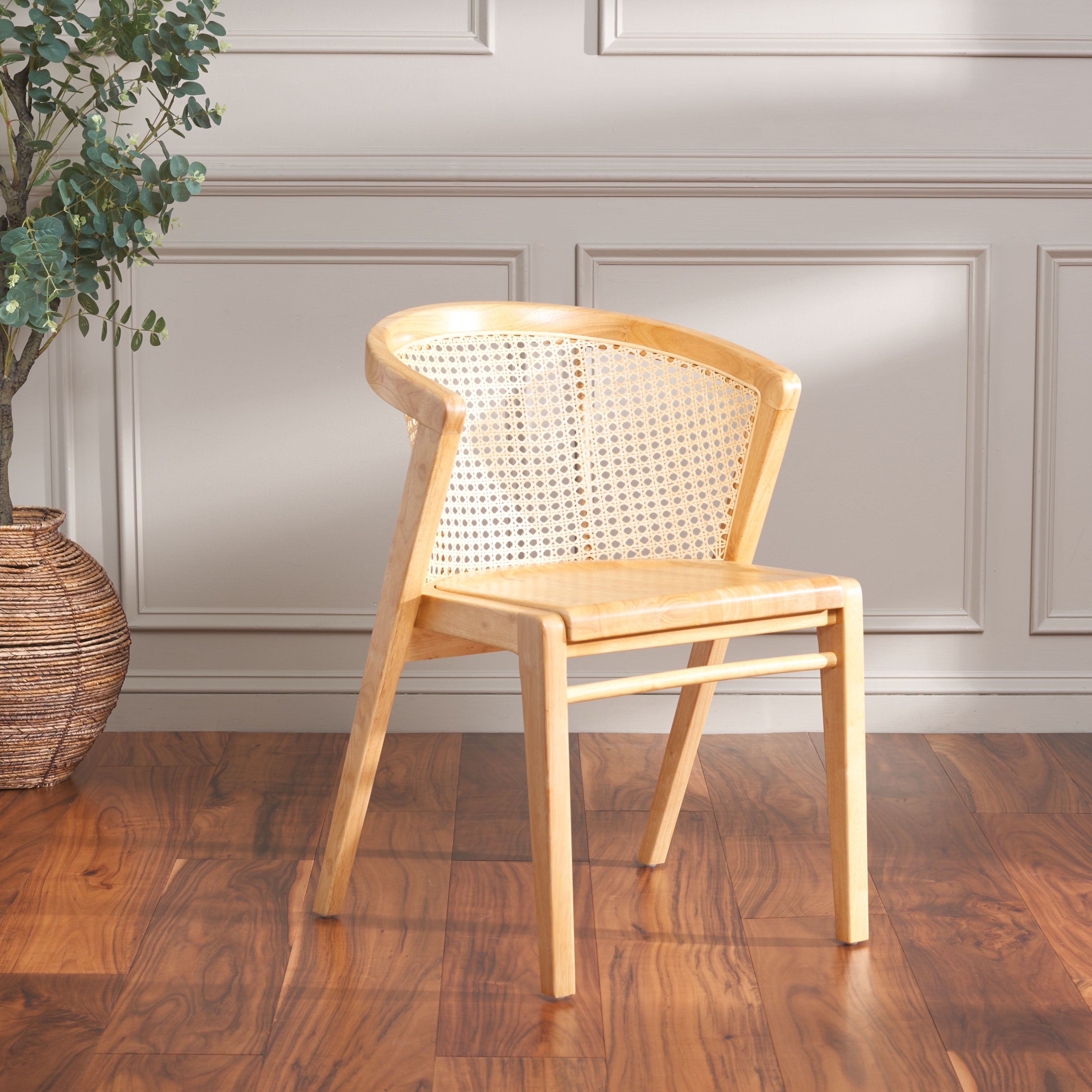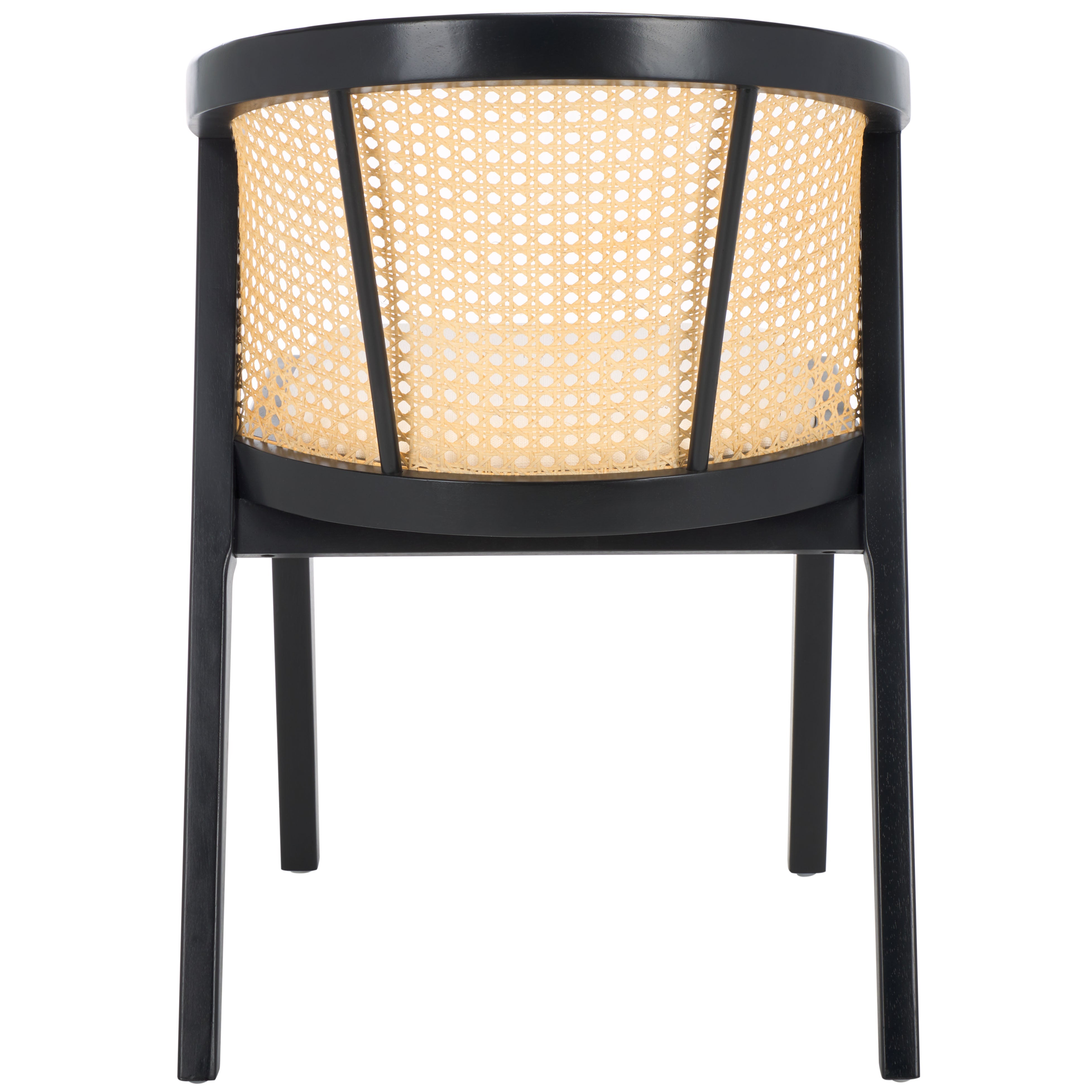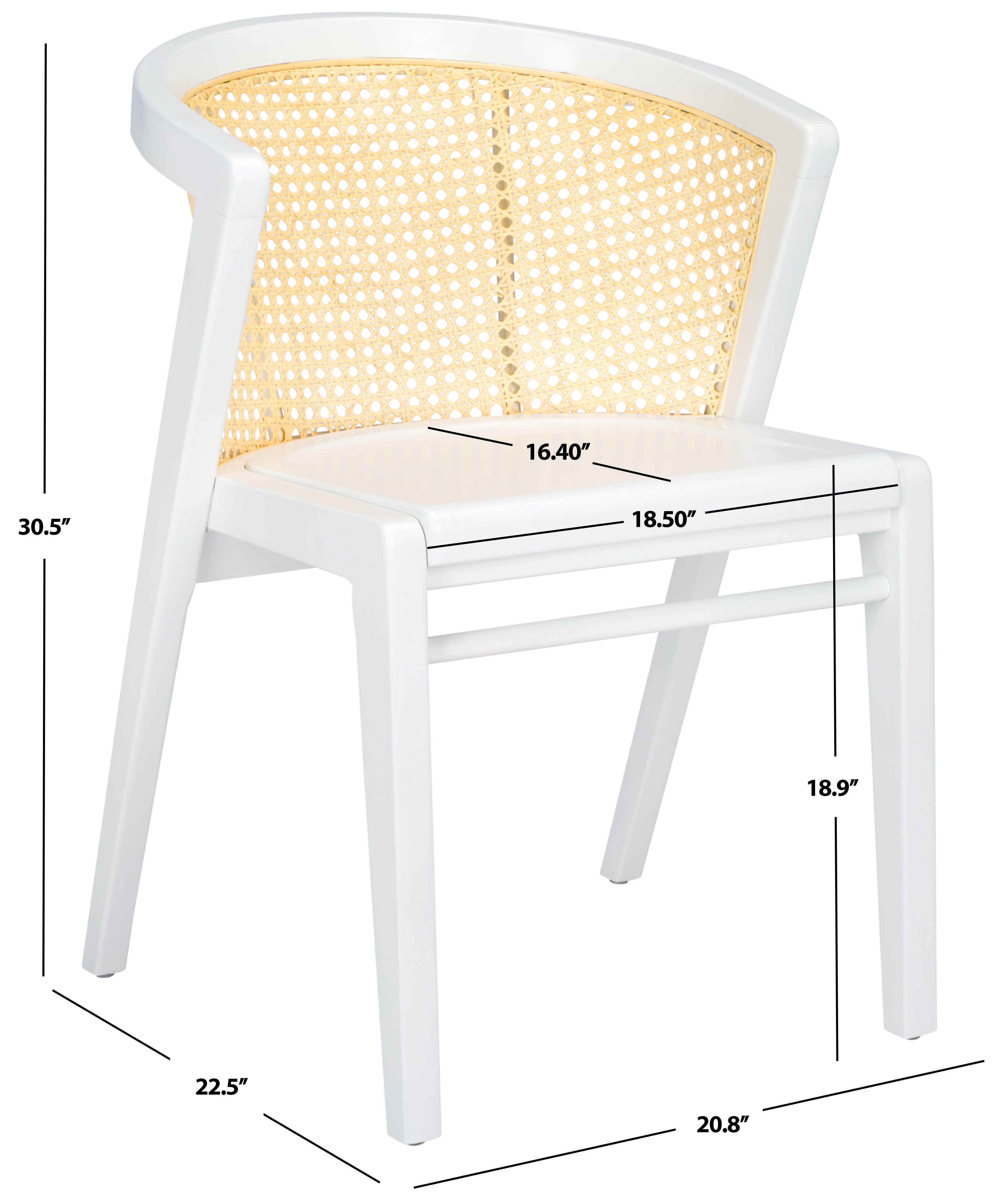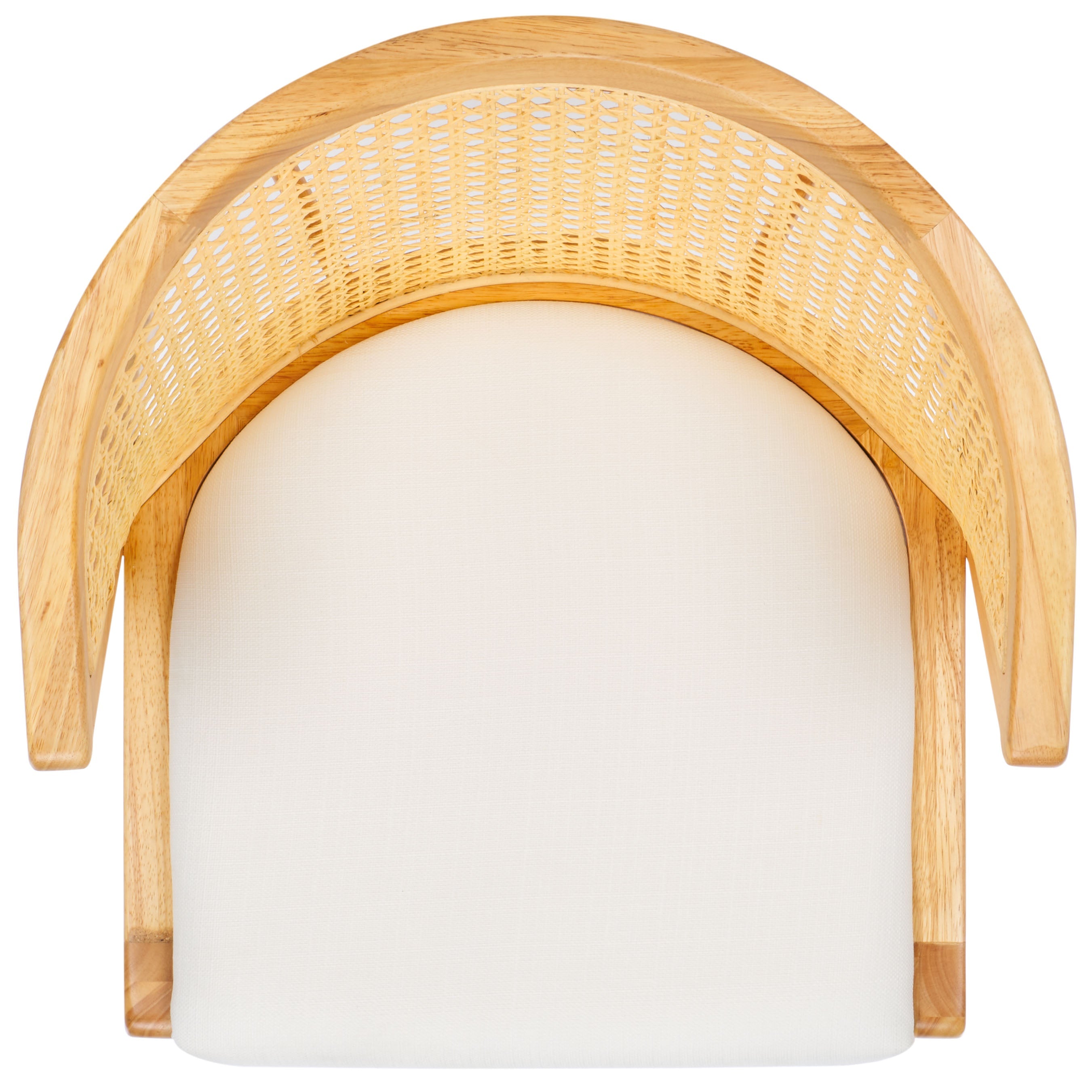 Liven up your home with the modern charm and breezy appeal of our Edan dining chair. Its mid-century modern appeal is combined with rich materials to add a cozy and fashionable edge to any room. The beautifully refined barrel back of the chair is updated with the rich texture of rattan. Crafted in solid wood, our dining chair enlivens any space with its warm and rich textural appeal. It includes a white padded seat to lend comfort and stylishly casual air to your kitchen, dining room, or living area.