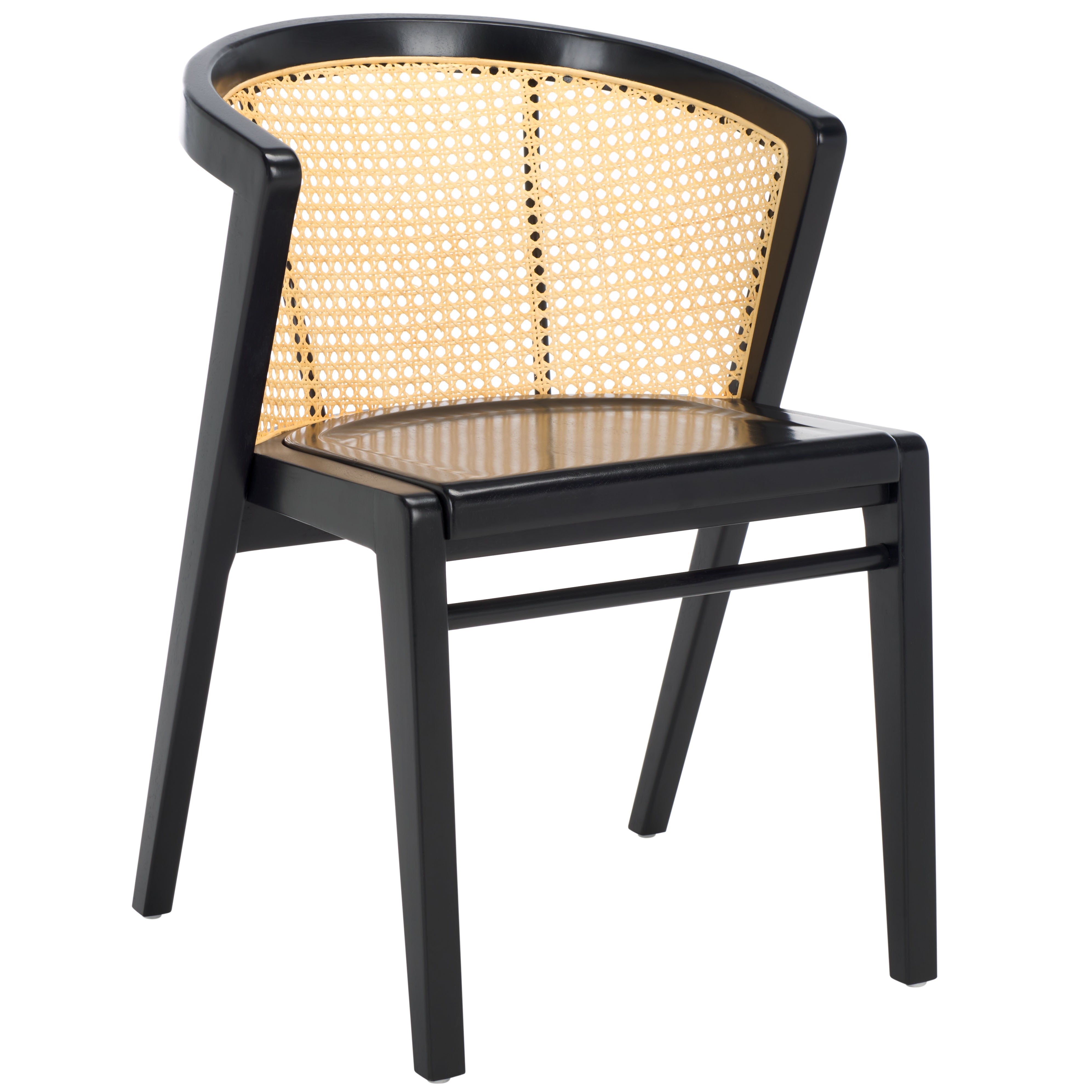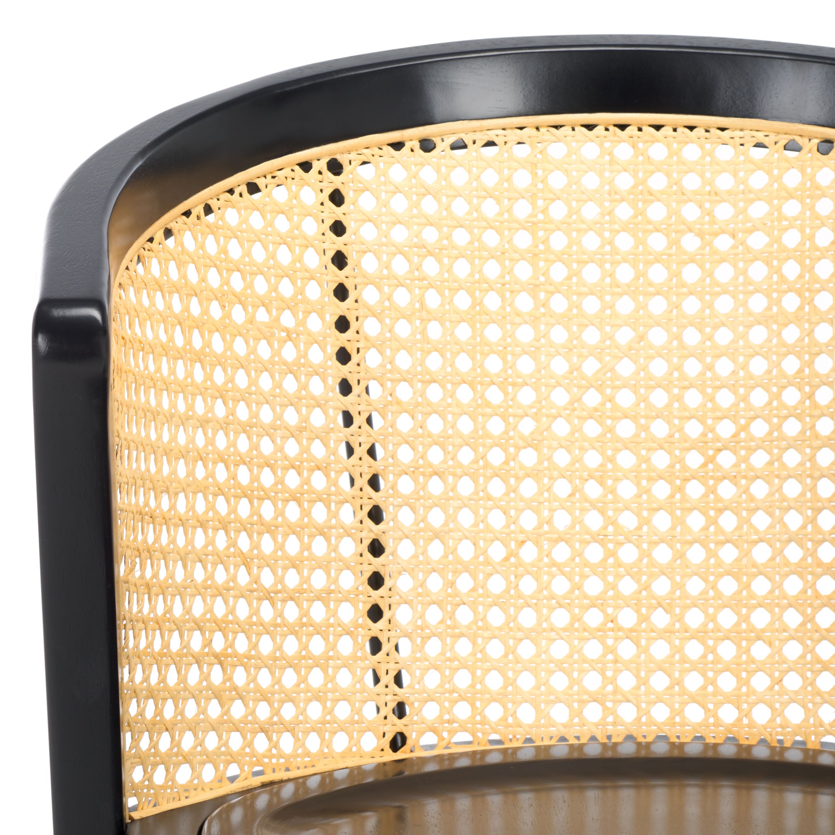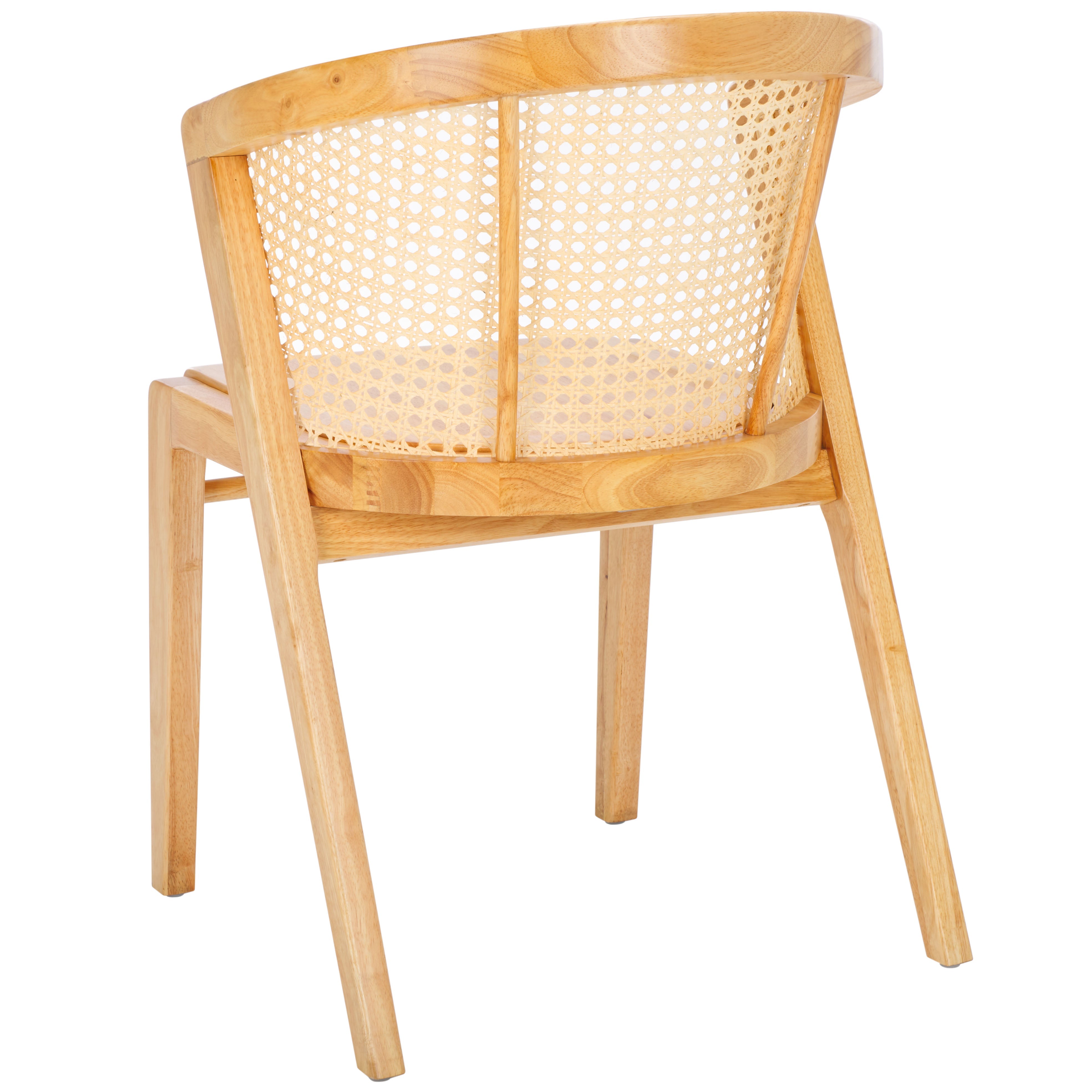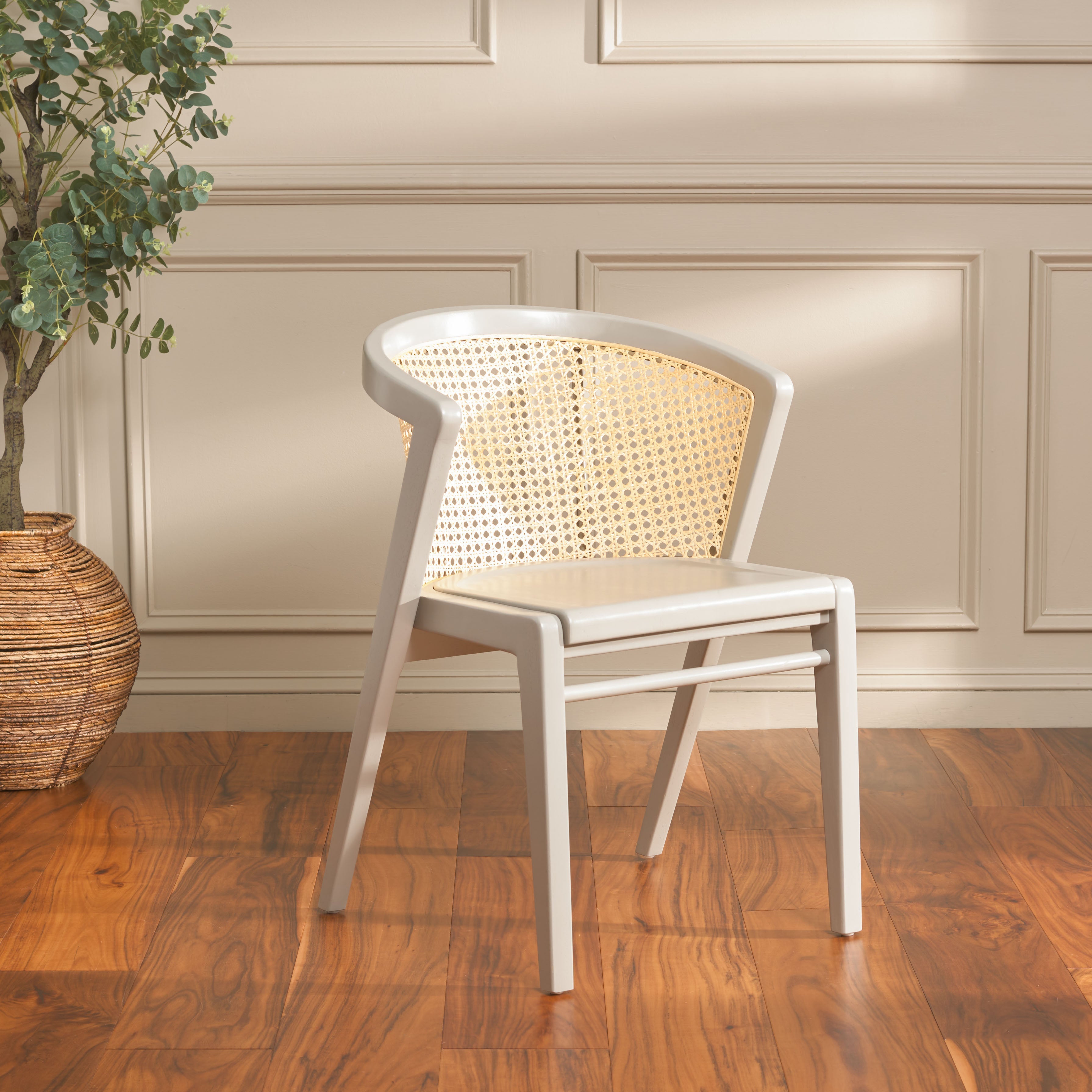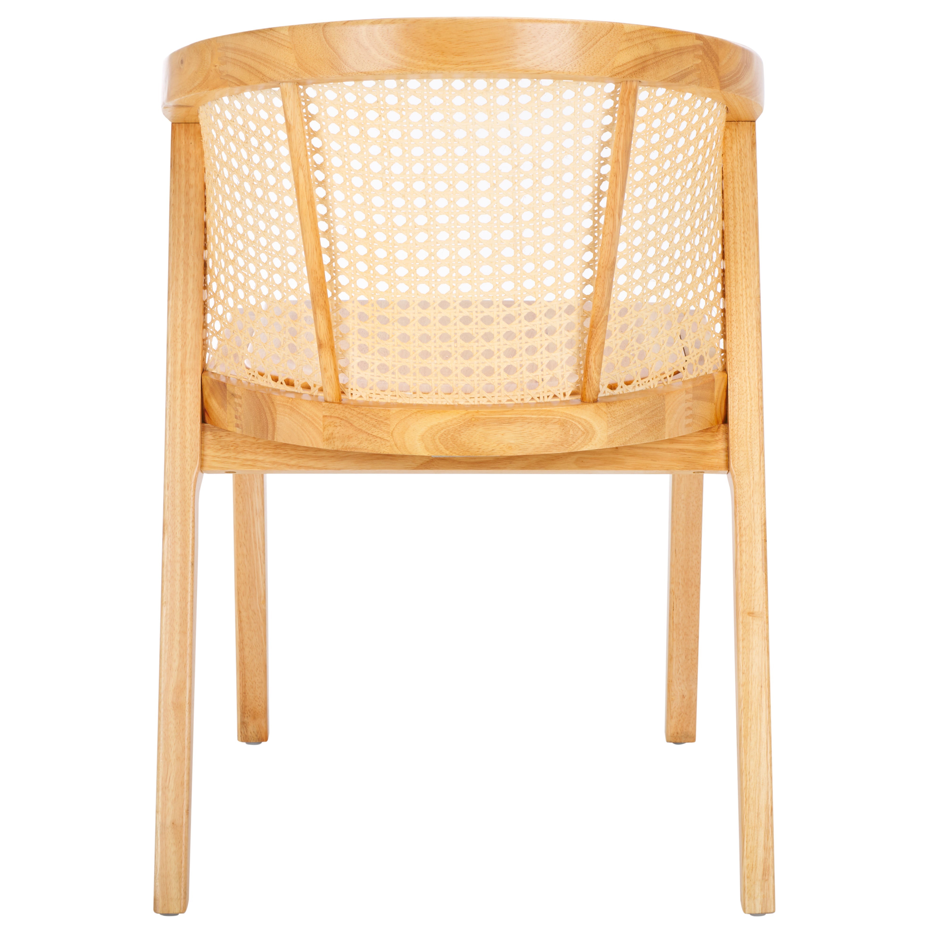 Liven up your home with the modern charm and breezy appeal of our Edan dining chair. Its mid-century modern appeal is combined with rich materials to add a cozy and fashionable edge to any room. The beautifully refined barrel back of the chair is updated with the rich texture of rattan. Crafted in solid wood, our dining chair enlivens any space with its warm and rich textural appeal. It includes a white padded seat to lend comfort and stylishly casual air to your kitchen, dining room, or living area.
