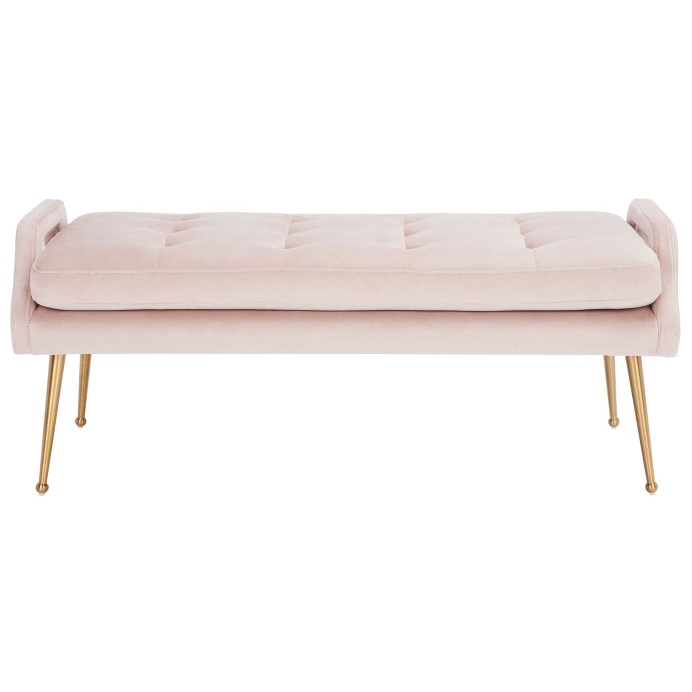 The ideal finishing touch to today?? contemporary furnishings, this Everdeen Bench exudes sophistication. Everdeen?? pink velvet pillow-top cushion and upholstered arms are ultra-soft to the touch, and sleek brushed gold legs elevate its aesthetic prowess. Channel tufted details complete the lavish look.