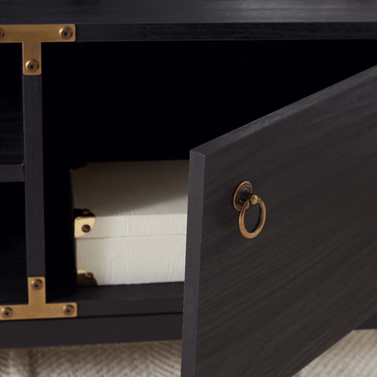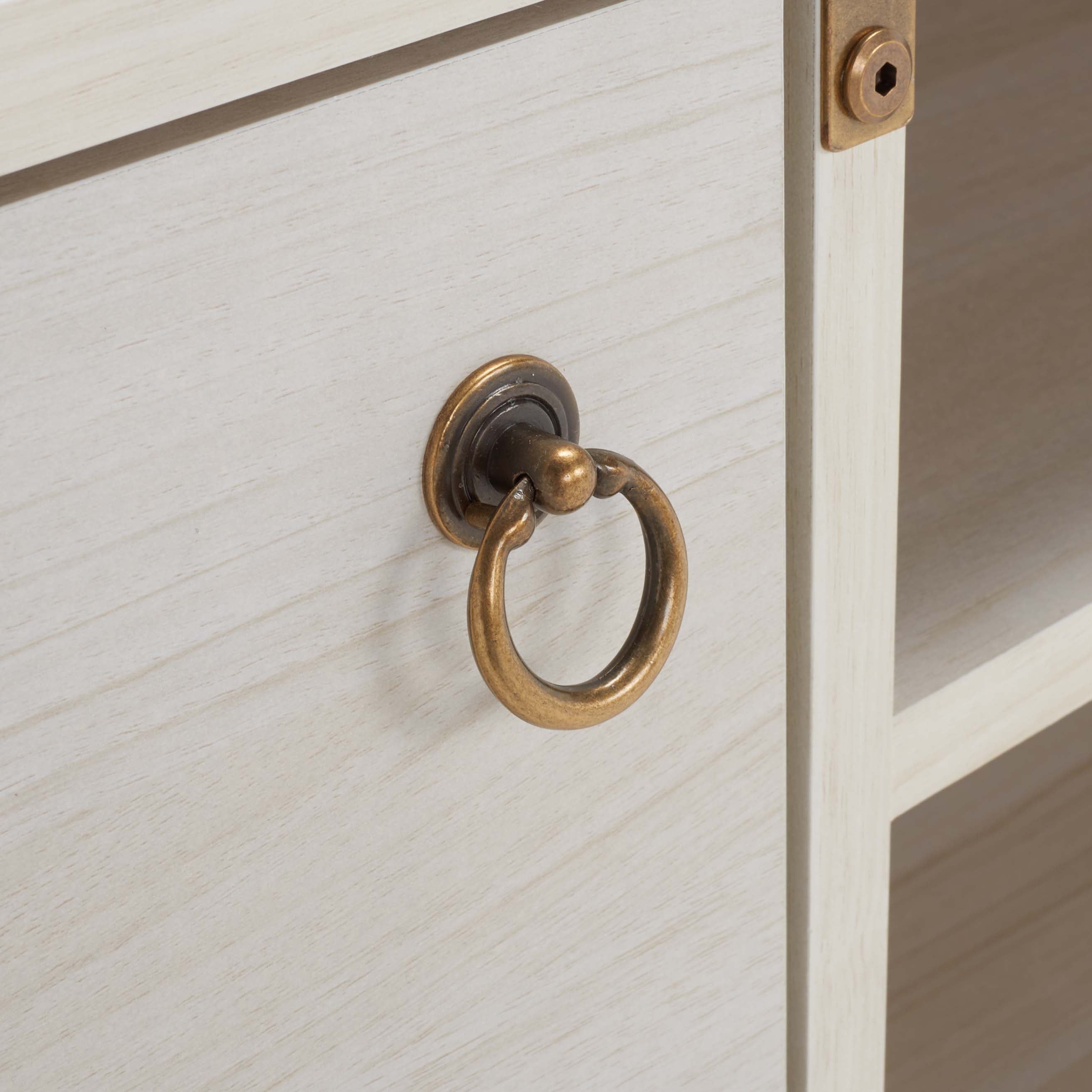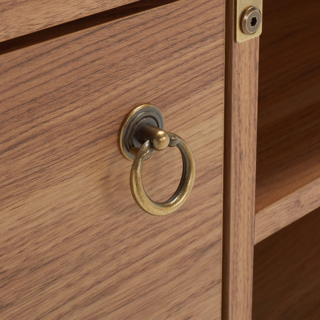 Add a dose of elegance and charm to your entertainment unit with our Galio media stand. Thoughtfully streamlined, the crisp and clean lines of our media stand boast timeless aesthetics. It is gracefully perched and adorns a rich walnut veneer to enliven your home. Being inspired by the effortless beauty of vintage style, our media stand is finished off with ring pulls and gold hardware on the edges. An elegant and timeless addition, the media unit features two cabinets and an open shelf to conveniently store your media components, board games, and other essentials.