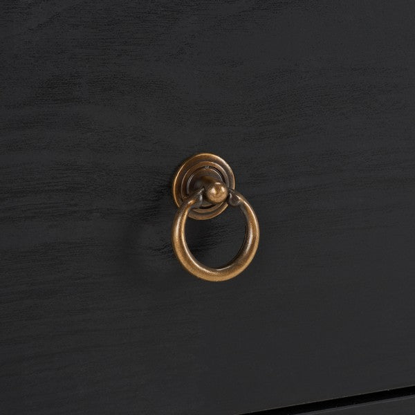 Organize all your essentials and belongings in our elegant and charming Galio chest. Thoughtfully streamlined, the crisp and clean lines of our chest boast timeless aesthetics. It is gracefully perched and adorns a rich black veneer to enliven your home. Being inspired by the effortless beauty of vintage style, our chest is finished off with ring pulls and gold hardware on the edges. An elegant and timeless addition, the chest includes three spacious drawers to serve as a practical storage solution for your living room, entryway, or bedroom.