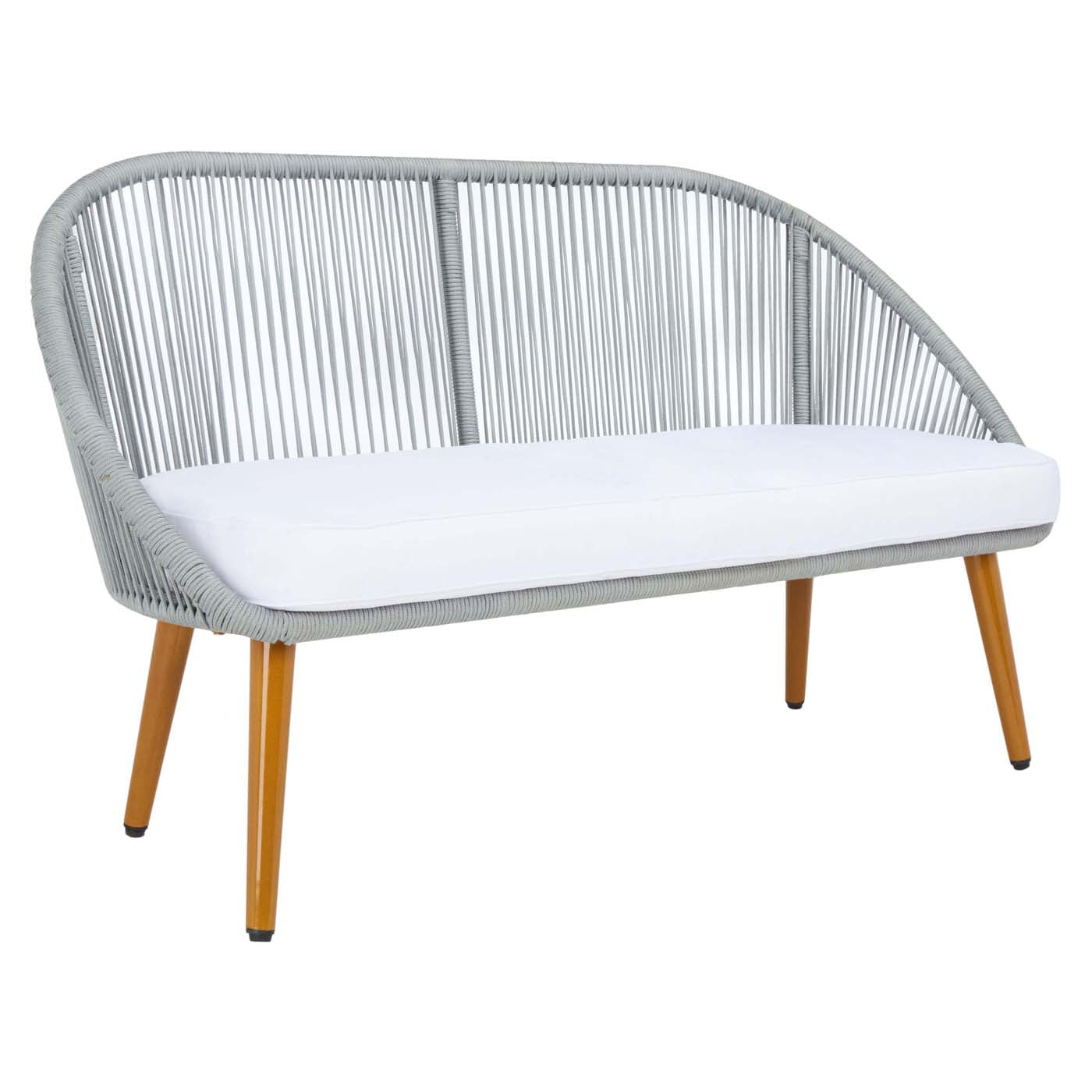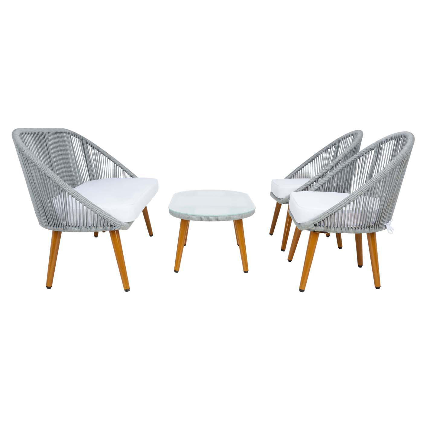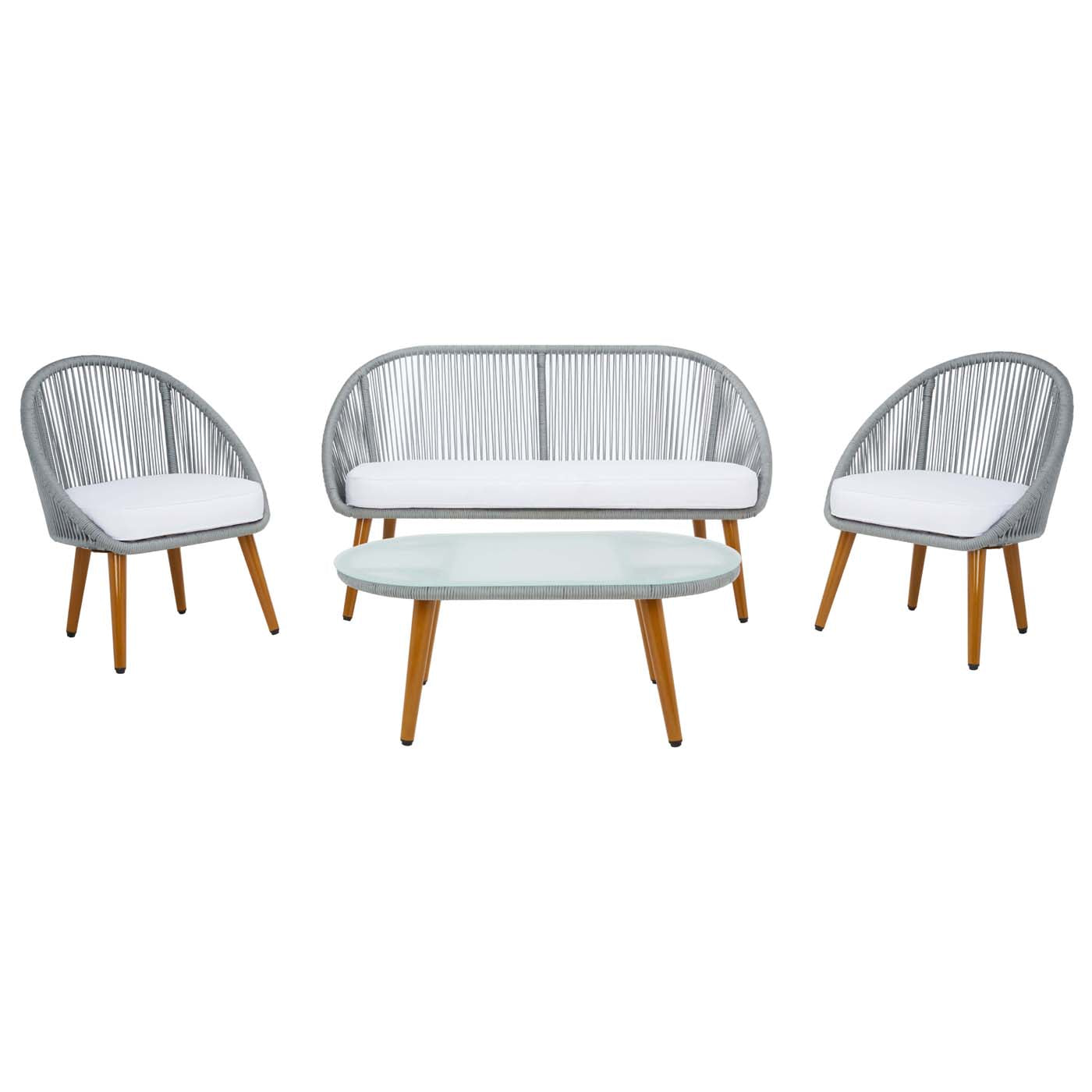 Flaunting hints of Mid-Century flair, this Halcott Living Set is a must-have for the stylish entertainer. The barrel-inspired silhouettes of Halcott?? two chairs and loveseat are given a thoroughly modern update with grey rope details, perfectly balanced by plush white cushions. Includes a glass-topped coffee table.