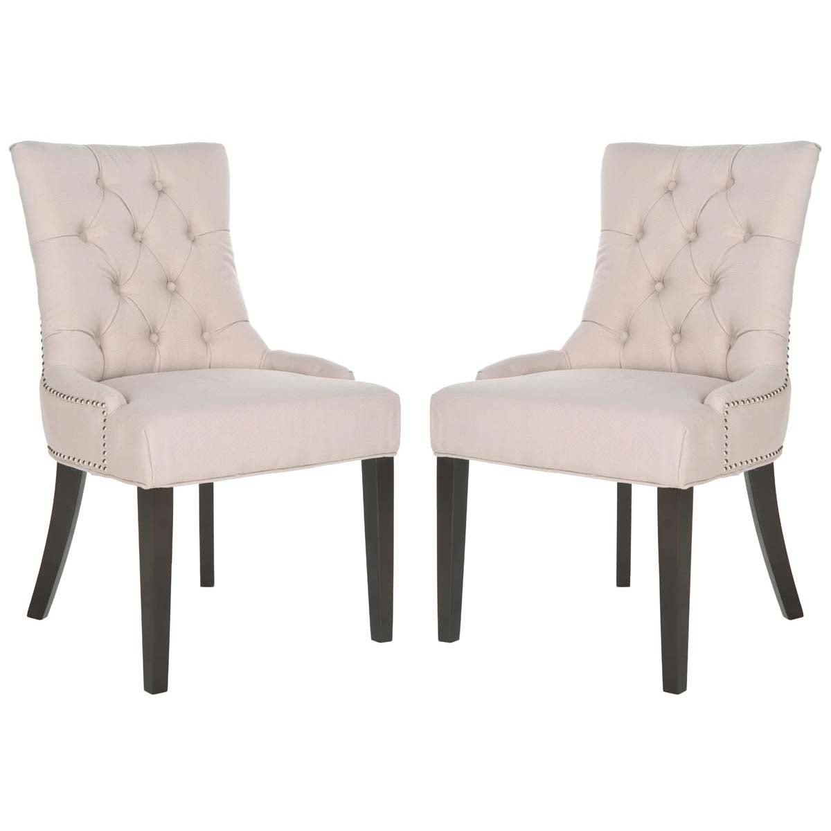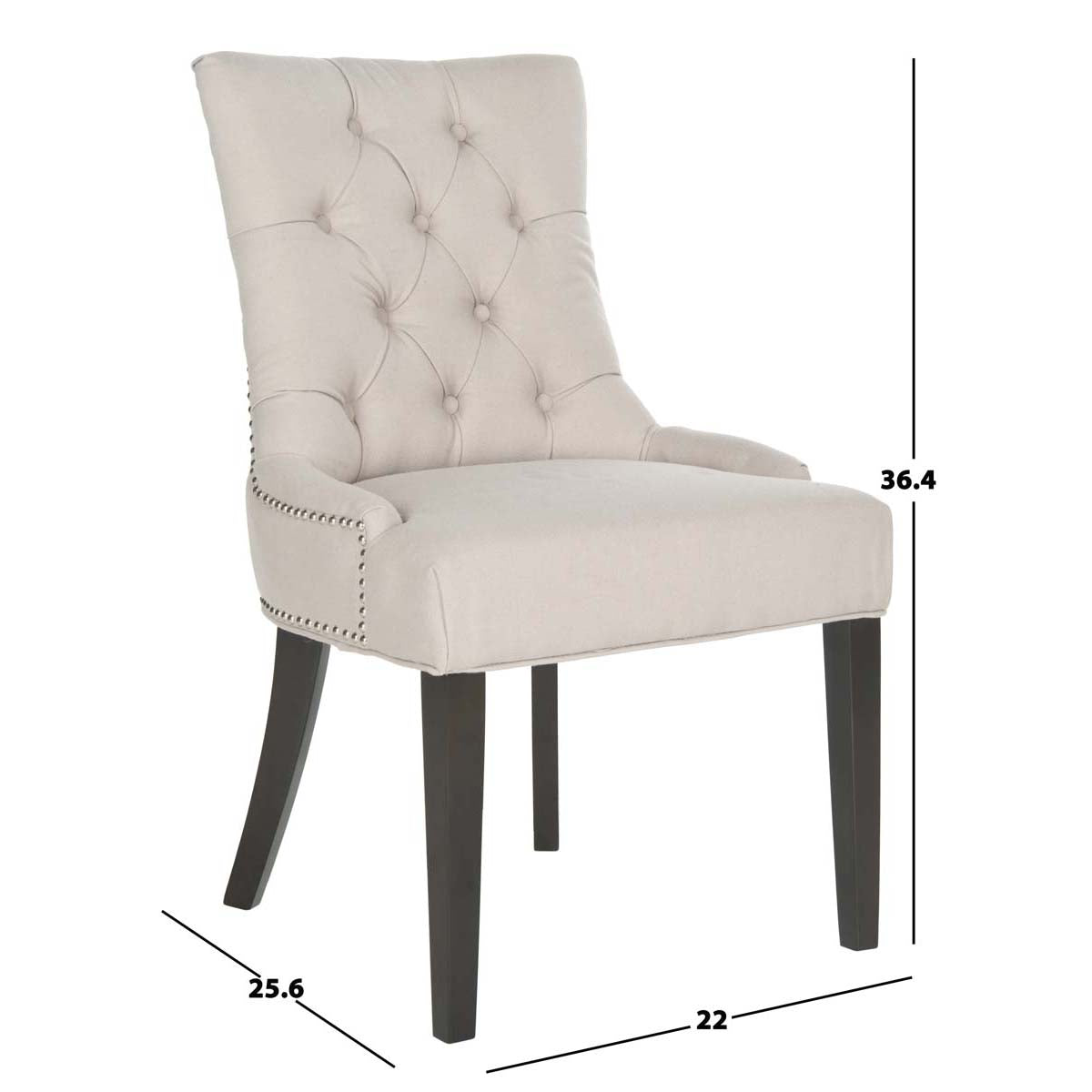 Brimming with designer details, the stylish Harlow ring chair by Safavieh transforms any dining room with instant glamour. Dressed up with silver nail heads and a clever metal ring on its back, Harlow is shown in taupe linen with birch legs in espresso. Button tufts on the front of the tapered backrest add to the allure of this set of two chairs.