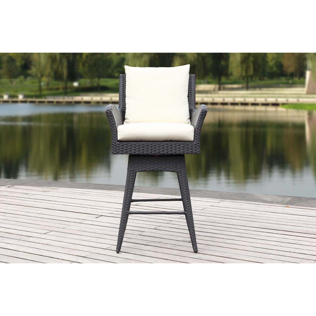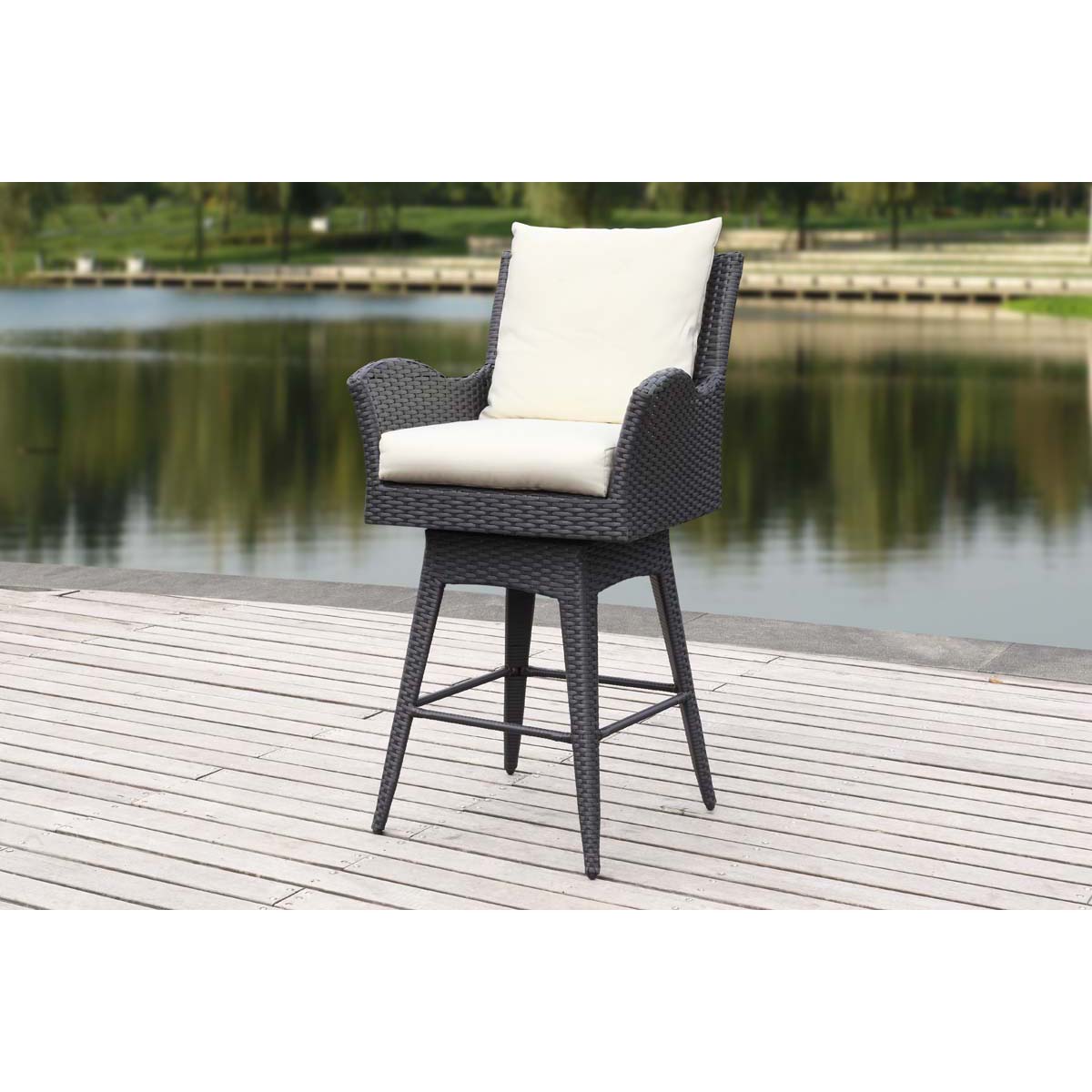 Versatile and stylish, this outdoor wicker swivel counter stool with arms is a must have for entertaining. Perfect for cocktails or canapes, guests love taking a spin on its plush upholstered seat. Designers adore its chic black construction and beige cushion.
