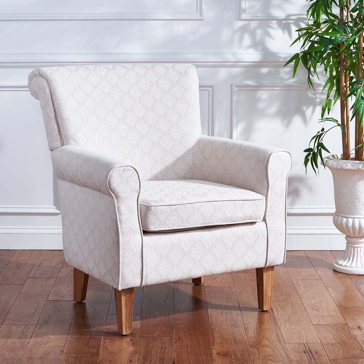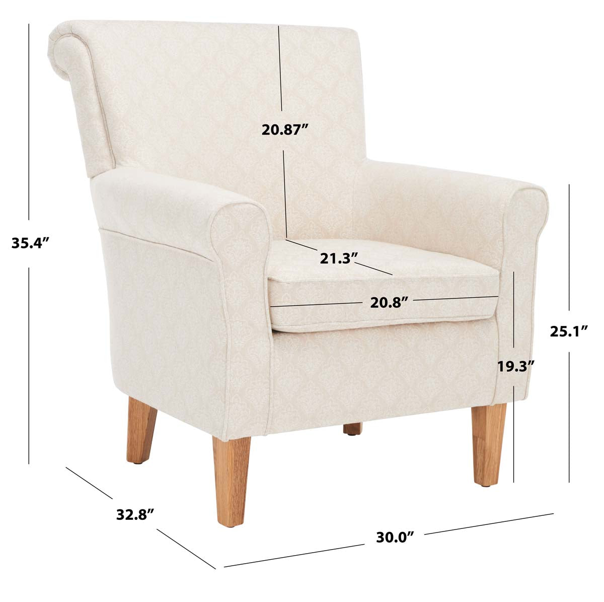 The Classic Roll Arm Of The Hazina Club Chair Gets Updated Thanks To A Fresh Interpretation Of A Timeless Beige Damask Pattern In A Luxurious Blend Of Linen And Viscose. Standing Atop Espresso-Finished Legs, Hazina Is Glorious In The Living Room, Family Room, Or Master Suite.