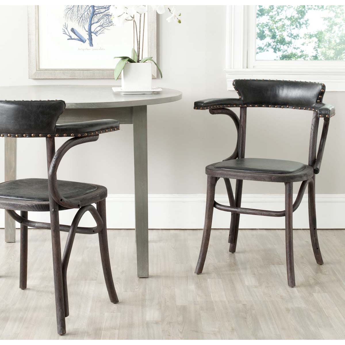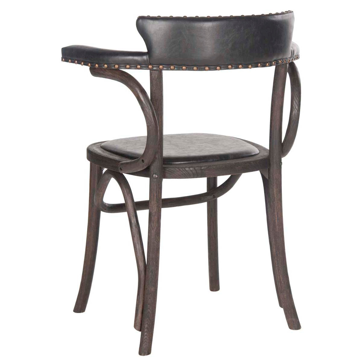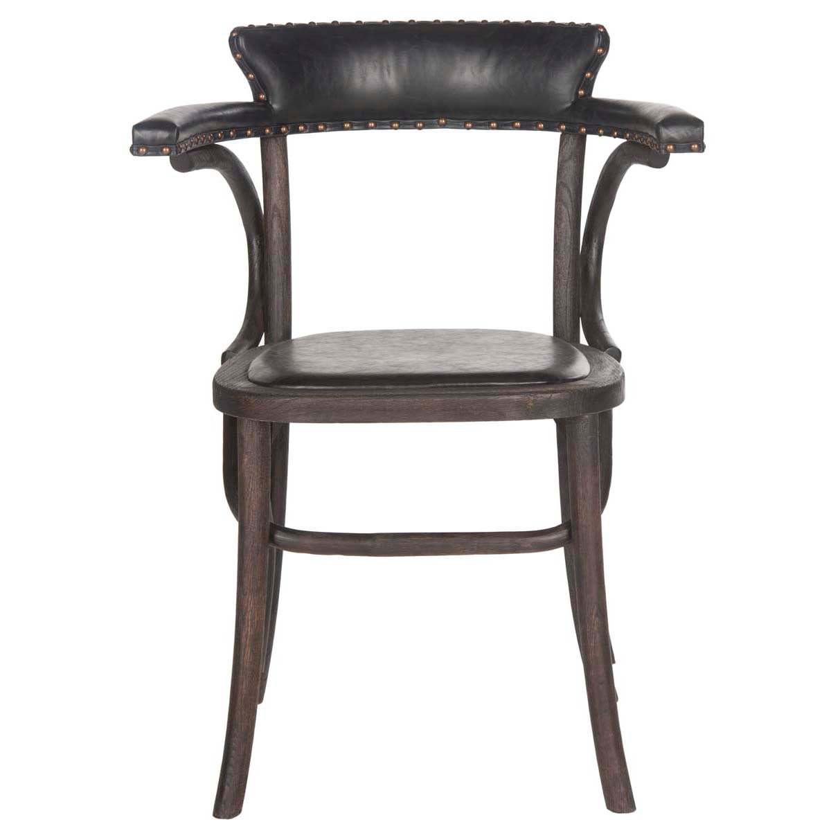 Blending country, retro, and industrial chic styles, the Kenny Arm Chair is reminiscent of Thonet bentwood seating. Crafted of oak in dark chestnut with antiqued black faux leather, this classic dining chair is finished with brass nail heads. Kenny is ideal for any kitchen breakfast nook or dining room.