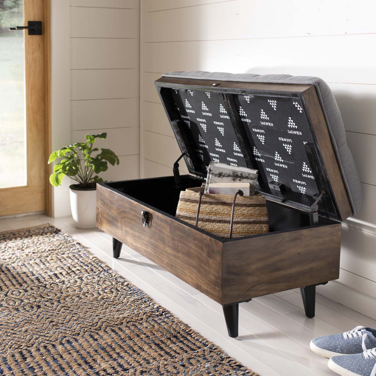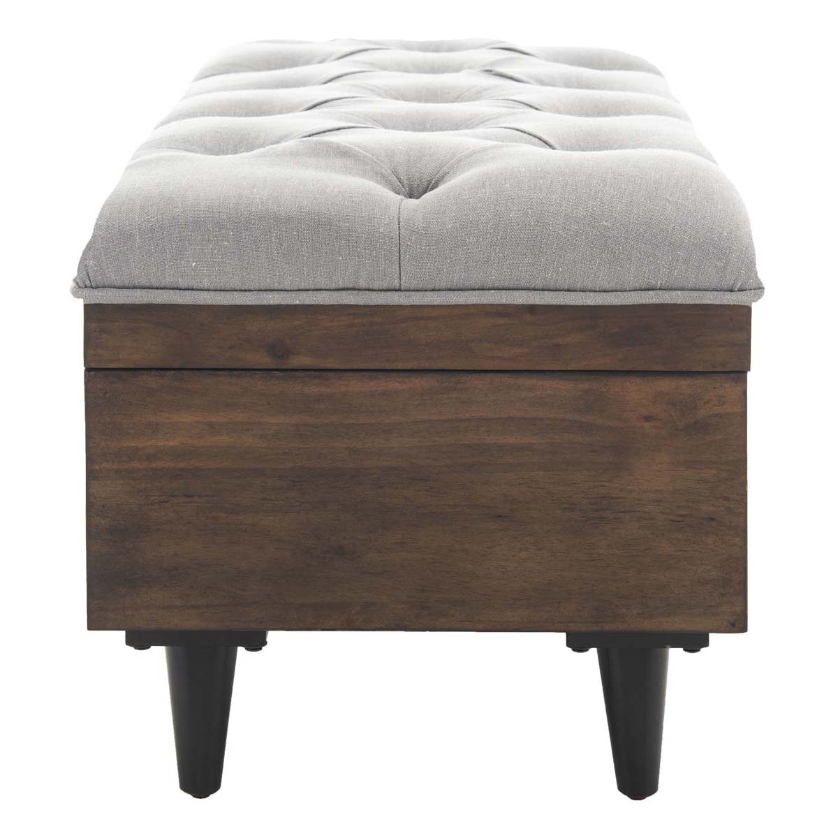 This modern tufted cocktail ottoman adds stylish seating and generous storage to any living room. Crafted with a classic dark oak finish, its generous grey linen upholstery features tufted details. Designers often use it as an impromptu tabletop.