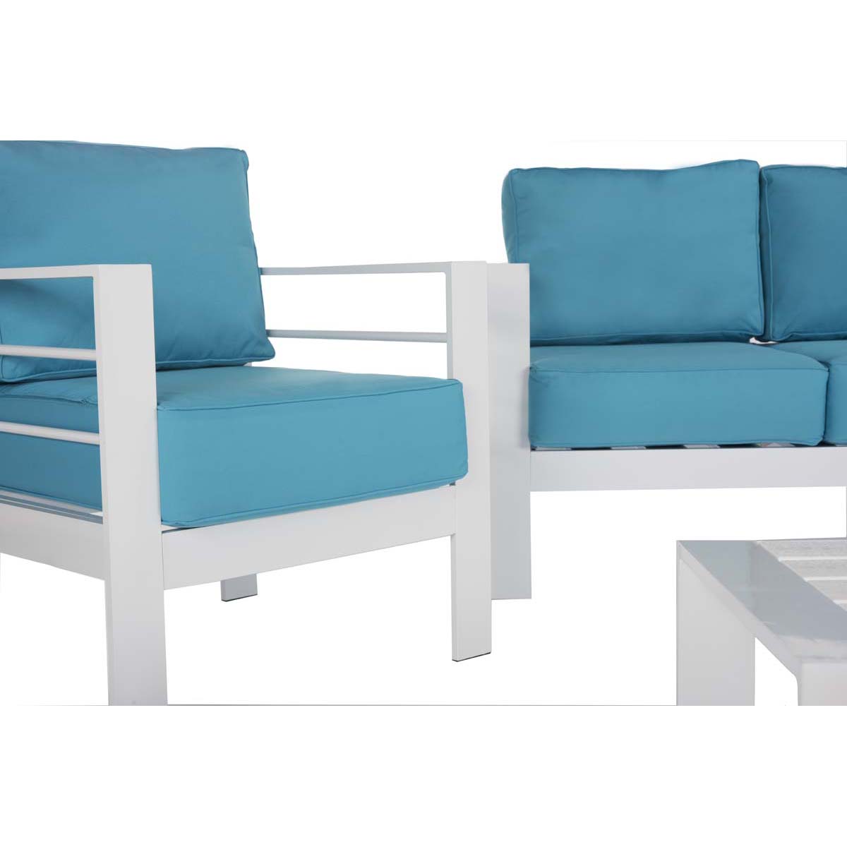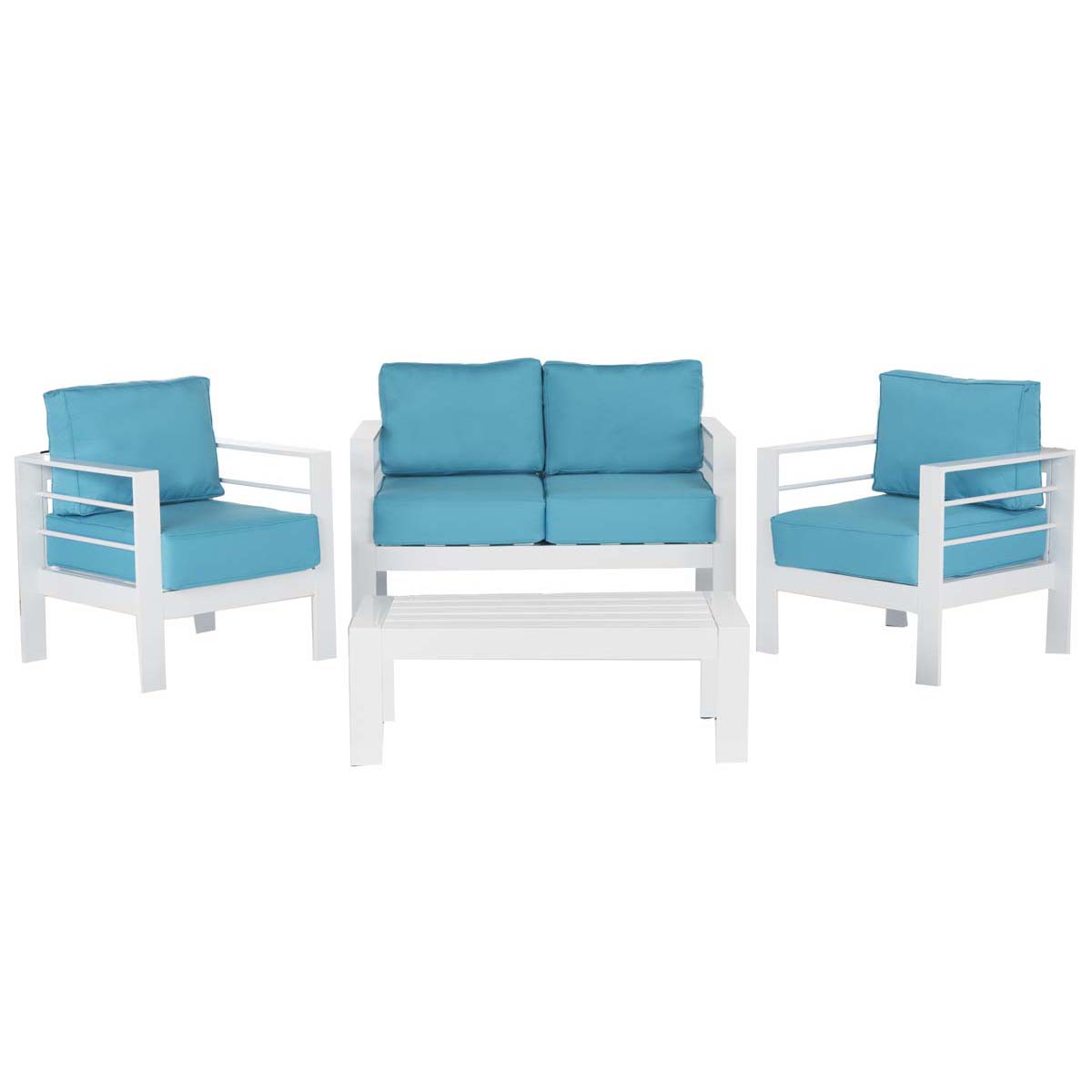 Smooth and sleek, this contemporary 4 piece outdoor living set was inspired by Madrid?? latest lounge destination. Its modern angles are paired with plush teal upholstery for a relaxed elegant seating. Its minimalist white table brings it all together.