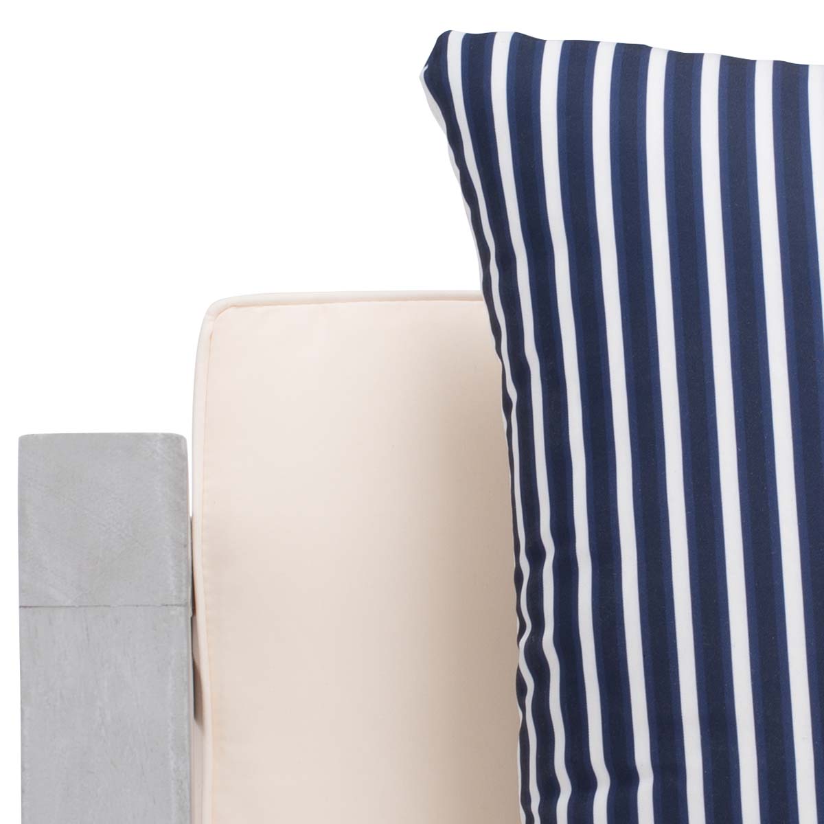 Update any outdoor living space with this contemporary 4 piece outdoor set. Finished in a chic grey hue to fit any d?cor style, designers love its modern cross back. Ideal for any outdoor entertaining, its plush beige upholstery and navy striped accent pillows make it a great investment.
