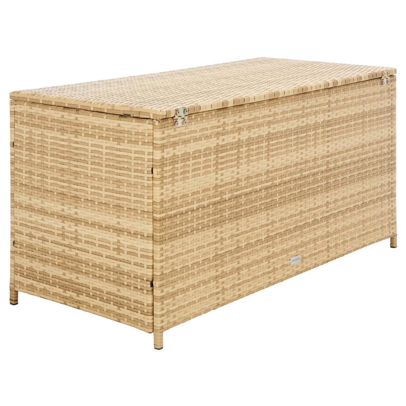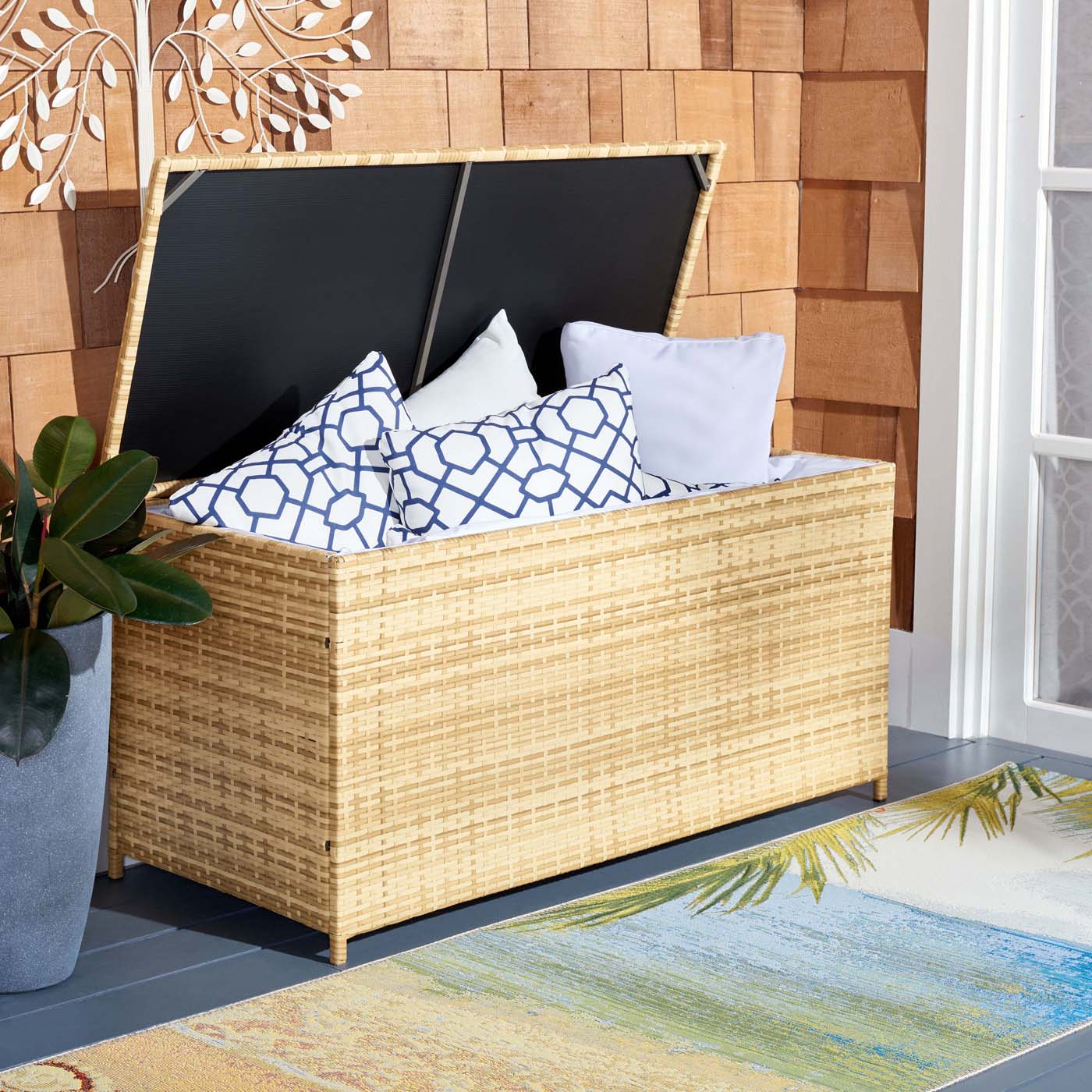 Outdoor storage is made effortlessly stylish in this Oliveira Box. A cushioned interior and gas lift top make Oliveira perfect for keeping more fragile outdoor accessories while a natural wicker frame gives it a warm modern look. Not intended for use as a seat.