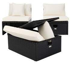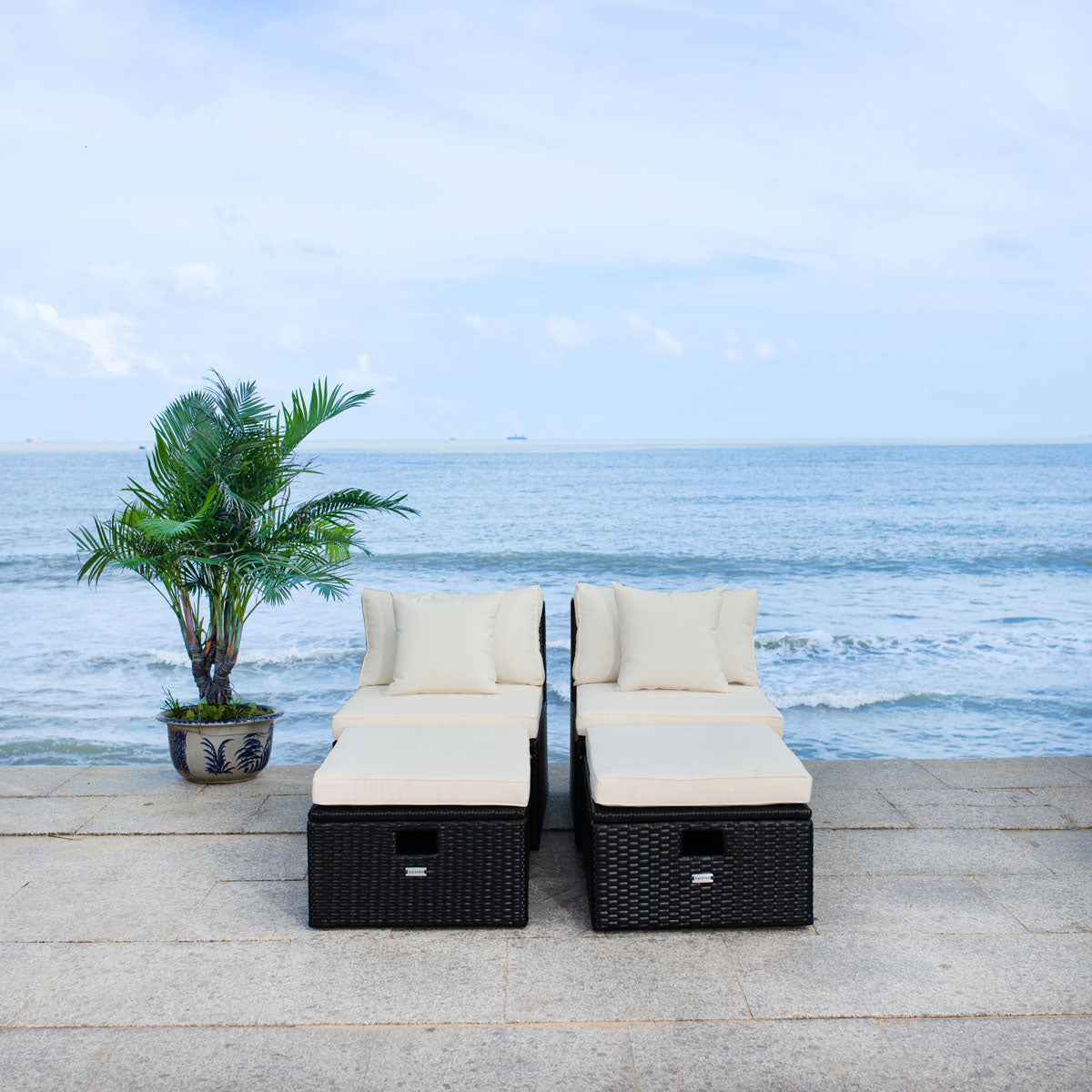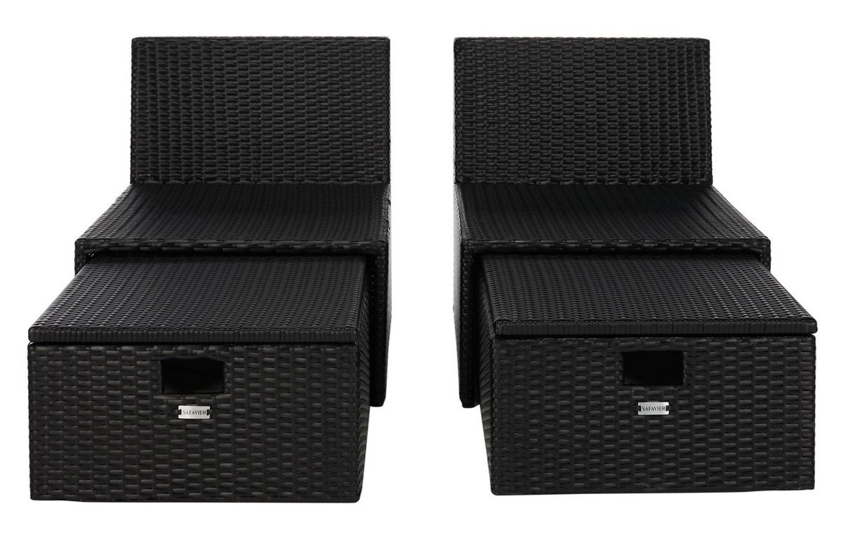 A brilliant blend of style and substance, this contemporary Pramla Set is the ultimate in dynamic duos. Crafted with a texture rich black frame and soft beige cushions, Pramla includes clever built in storage ottomans for smart and chic sunbathing.