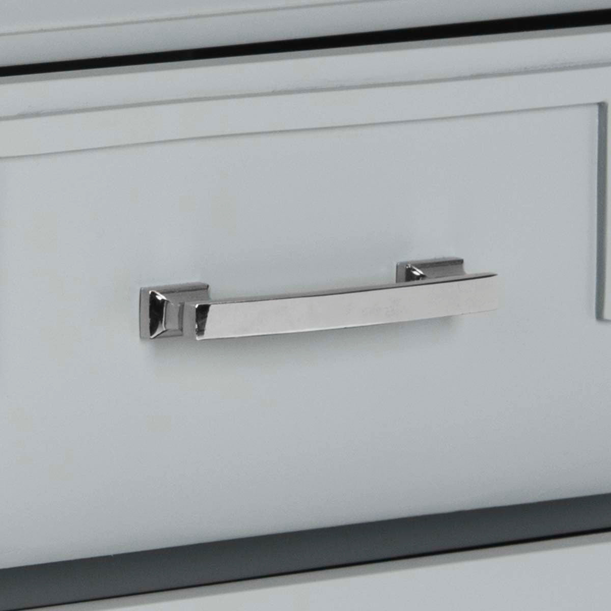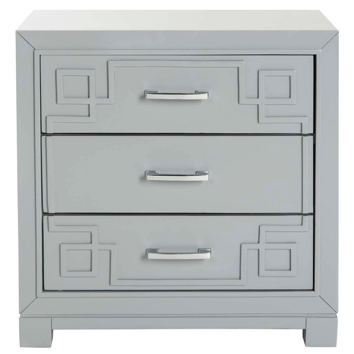 A fabulous display of modern sophistication, this Raina Three Drawer Nightstand exudes chic couture style. Raina's classic Greek key pattern is paired with a sleek grey hue and polished chrome hardware for matchless fashion flair.