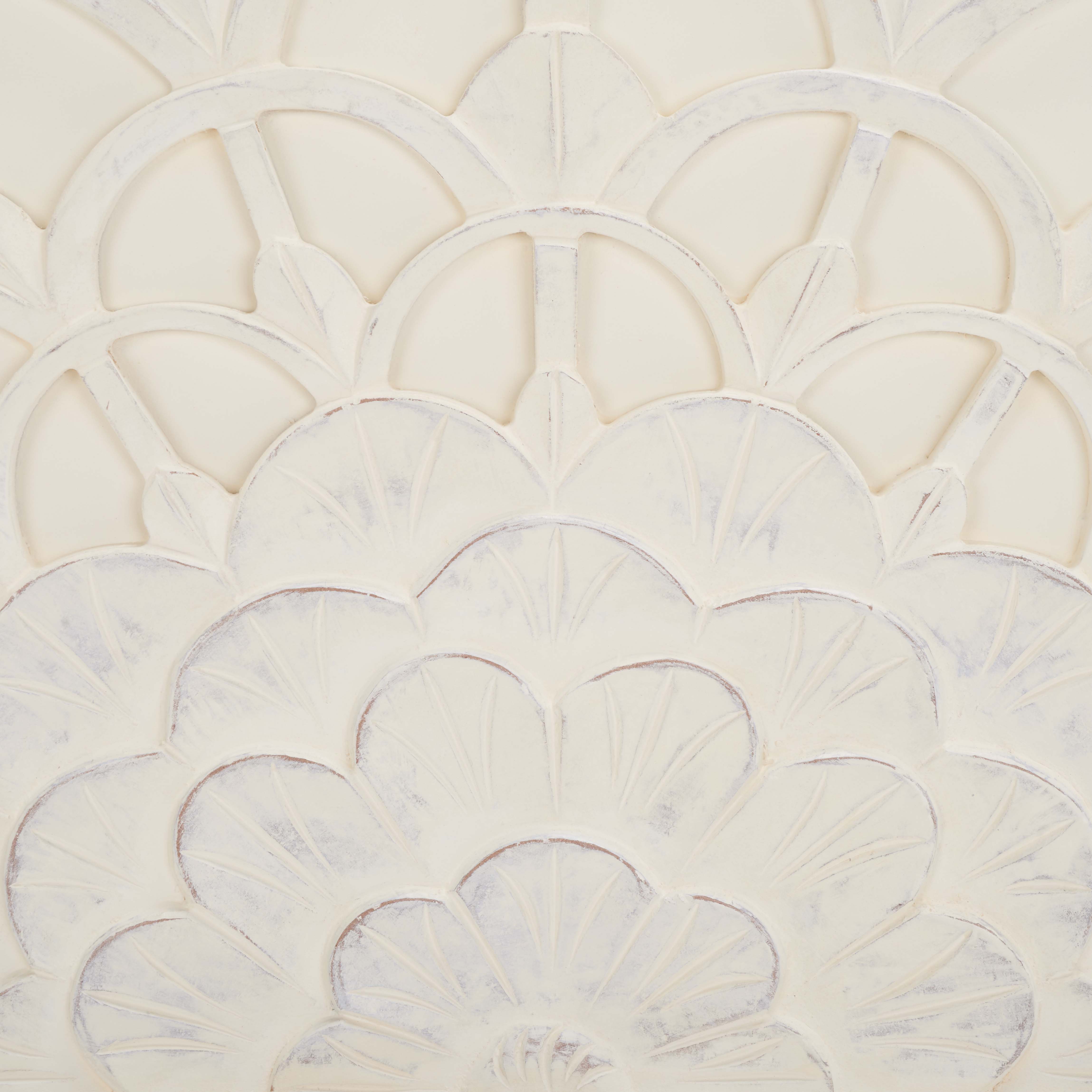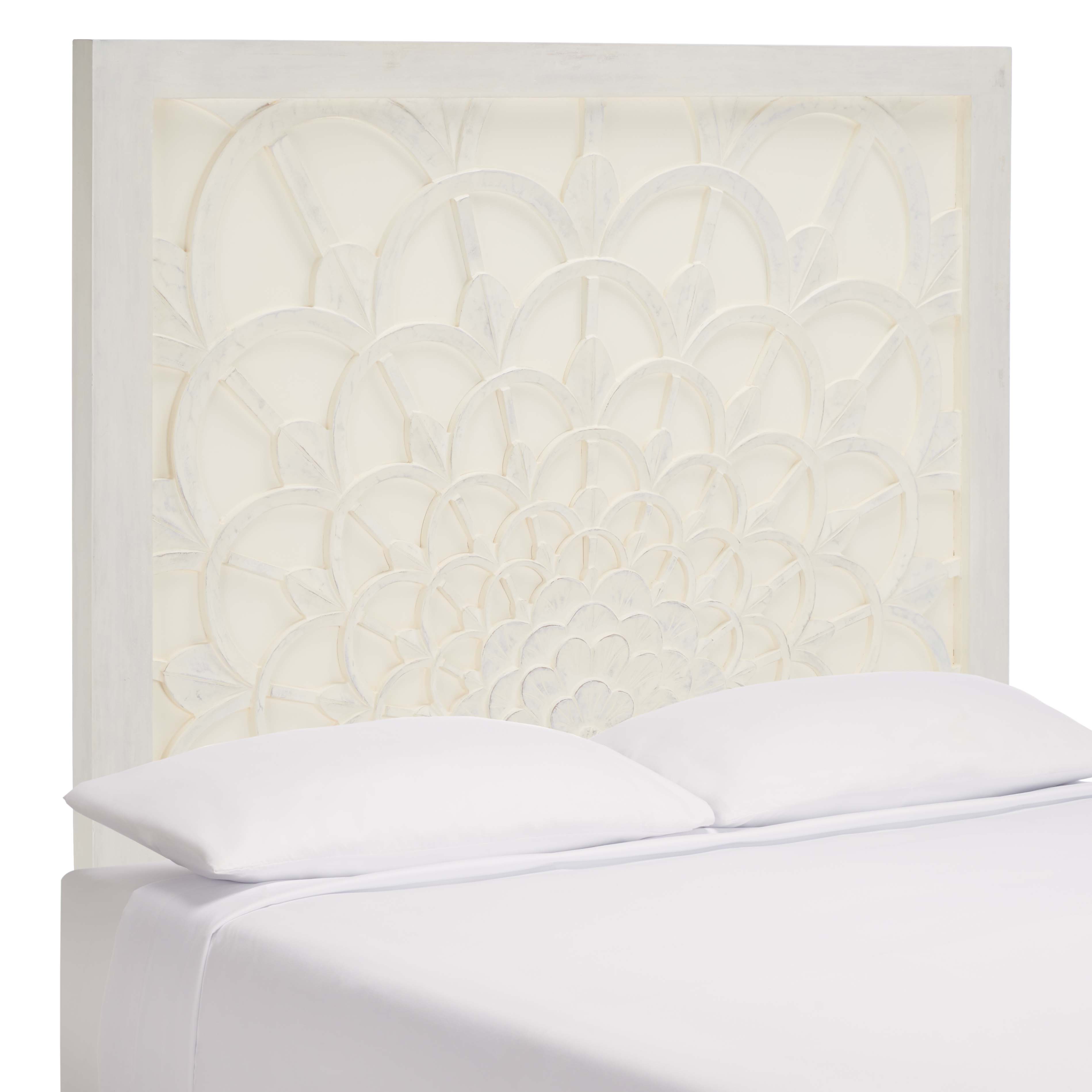 Give an artisanal update to your bedroom with our Richella headboard. Optically intriguing and intricate, the headboard is carved to deliver a dose of visual interest. It creates a strong sense of movement to become a stunning focal point of your bedroom. With a beautiful ivory-washed finish, our headboard remains a graceful and charming addition. It showcases a beautiful play of light and shadow, especially when placed in natural light.