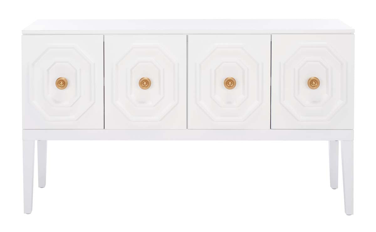 Chic and sophisticated, this Riya Sideboard is simply spectacular. The carved concentric octagonal details on Riya?? four doors are perfectly punctuated by glimmering gold pulls, and its clean white finish seamlessly accents any room?? color palette.