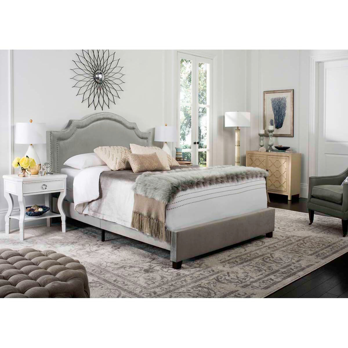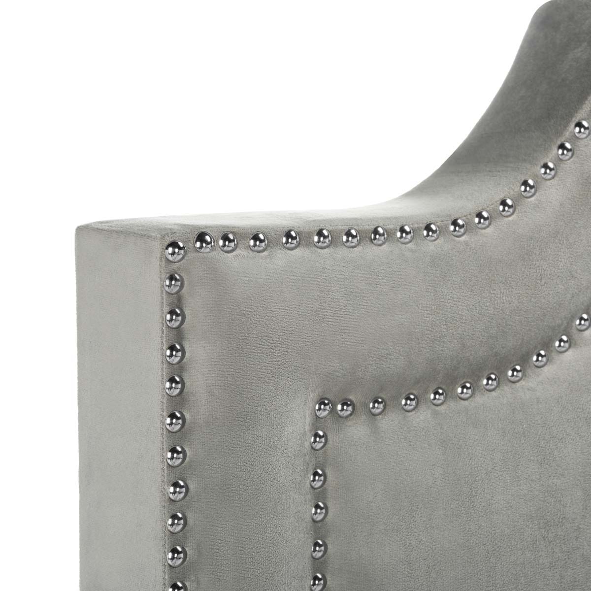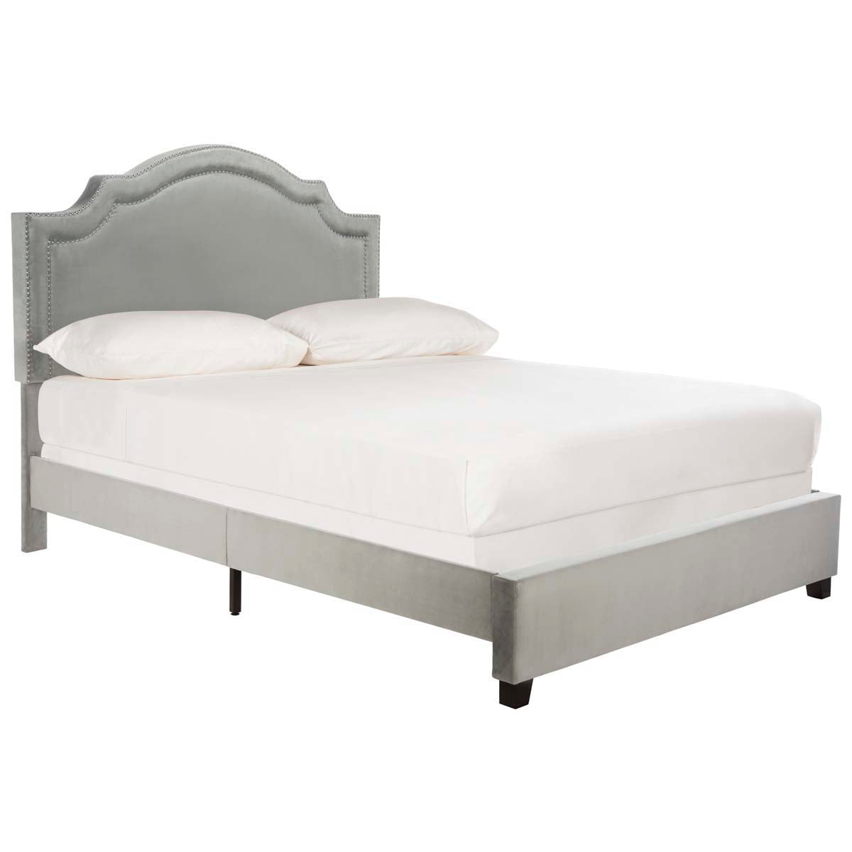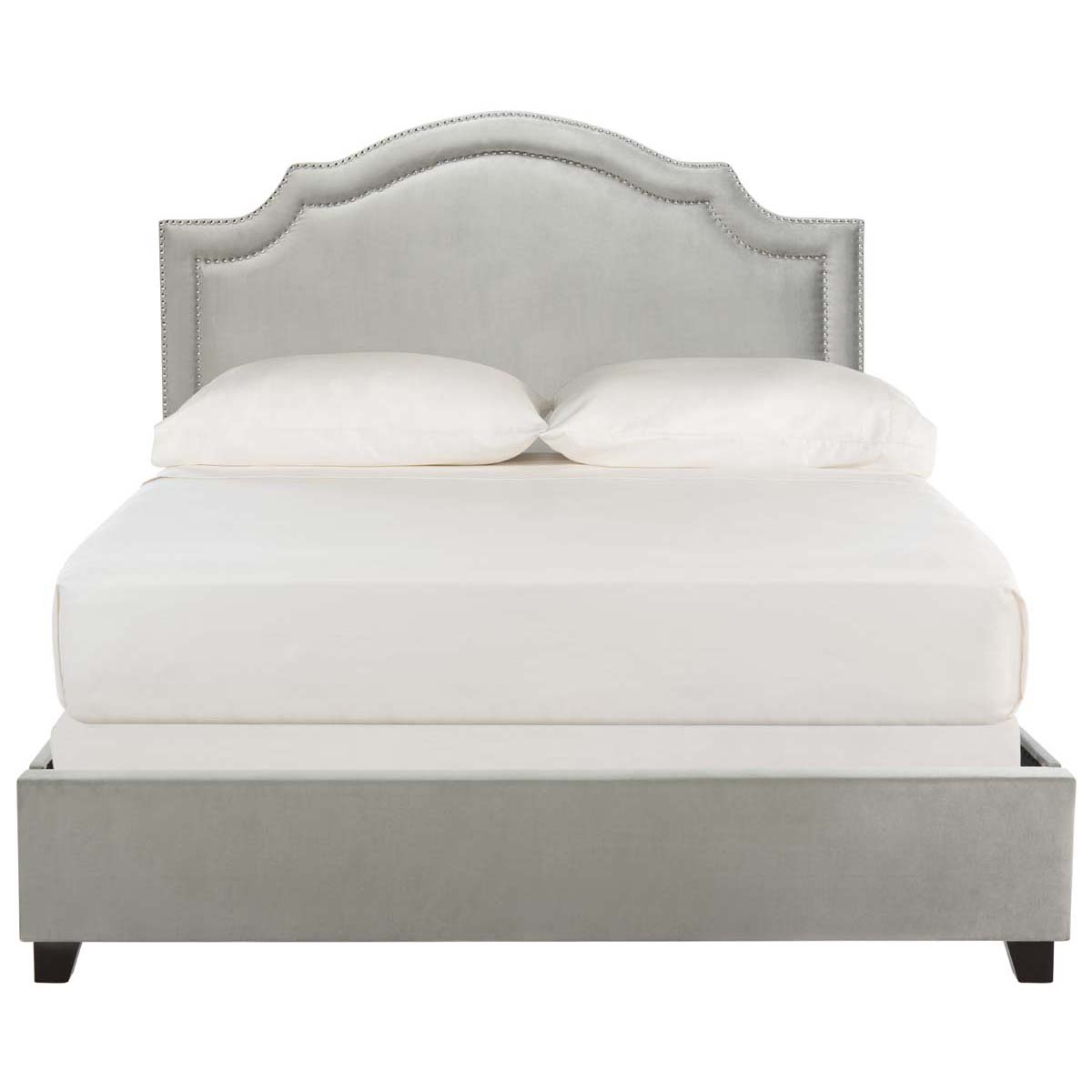 Upholstered from head to toe, this romantic bed speaks to modern elegance with refined lines and gracious curves. Its headboard and frame covered in grey velvet fabric get a designer look with silver nailhead trim and front feet in espresso.,Upholstered from head to toe, this romantic bed speaks to modern elegance with refined lines and gracious curves. Its headboard and frame covered in grey velvet fabric get a designer look with silver nailhead trim and front feet in espresso.