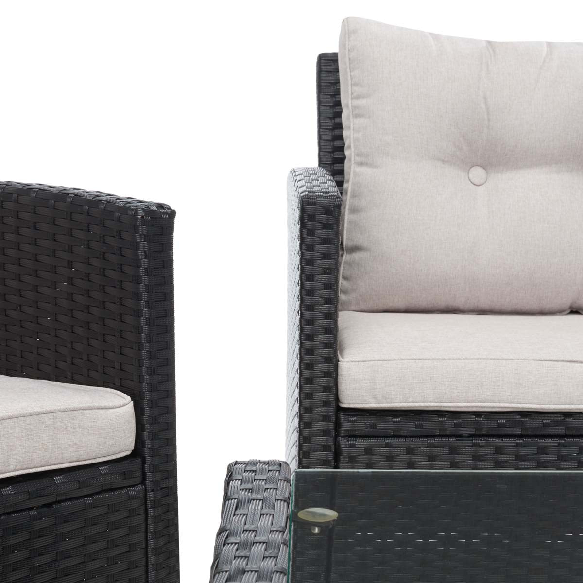 Life?? a beach, and with this Vellor Living Set you??l be sure to bring this relaxed coastal lifestyle to the porch or patio. Vellor comes with two armchairs and one loveseat in black and topped with plush light grey cushions, enticing you to find the perfect arrangement around its glass-topped coffee table.
