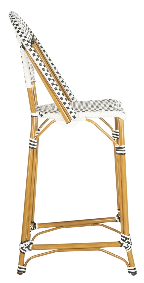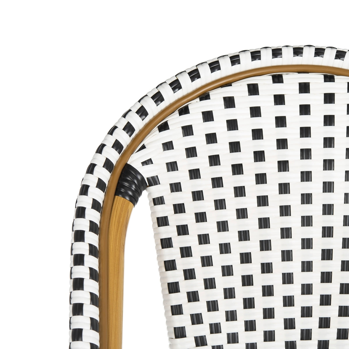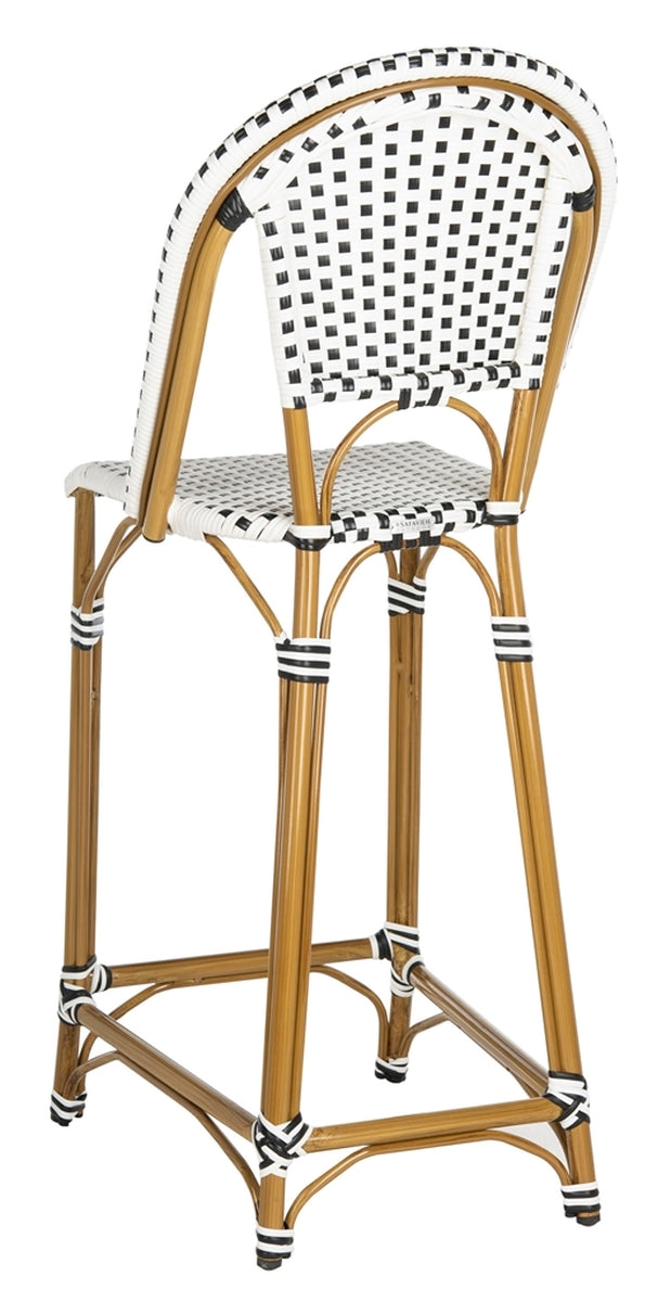 The beloved European bistro chair assumes a coastal update in this black and white counter stool. The cheerfully woven PE wicker seat and back extends to the stylish wrap detailing on a classically styled brown frame.