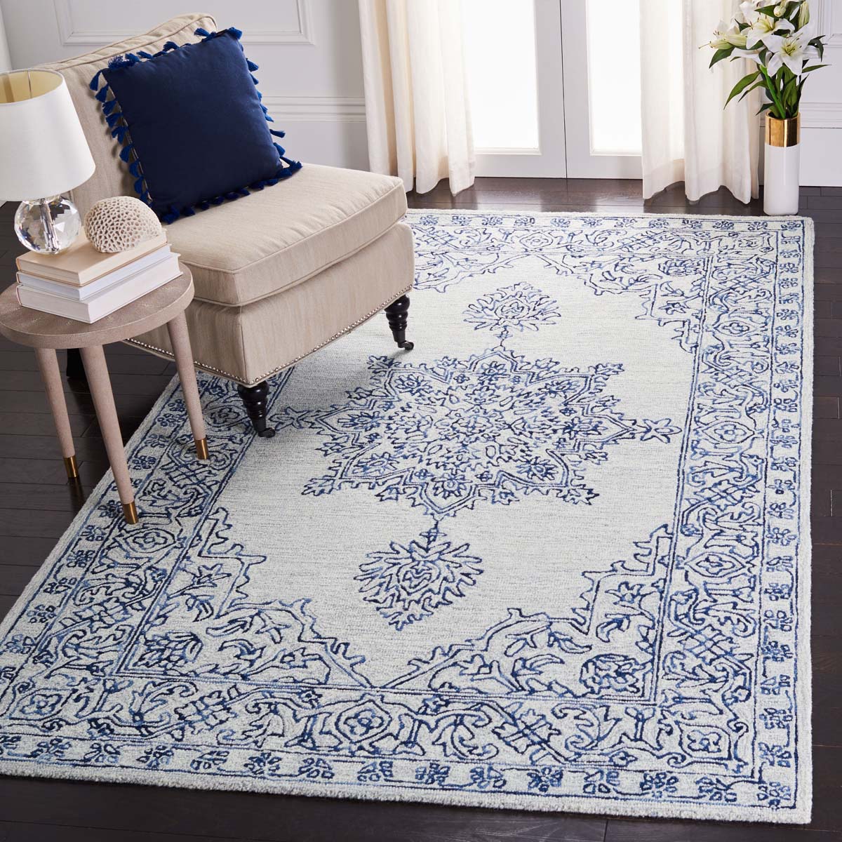 Introducing a timeless addition to your home, this exquisite rug is an elegant blend of ivory and blue shades. Its oriental pattern pays homage to traditional style, making it a centerpiece in any room. Skillfully hand tufted in India, this wool marvel offers a soft texture underfoot, crafted with attention to detail. Measuring 3/8 inches in height, it provides a subtle yet impactful presence on your floor. Whether placed in a living room, bedroom, or study, this rug enhances your space with a classic charm that blends seamlessly with various decor styles. Elevate your surroundings with a touch of artistry and warmth that invites comfort and sophistication.