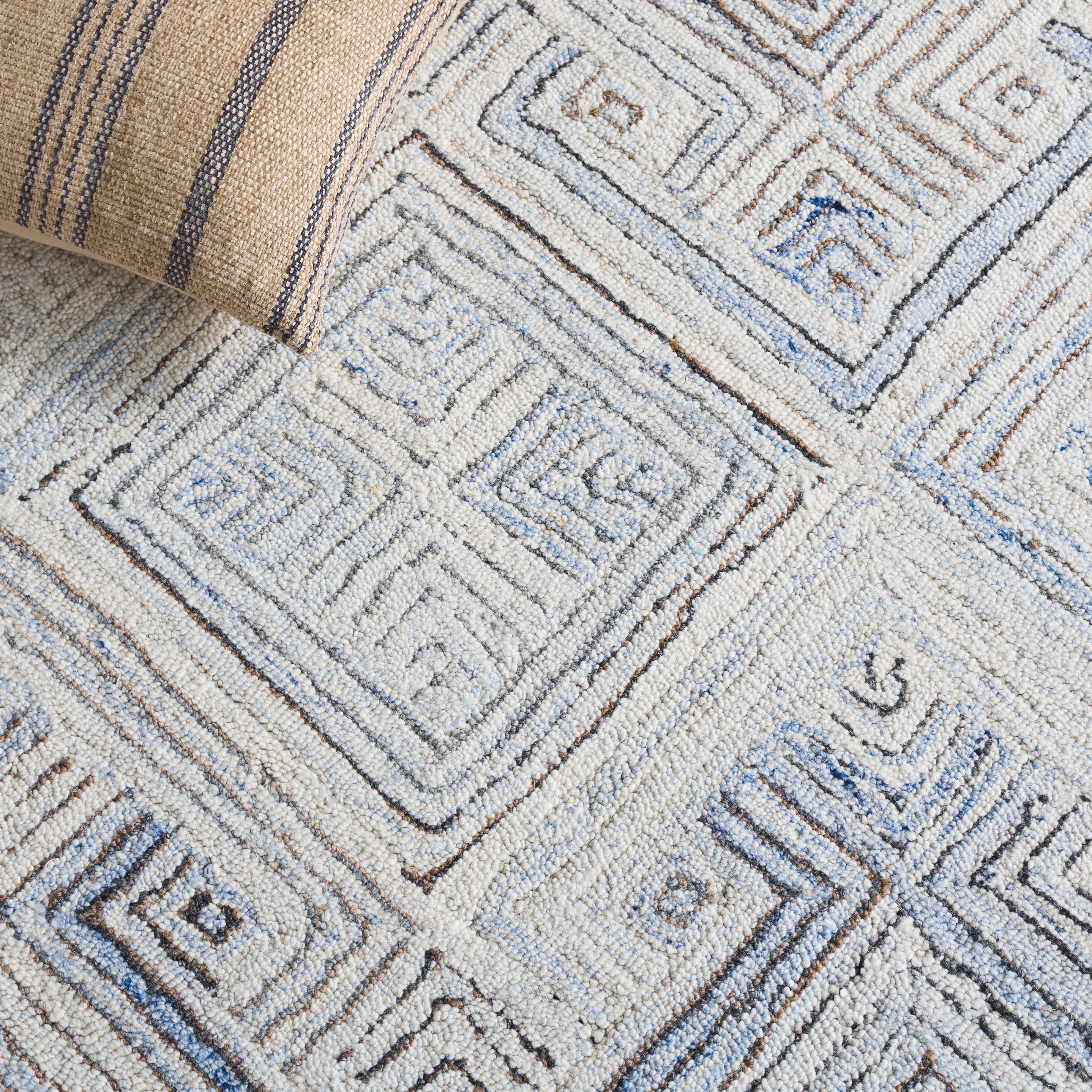 Elevate your interior decor with this exquisite area rug, beautifully hand-tufted in India. Constructed with a luxuriously soft wool pile, this rug boasts a comfortable 1/2'' height, offering a plush surface for your feet. The natural and grey tones bring an understated elegance to any room, seamlessly blending with various color palettes.