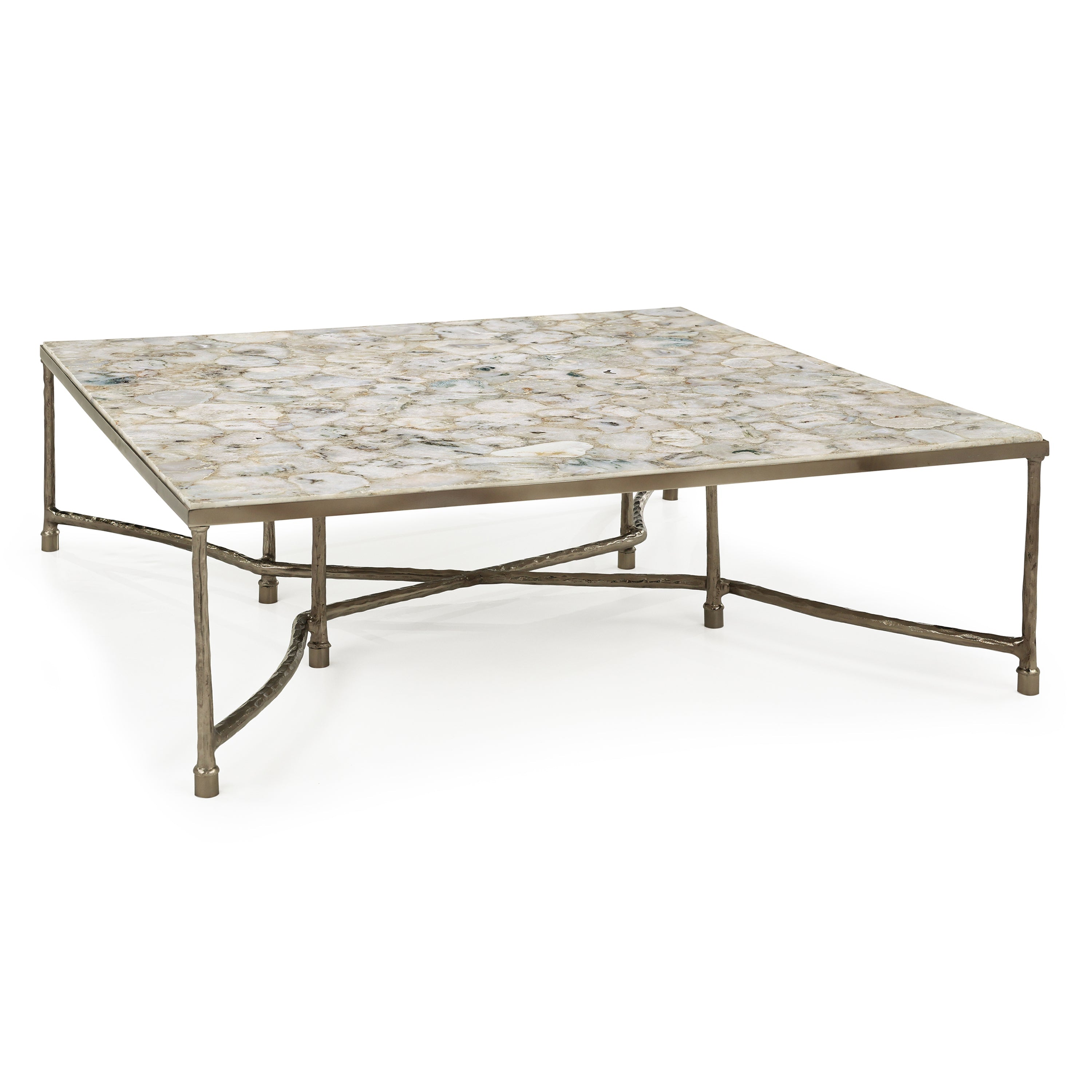 The Artigas Cocktail Table seamlessly blends natural materials and exotic tones. The slender frame is constructed with a combination of straight and curved aluminum rods in a Bronzed finish, creating an architectural look. The surface is a rectangular cut of natural white agate stone, pairing beautifully with the dark metallic hues to complete the look.